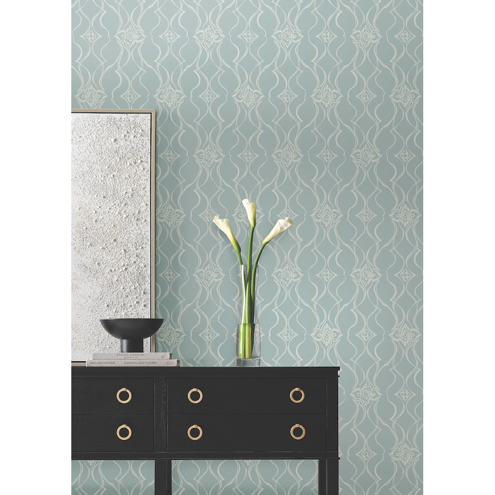 The stylized sketched damask Pirouette dances and spins a classic design into contemporary artistic motion with a glamourous touch of sparkling white and spa blue. This Pirouette Wallpaper measures approximately 27 inches wide by 27 feet long, measuring approximately 60.8 square feet per roll.
