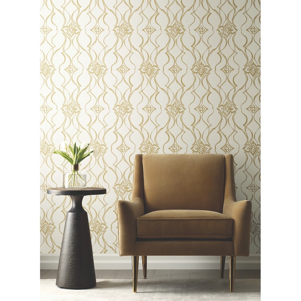 The stylized sketched damask Pirouette dances and spins a classic design into contemporary artistic motion with a glamourous touch of sparkling metallic, featured here in white with gold. This Pirouette Wallpaper measures approximately 27 inches wide by 27 feet long, measuring approximately 60.8 square feet per roll.