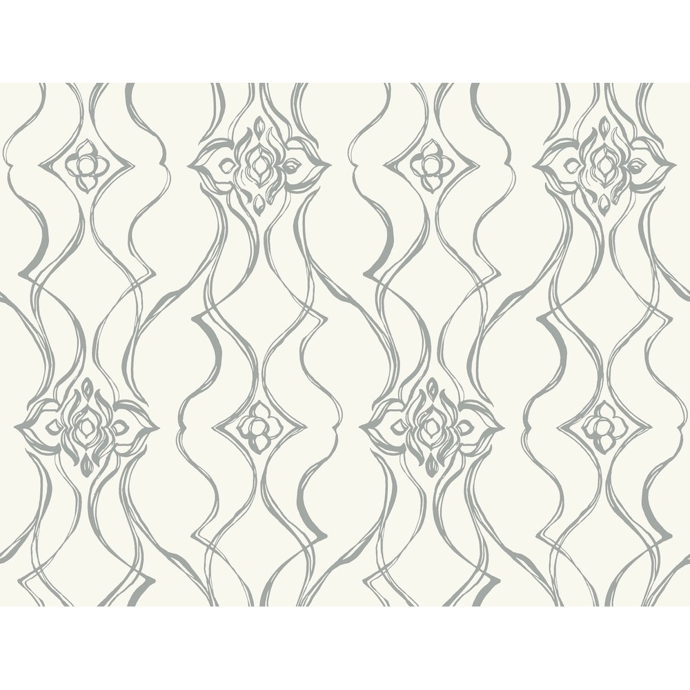 The stylized sketched damask Pirouette dances and spins a classic design into contemporary artistic motion with a glamourous touch of sparkling metallic, featured featured here in white with silver. This Pirouette Wallpaper measures approximately 27 inches wide by 27 feet long, measuring approximately 60.8 square feet per roll.