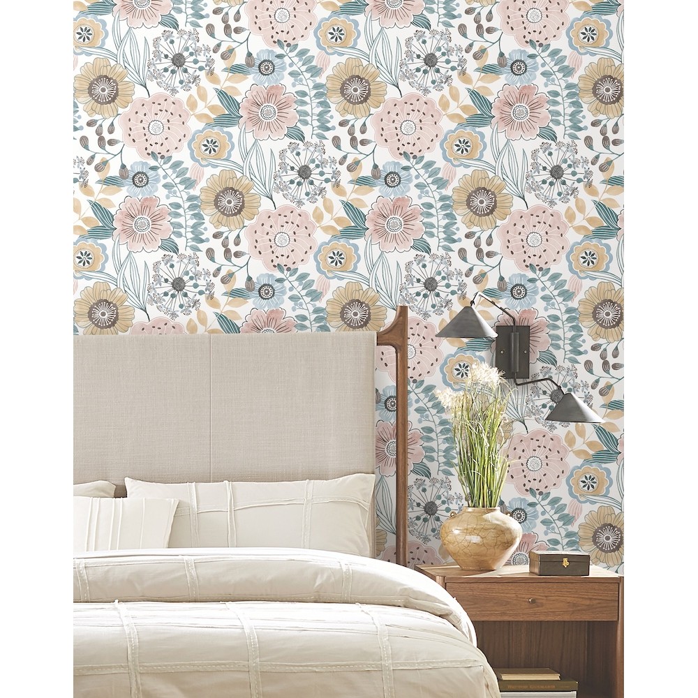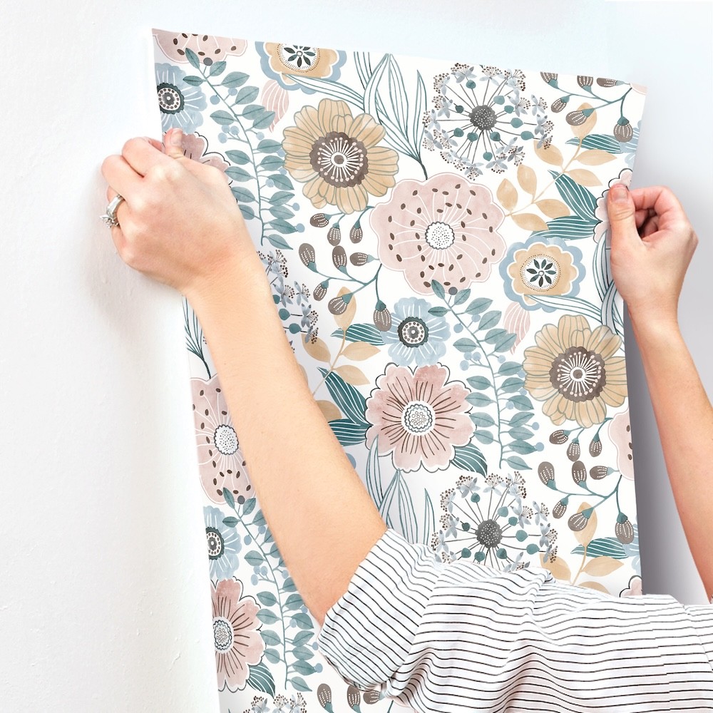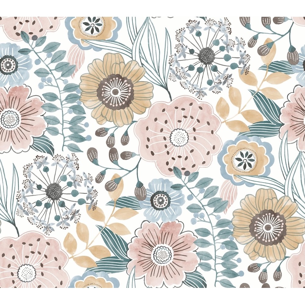 The whimsical nature of Artistic Bouquet's assortment of wildflowers and greenery is beautifully emphasized by the pattern's watercolor finishes. Featured here in a palette of muted tangerine, teal, blue, pink, and brown. This Artistic Bouquet Wallpaper measures approximately 27 inches wide by 27 feet long, measuring approximately 60.8 square feet per roll.