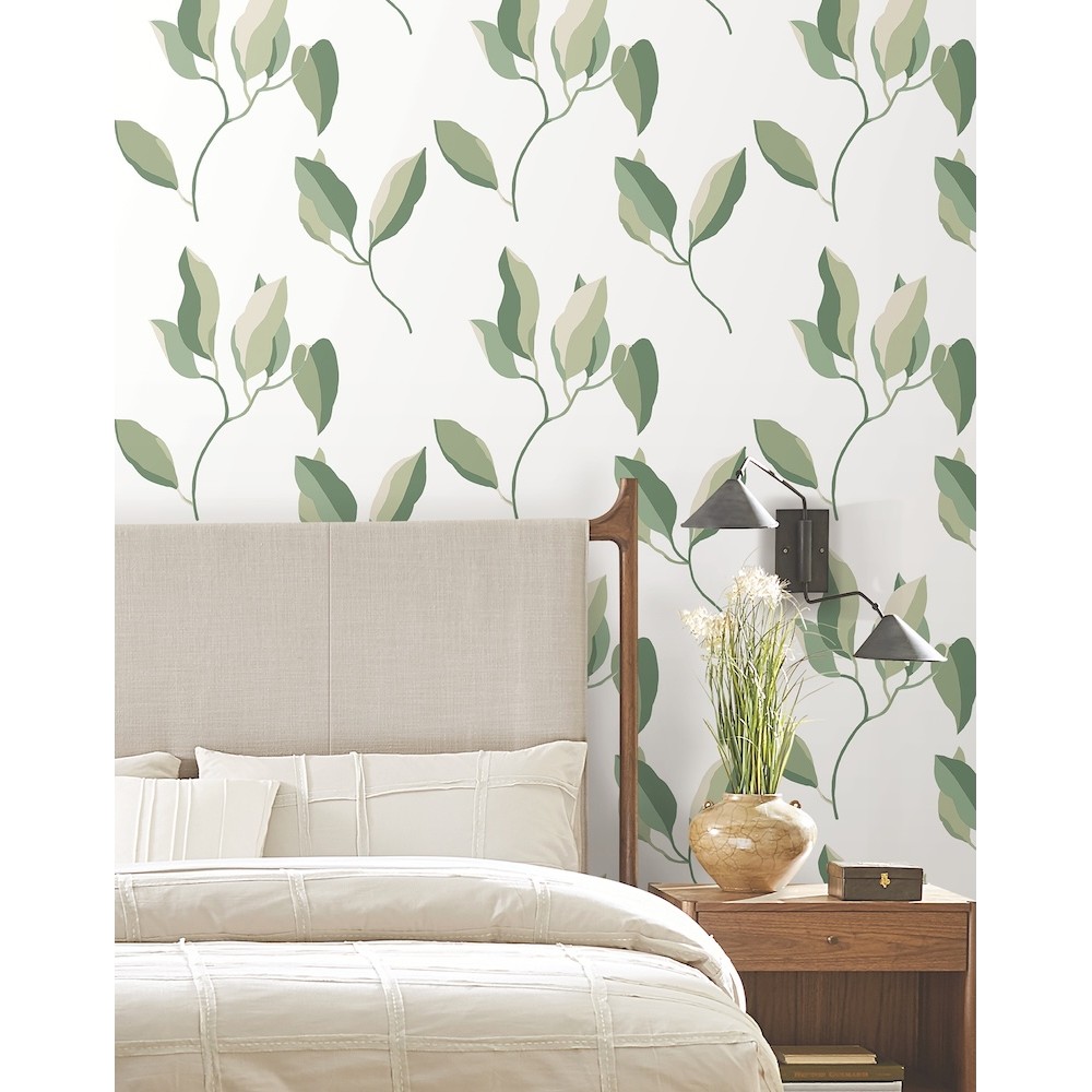 Rich color blocking emphasizes the fluidity of form in pattern Brushwork Branches. Featured here in shades of green accented by beige. This Brushwork Branches Wallpaper measures approximately 27 inches wide by 27 feet long, measuring approximately 60.8 square feet per roll.