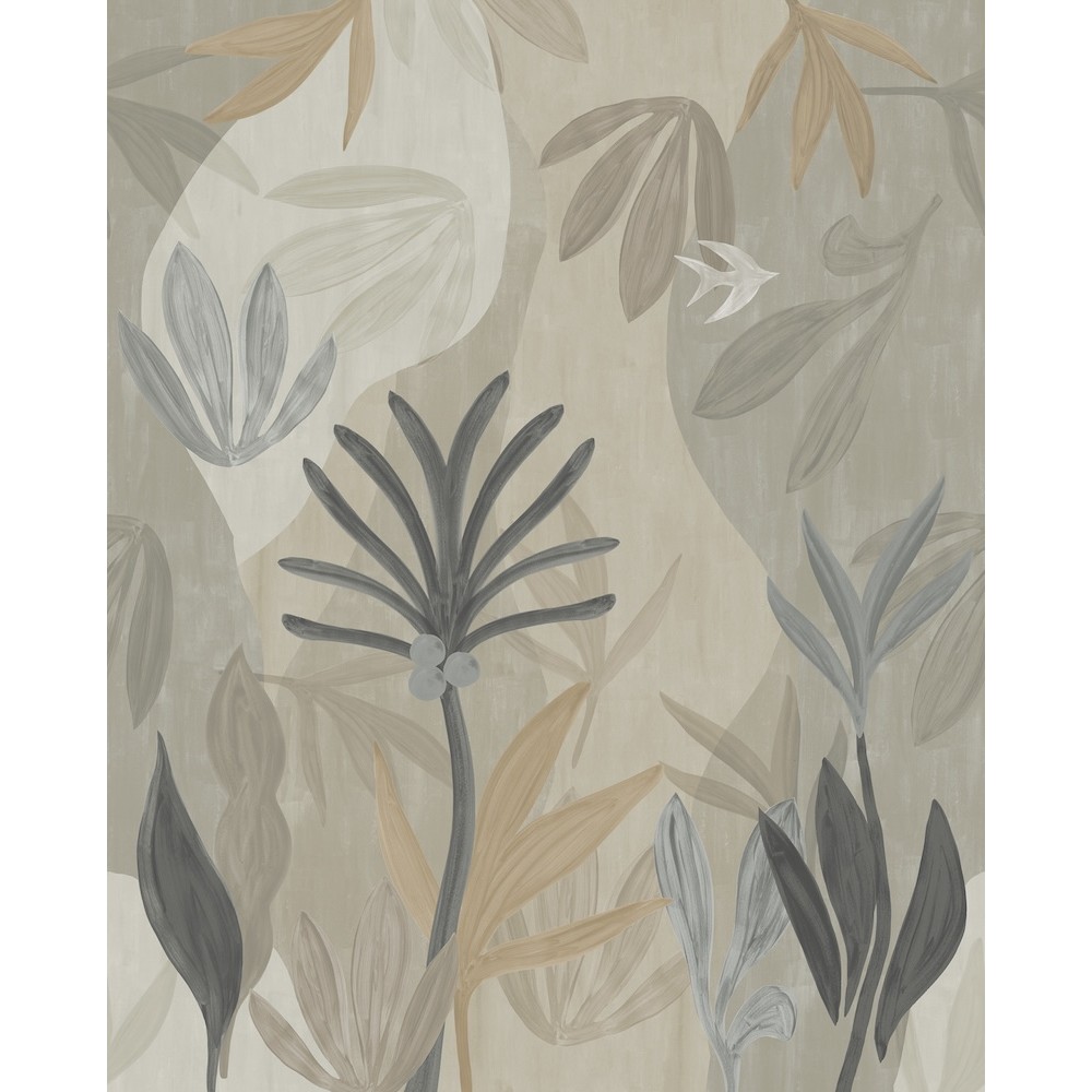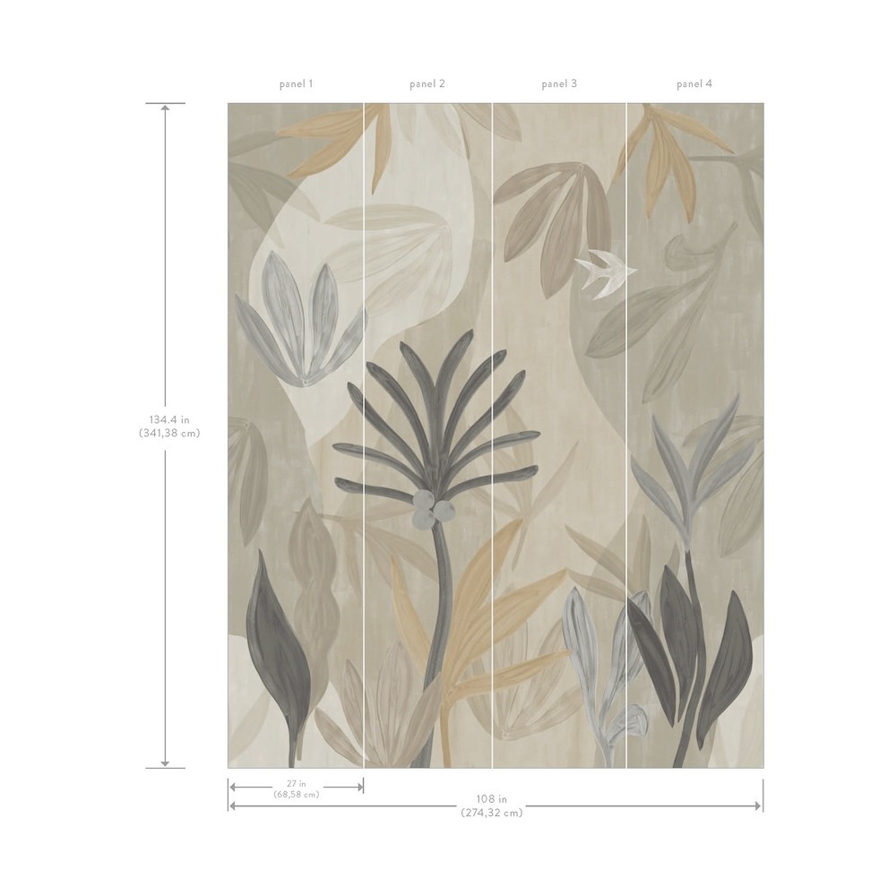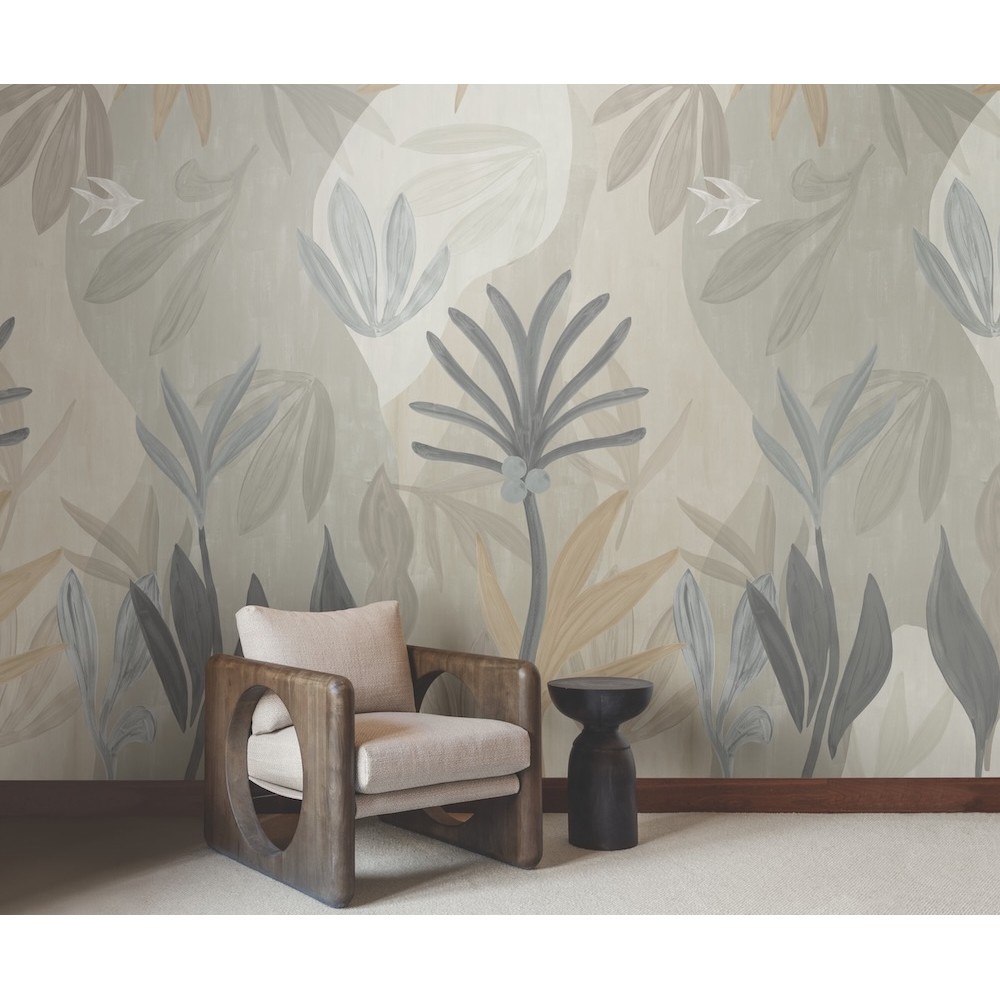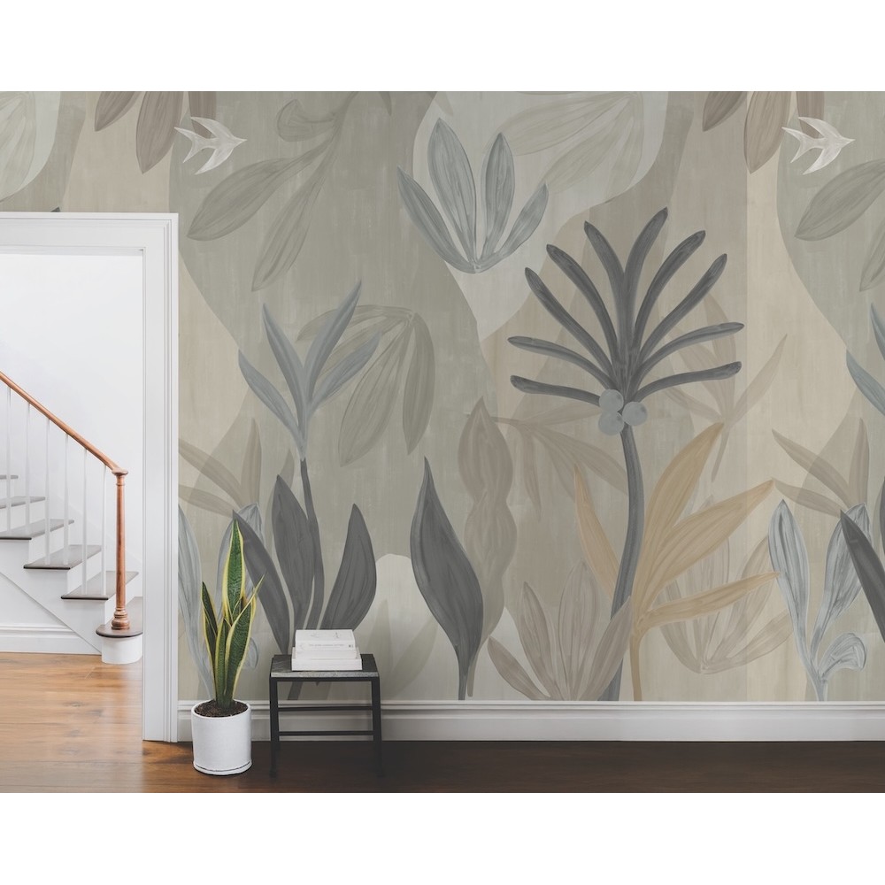 Chambord Gardens' lush tropical flora is infused with energy from its expressive, painterly stylings. The mural is seen here in a palette of greys and beige. This Chambord Gardens Wall Mural measures approximately 9-ft wide by 11.2-ft tall when assembled.