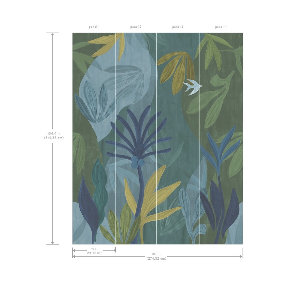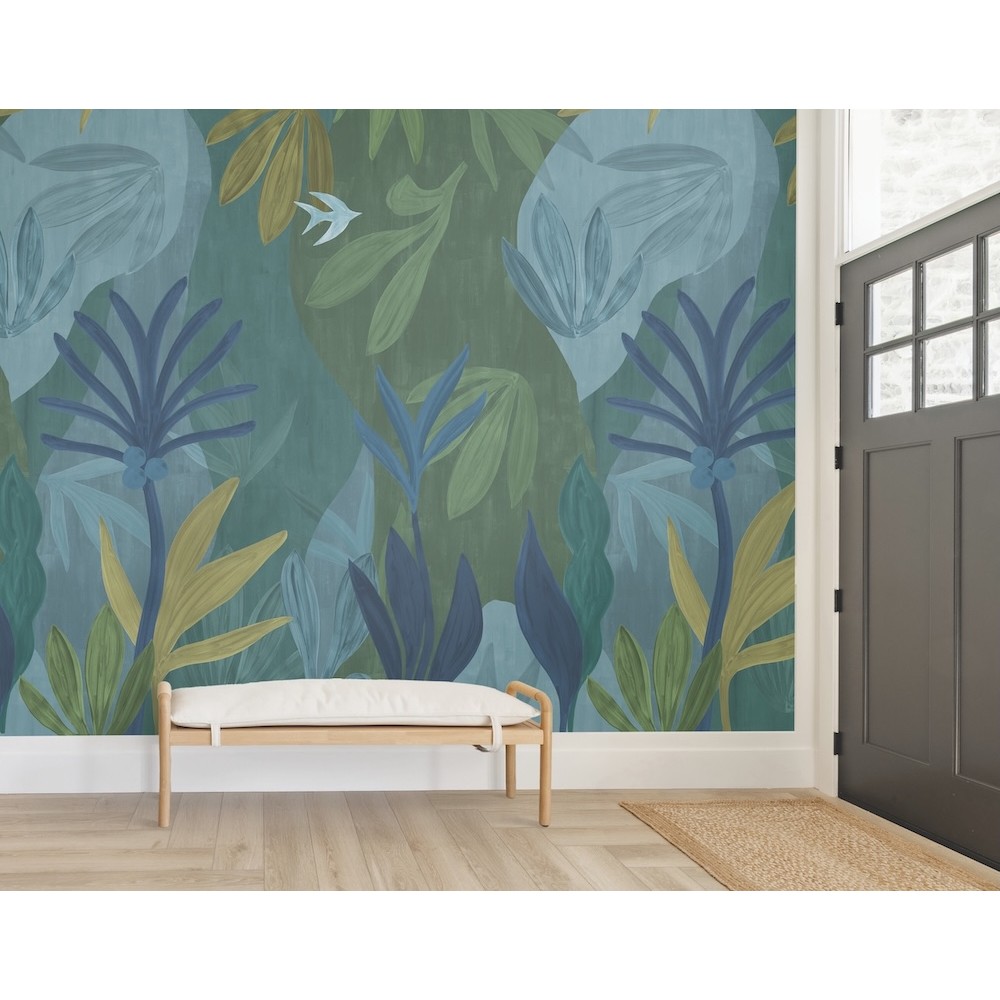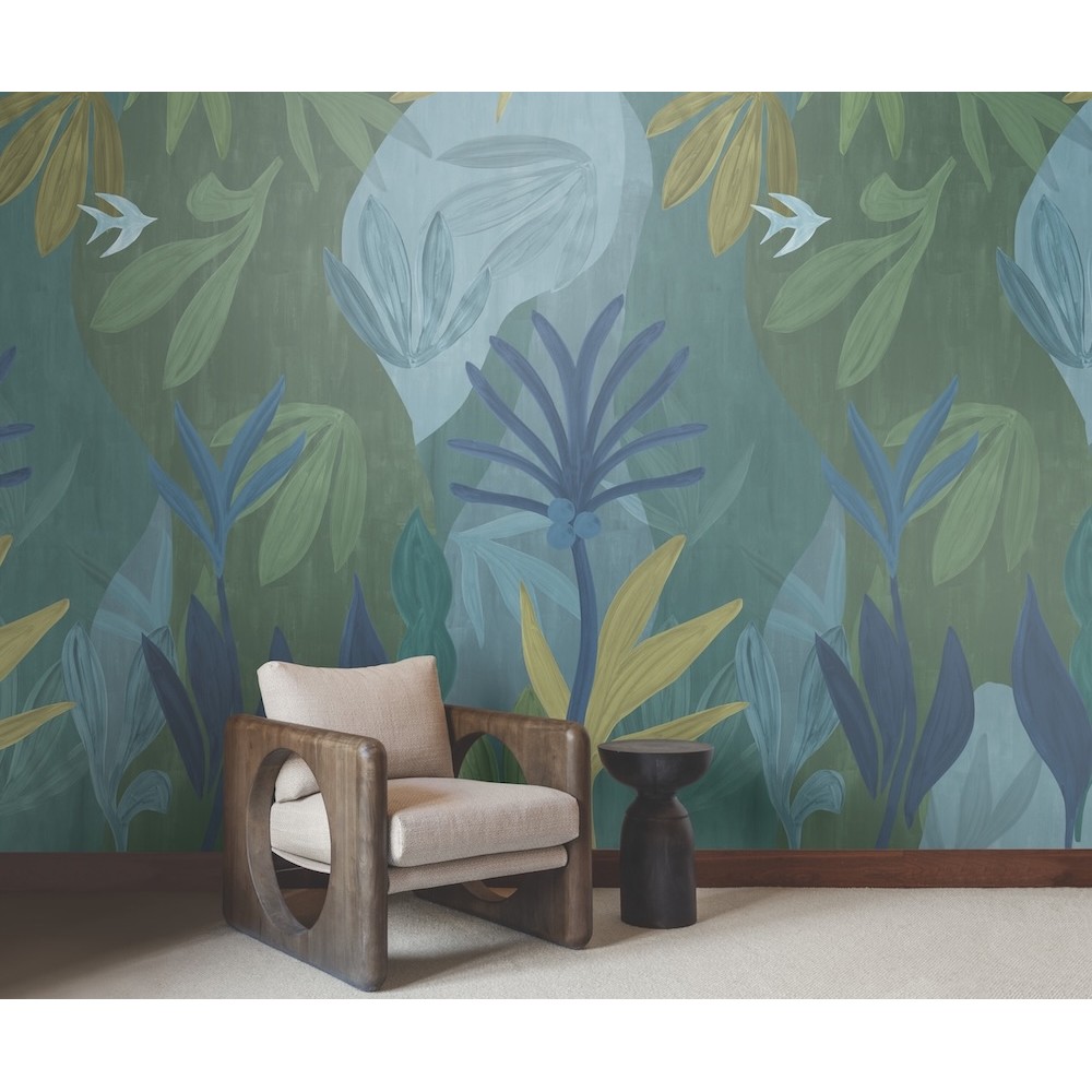 Chambord Gardens' lush tropical flora is infused with energy from its expressive, painterly stylings. The mural is seen here in a rich palette of blues, greens, and chartreuse. This Chambord Gardens Wall Mural measures approximately 9-ft wide by 11.2-ft tall when assembled.