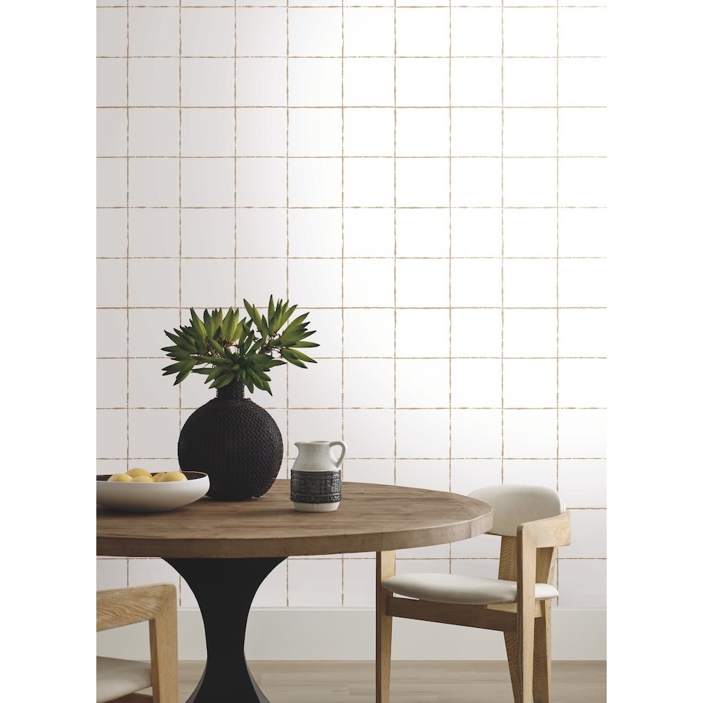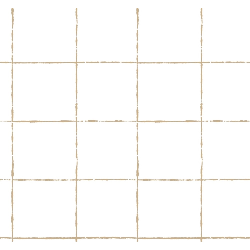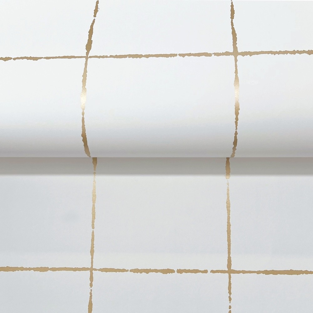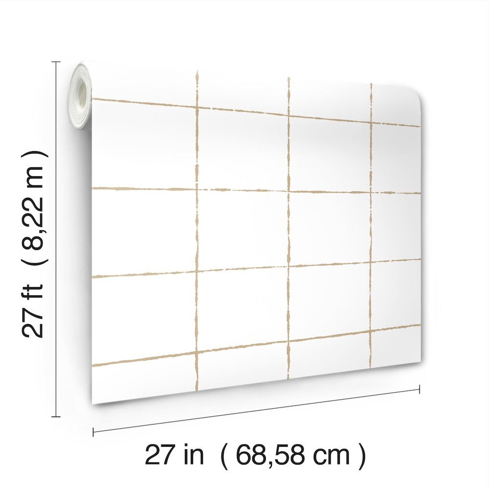 "La Vitre Plaid offers a minimalistic take on the iconic pattern's line density counterbalanced with elevated finishes to said markings. Featured here with metallic gold lines against white. This La Vitre Plaid Wallpaper measures approximately 27 inches wide by 27 feet long, measuring approximately 60.8 square feet per roll.