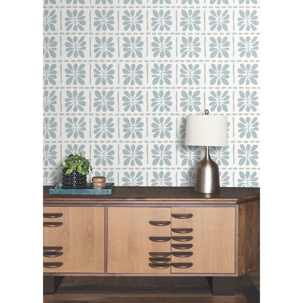 Abstracted flowers are framed by stitched lines, giving pattern Mimosa Fleur a quilted aesthetic with artistic flair. Featured here in a palette of light blue, sage, and white. This Mimosa Fleur Wallpaper measures approximately 27 inches wide by 27 feet long, measuring approximately 60.8 square feet per roll.