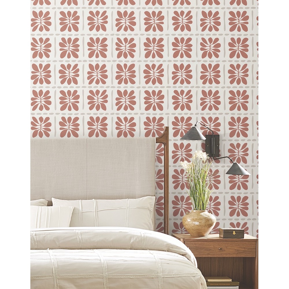 Abstracted flowers are framed by stitched lines, giving pattern Mimosa Fleur a quilted aesthetic with artistic flair. Featured here in a palette of vermillion, light grey, and white. This Mimosa Fleur Wallpaper measures approximately 27 inches wide by 27 feet long, measuring approximately 60.8 square feet per roll.