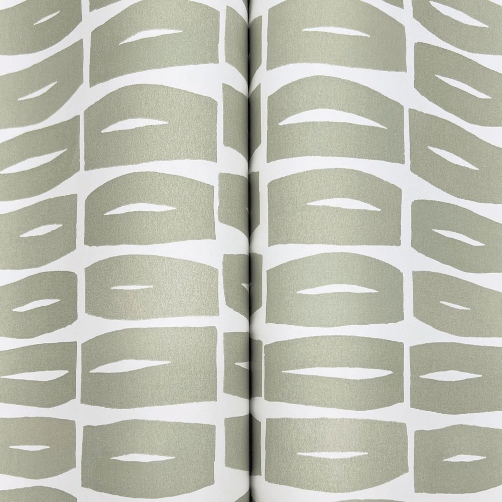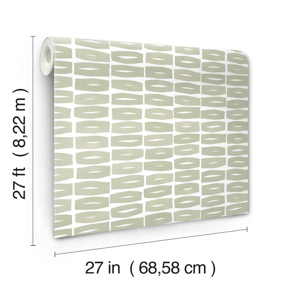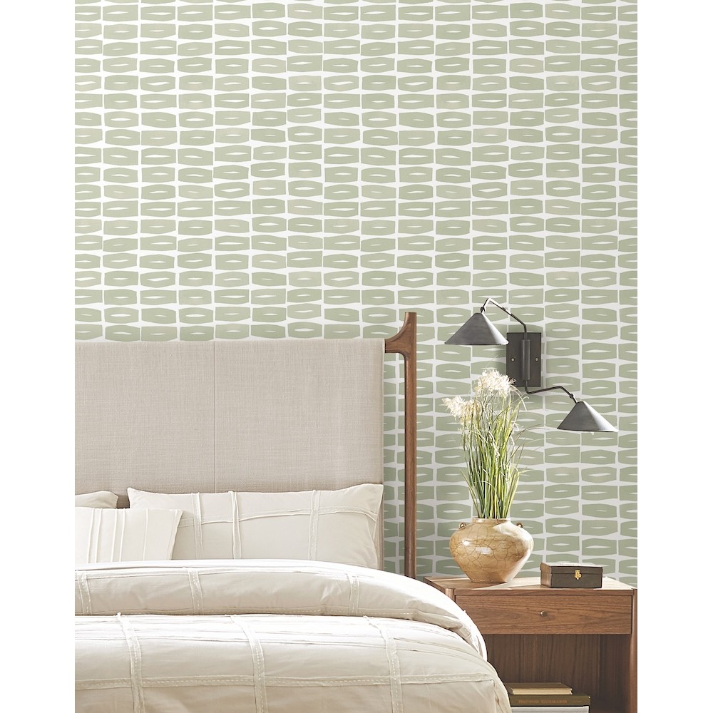 The organically shaped rectangular rings of Modernist Motif offer a facade reminiscent of both tiling and woven accents. Featured here in light green against white. This Modernist Motif Wallpaper measures approximately 27 inches wide by 27 feet long, measuring approximately 60.8 square feet per roll.
