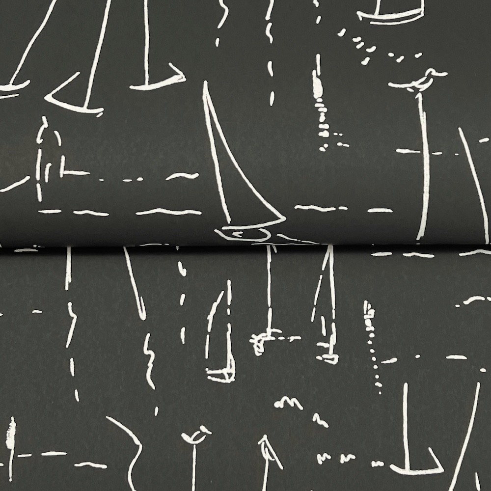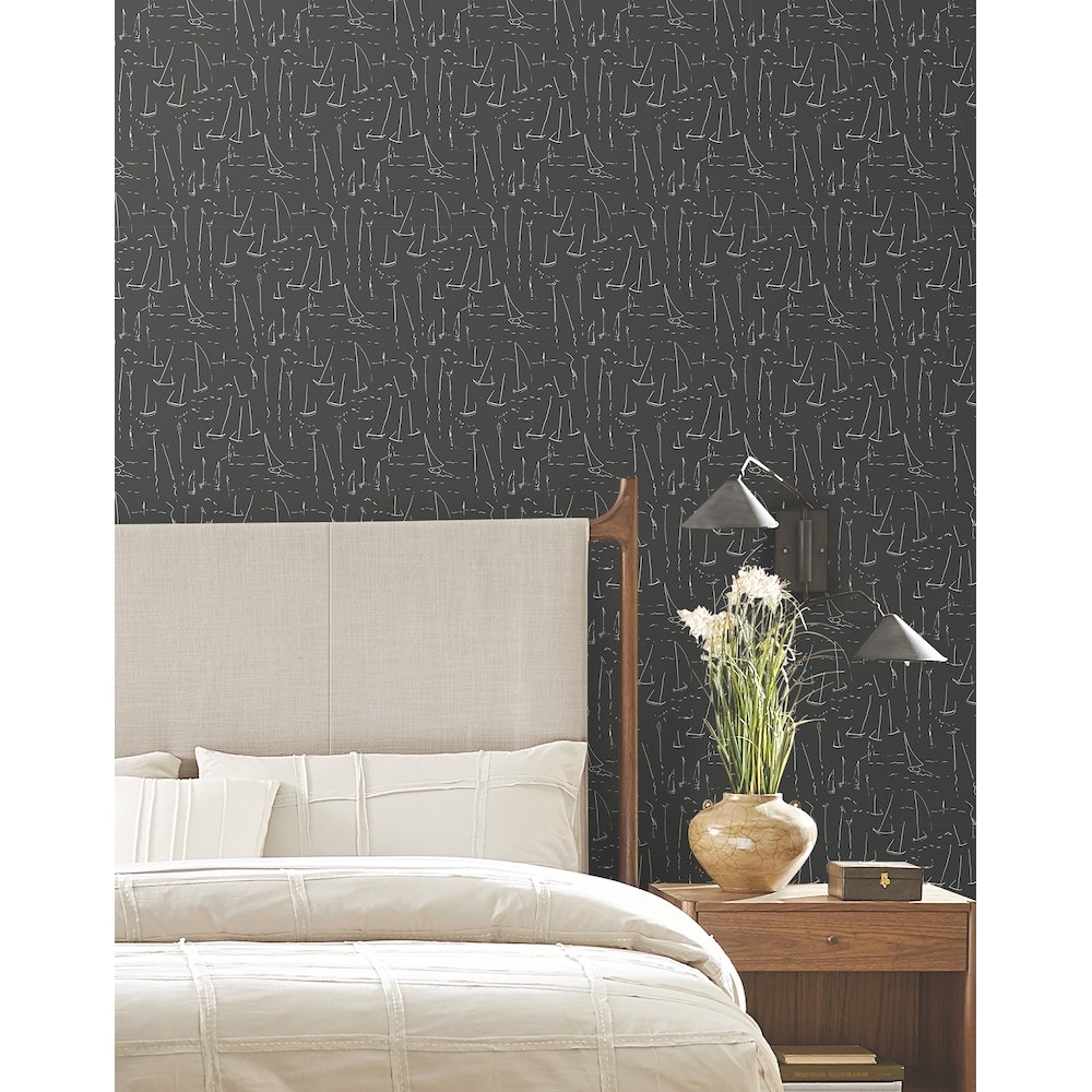 The minimalistic outlines of Vermillion Coast's seafaring sailboats offer a whimsical evolution of nautical themes. Featured here in white against black. This Vermillion Coast Wallpaper measures approximately 27 inches wide by 27 feet long, measuring approximately 60.8 square feet per roll.