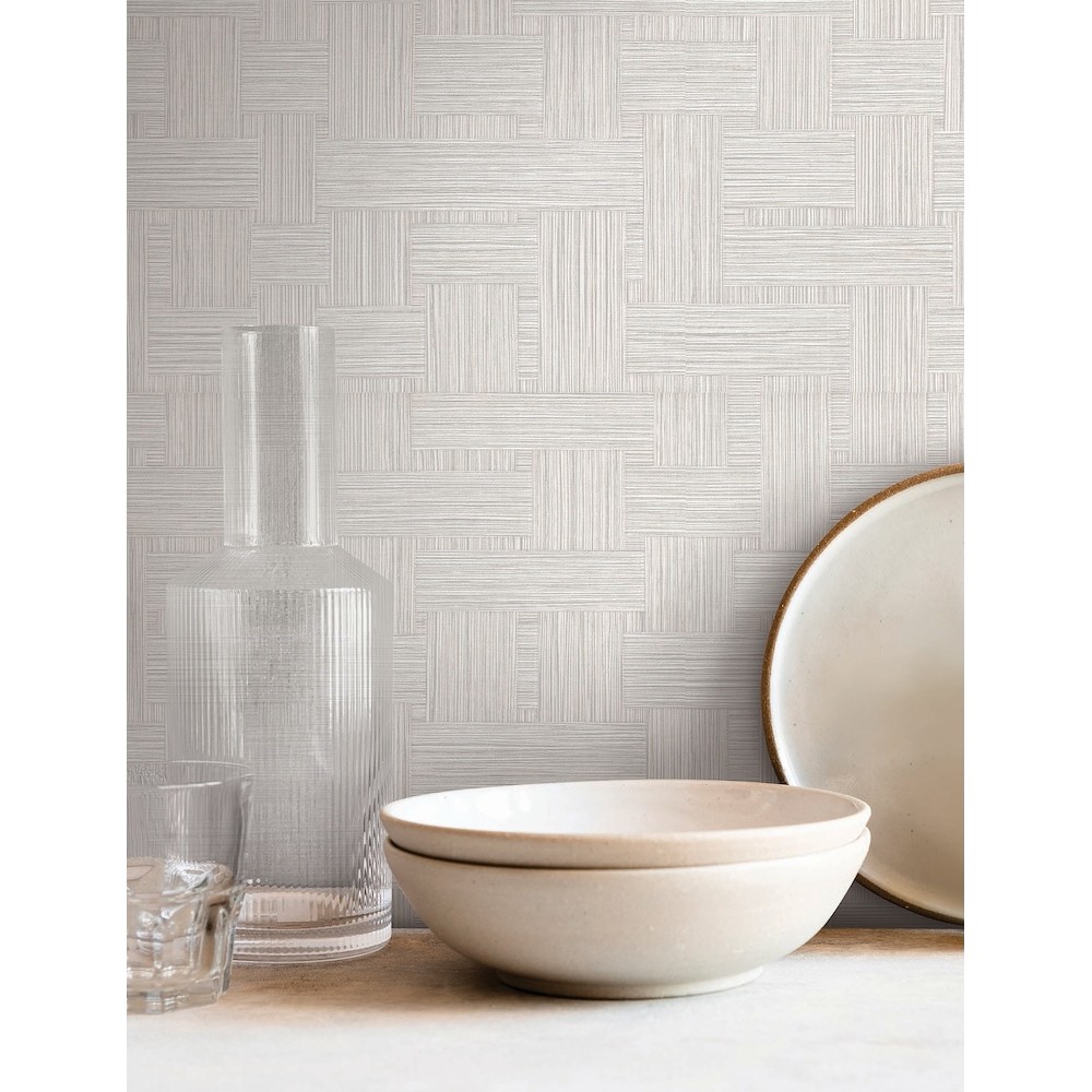 Basketry utilizes long strips of small, textural lines to form the structure of an oversized basket weave, melding artistry and craftsmanship. Featured here in warm gray.