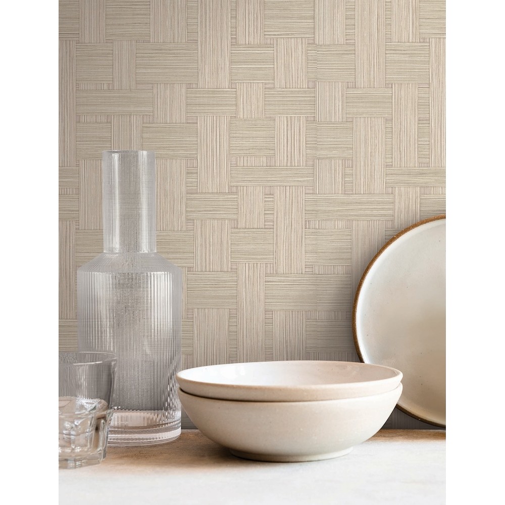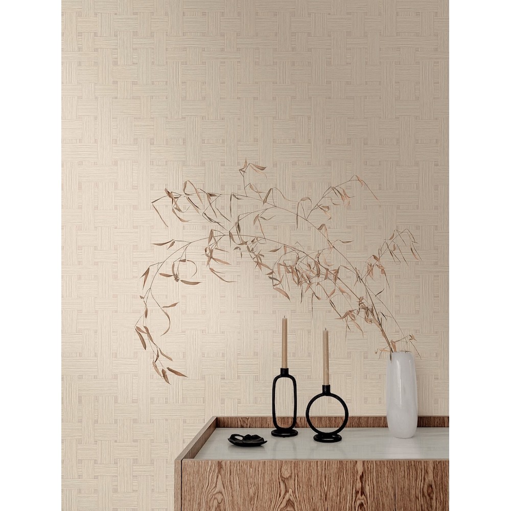 Basketry utilizes long strips of small, textural lines to form the structure of an oversized basket weave, melding artistry and craftsmanship. Featured here in wheat.