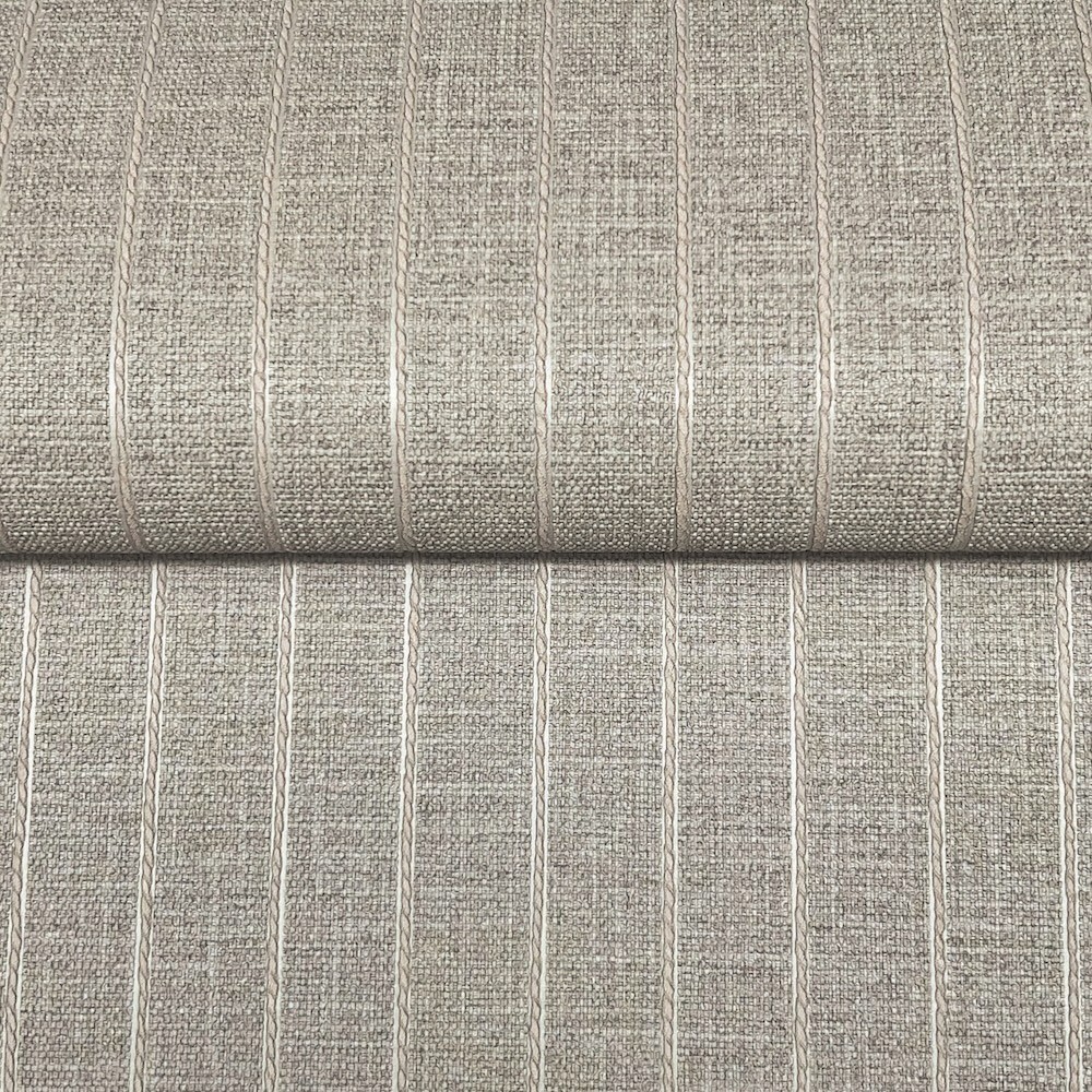 Vertical twisted trim in the pattern Cording Stripe adds texture to its woven canvas, creating a blend of classic and cottage styles. Featured here in pearlescent and smoke gray. This Cording Stripe Wallpaper measures approximately 20.9 inches wide by 33 feet long, measuring approximately 57.5 square feet per roll.