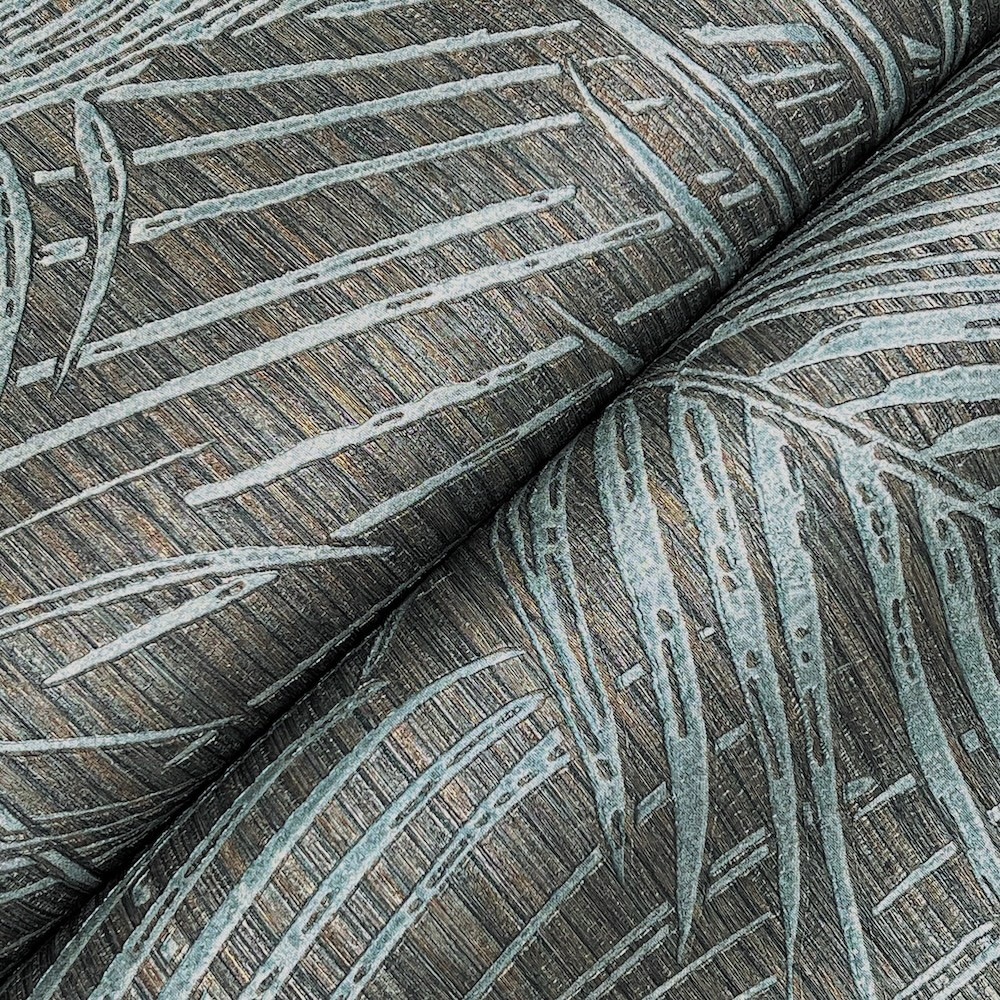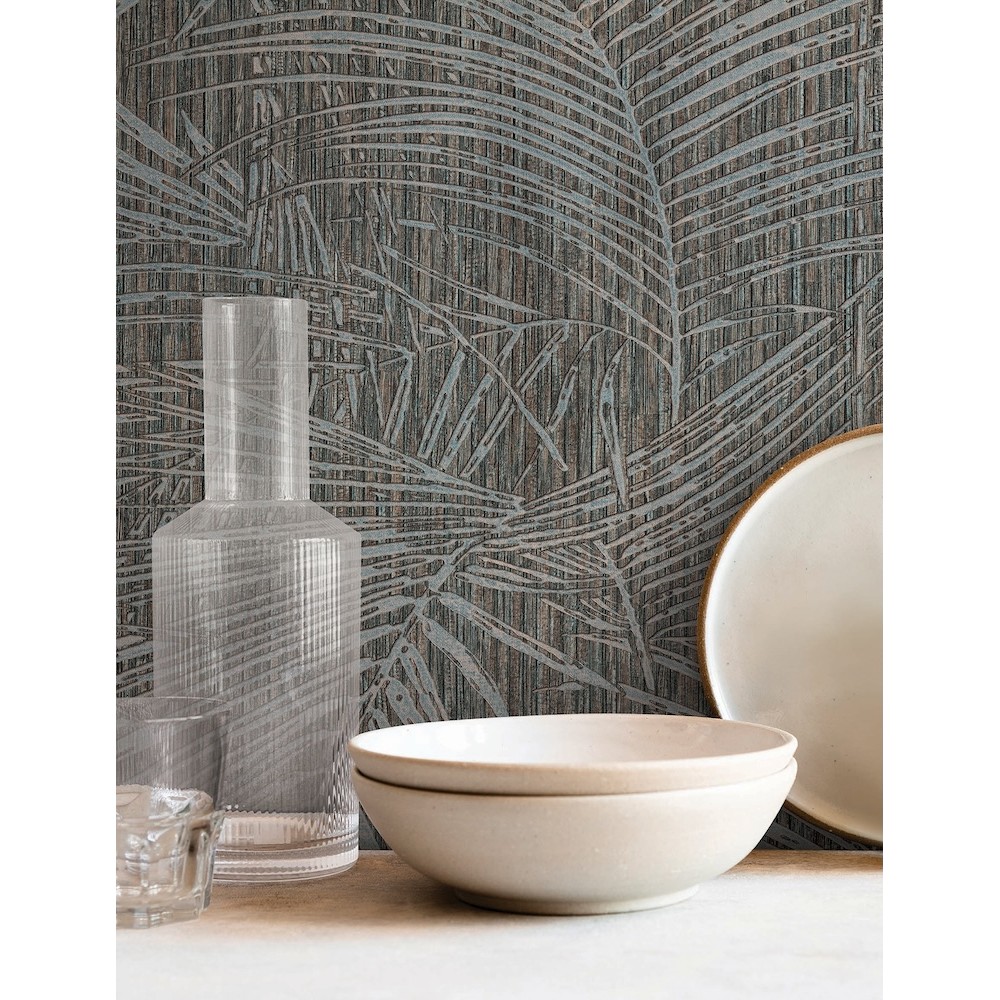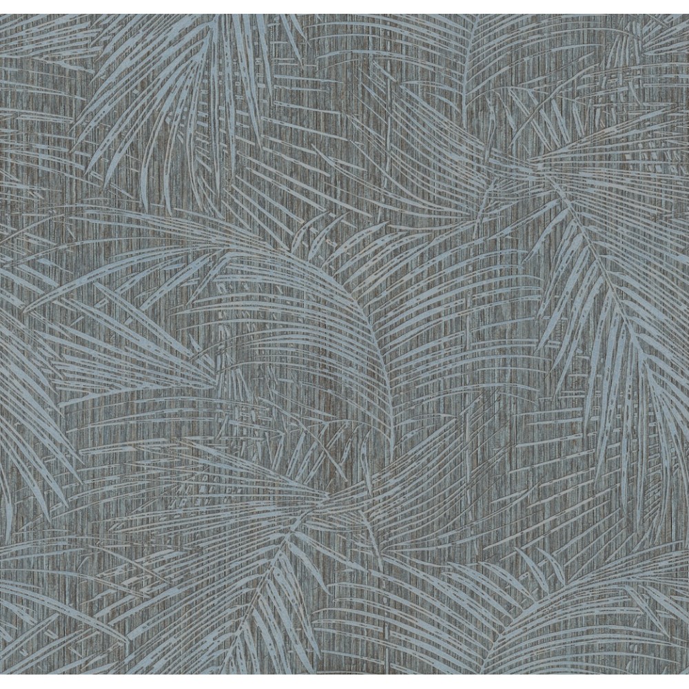 The deeply etched fronds of Della Palm transform into a lush, contemporary canopy of leaves celebrating a luxury resort lifestyle. Featured here in blue, silver, and brushed brass metallic.