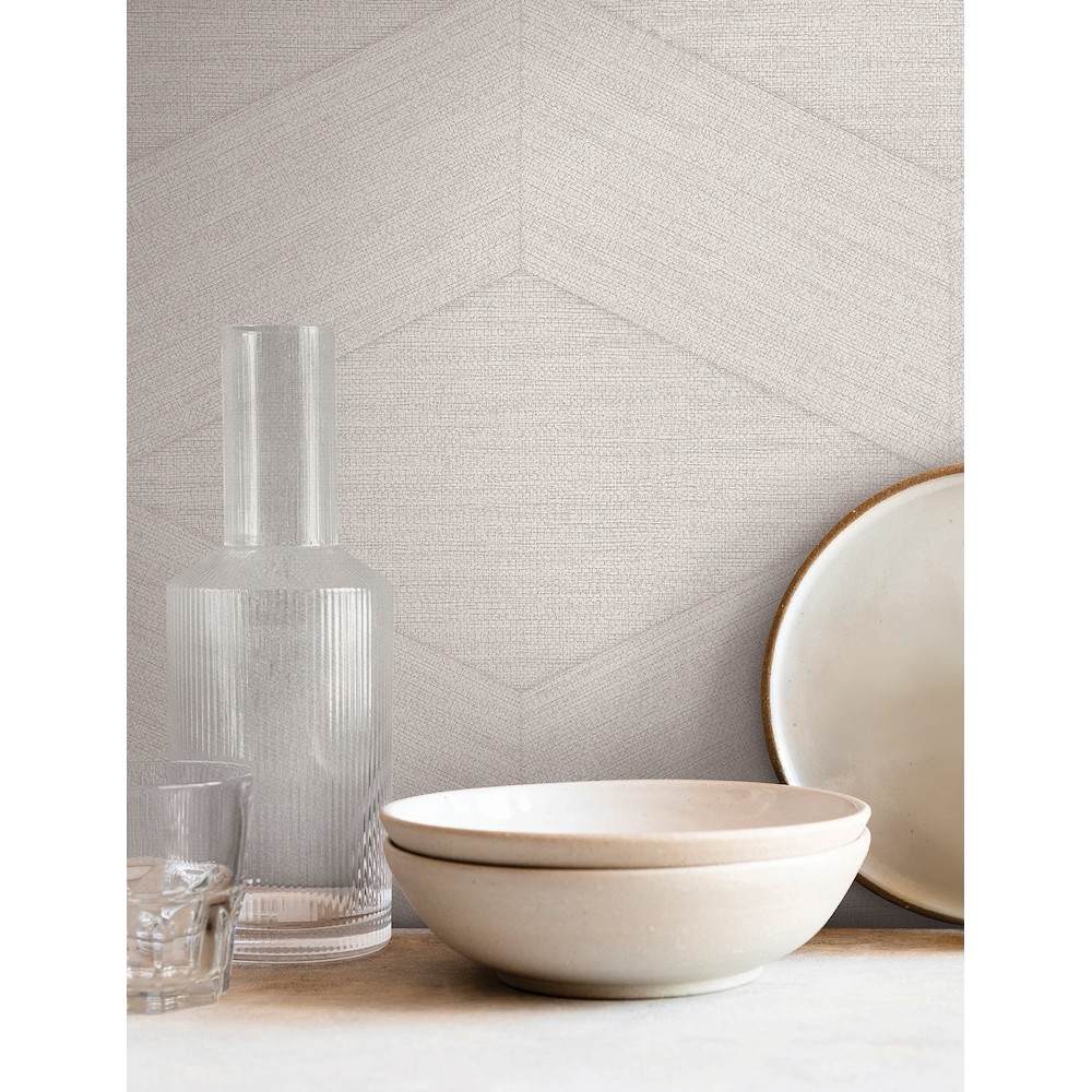 The horizontal lozenge chevron of Huntsman cuts a broad textural path within a regimental field of dimensional faux grass, seen here in warm gray.