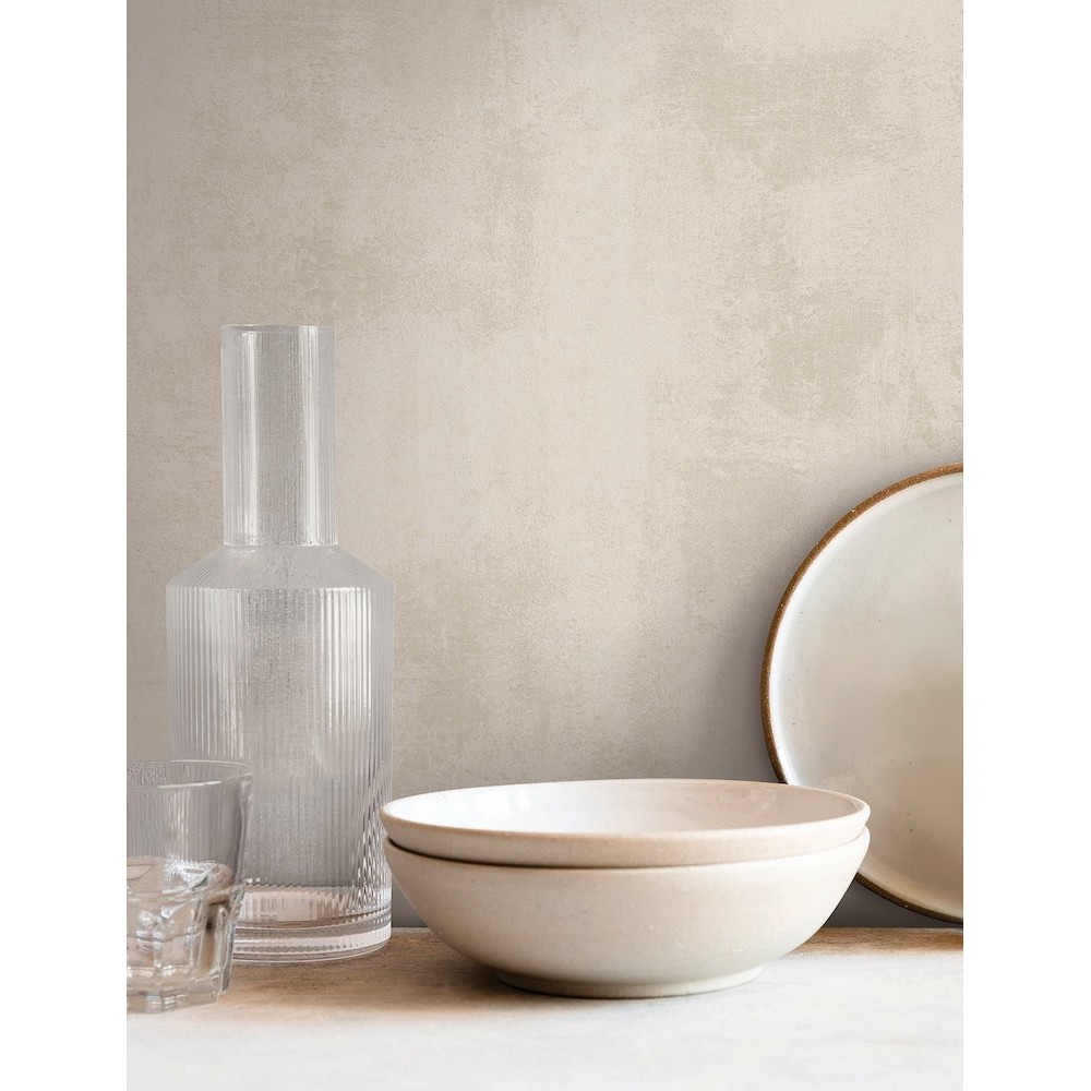 The distinctive, rugged texture of hand-troweled Italian plaster is reimagined with a luminous, modern shimmer. Featured here in natural beige.
