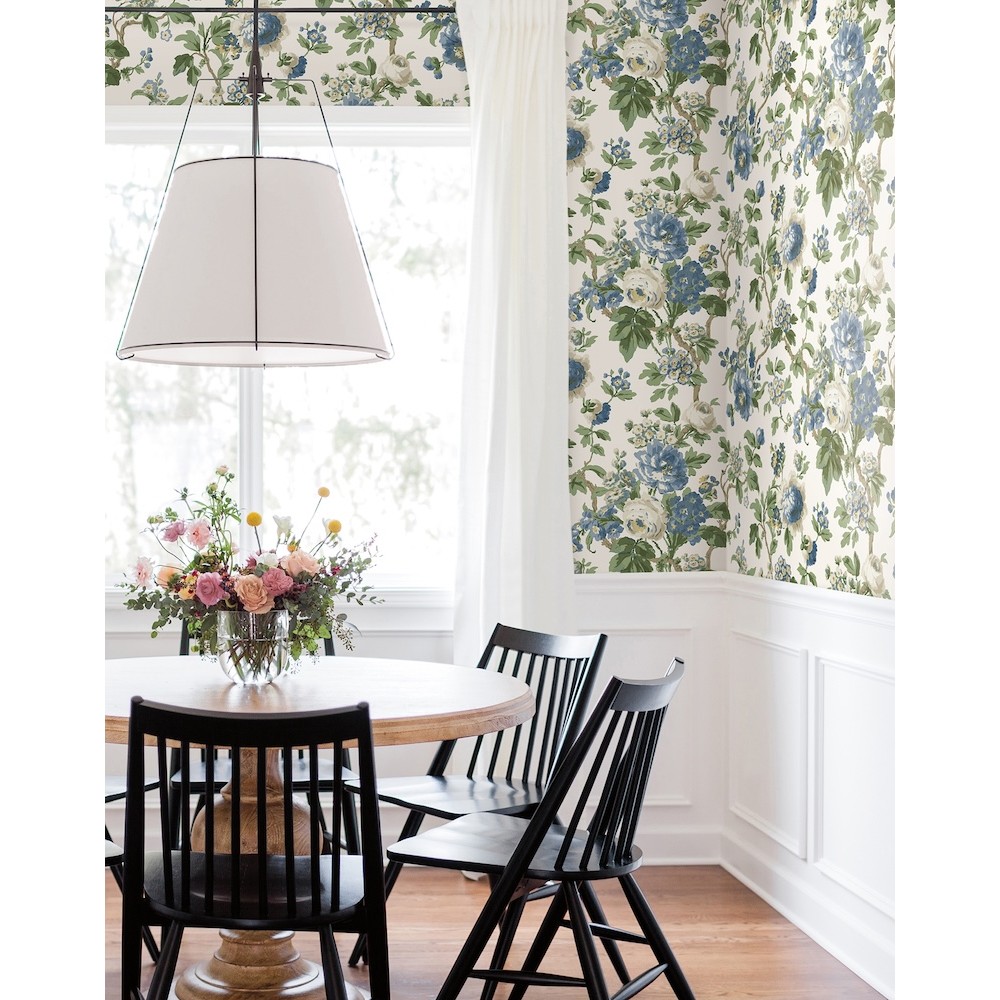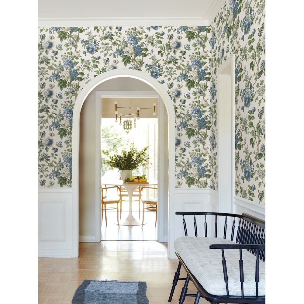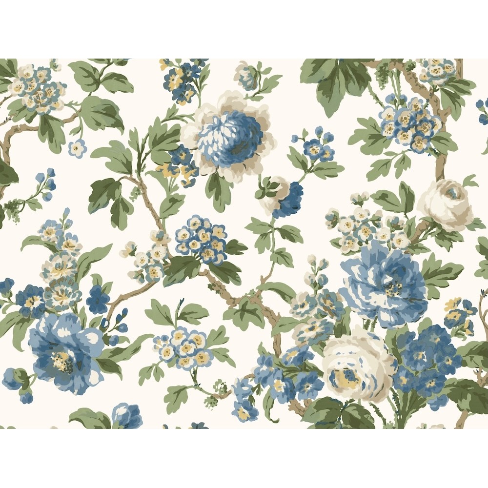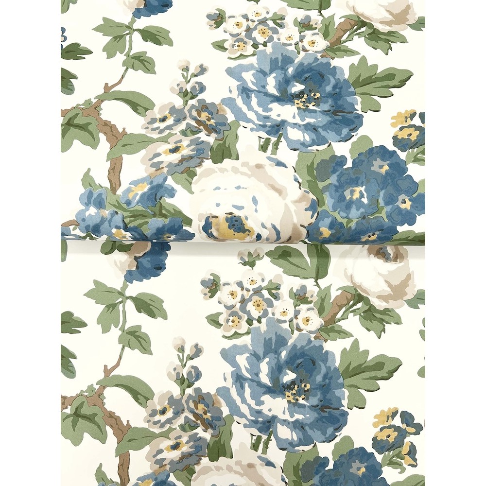 Many layers of color add depth and vibrancy to twining branches beautified by a variety of petite and voluminous blossoms in pattern Beatrix. Seen here in a palette of periwinkle, indigo, navy, teal, beige, taupe, cream, light and dark green, pale yellow, brown, and white. Beatrix is an unpasted, non woven wallpaper measuring 27 inches wide by 27 feet long, covering approximately 60.8 square feet per roll.