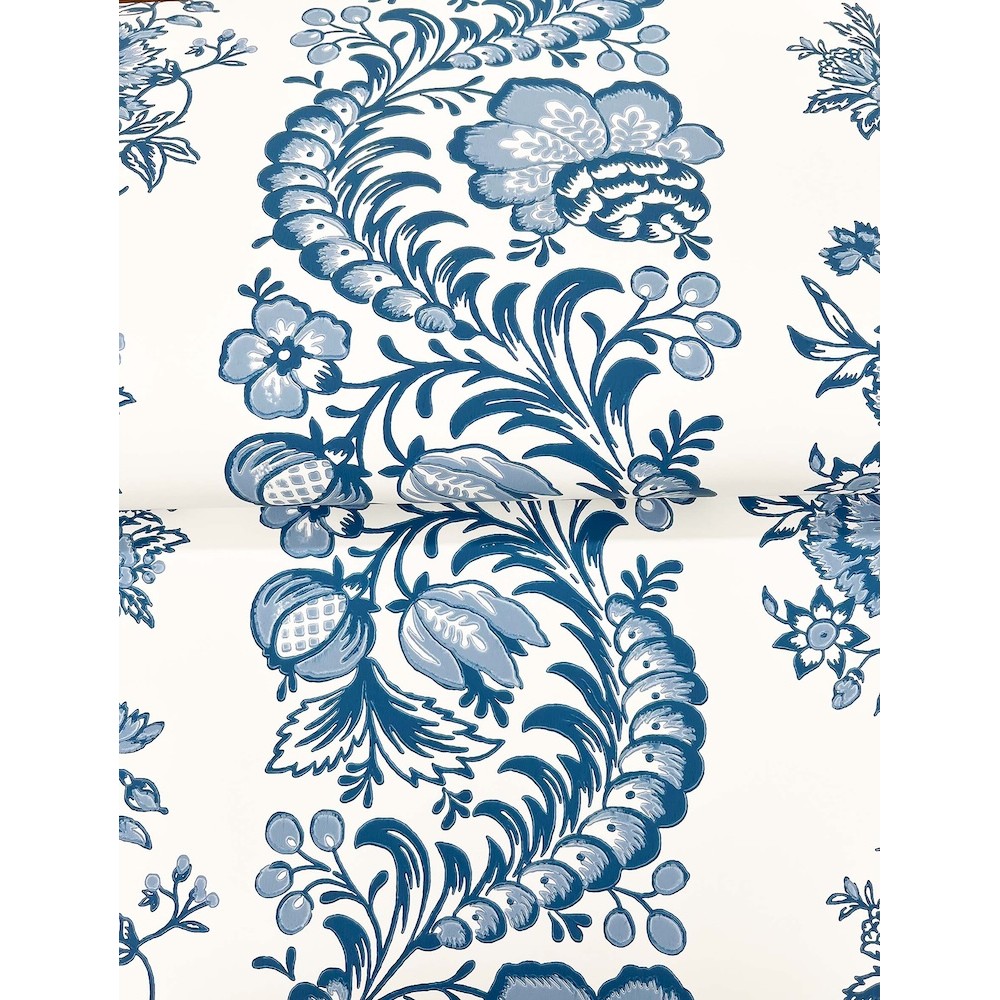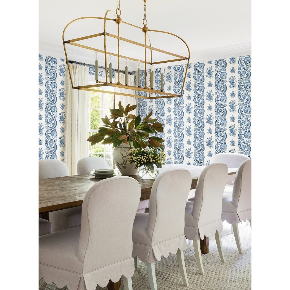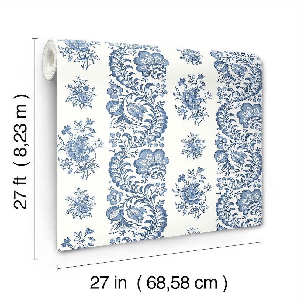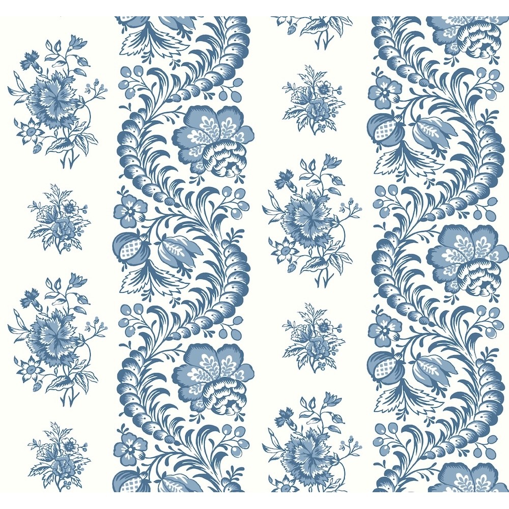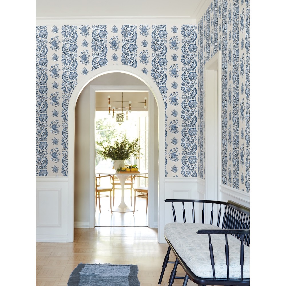 Pillars composed of winding, floral vines alternate with columns of dainty floral groupings in pattern Beaumont. Seen here in a palette of indigo and sky blue against a white backdrop imbued with linen detailing. Beaumont is an unpasted, non woven wallpaper measuring 27 inches wide by 27 feet long, covering approximately 60.8 square feet per roll.