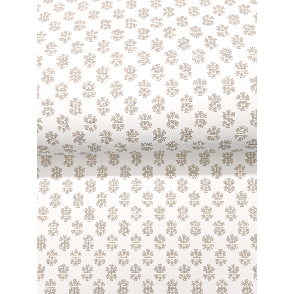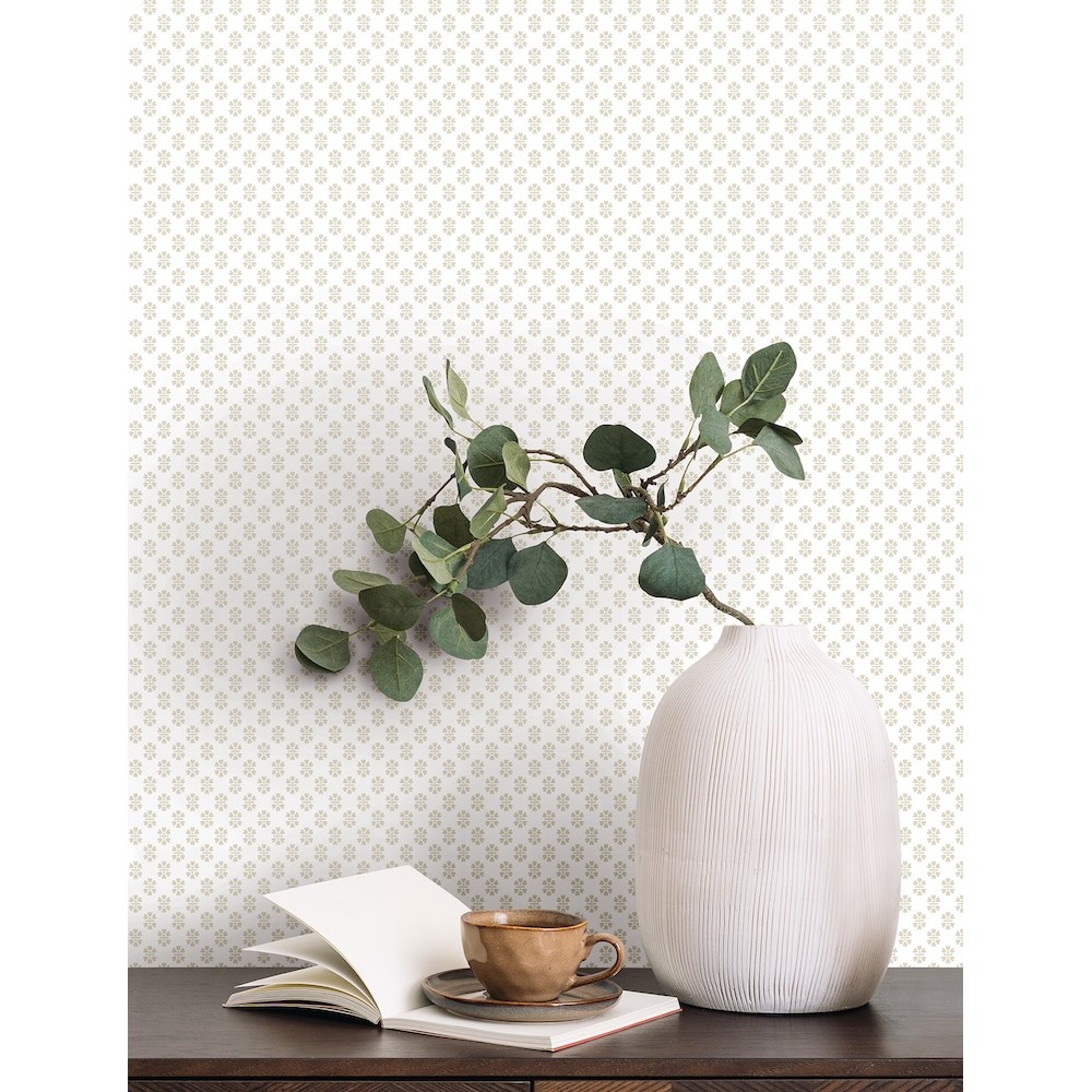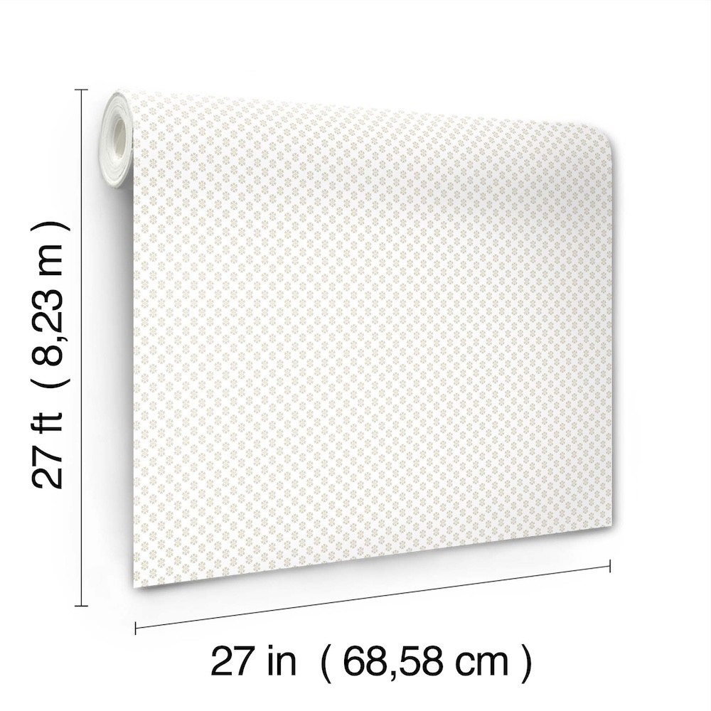 Petite floral stamps form dainty yet densely-clustered offset columns in pattern Brioni. Featured here in beige against white. Brioni is an unpasted, non woven wallpaper measuring 27 inches wide by 27 feet long, covering approximately 60.8 square feet per roll.