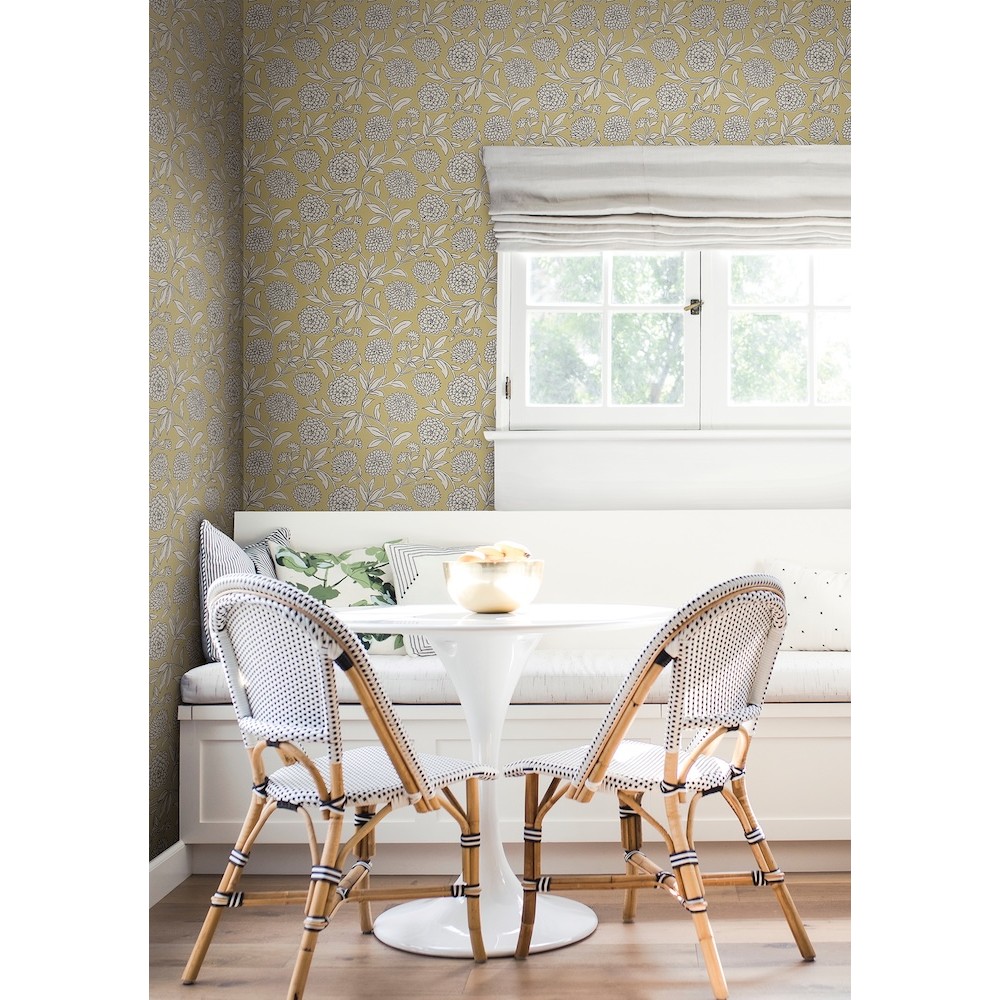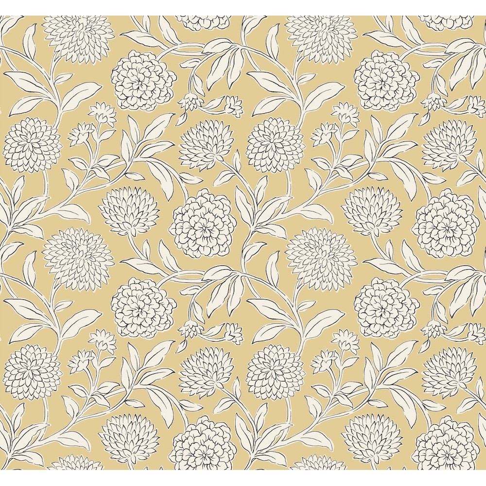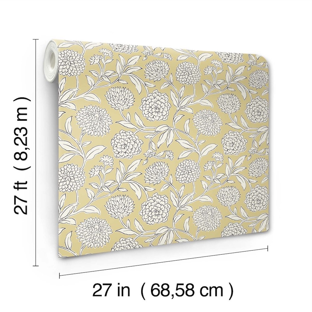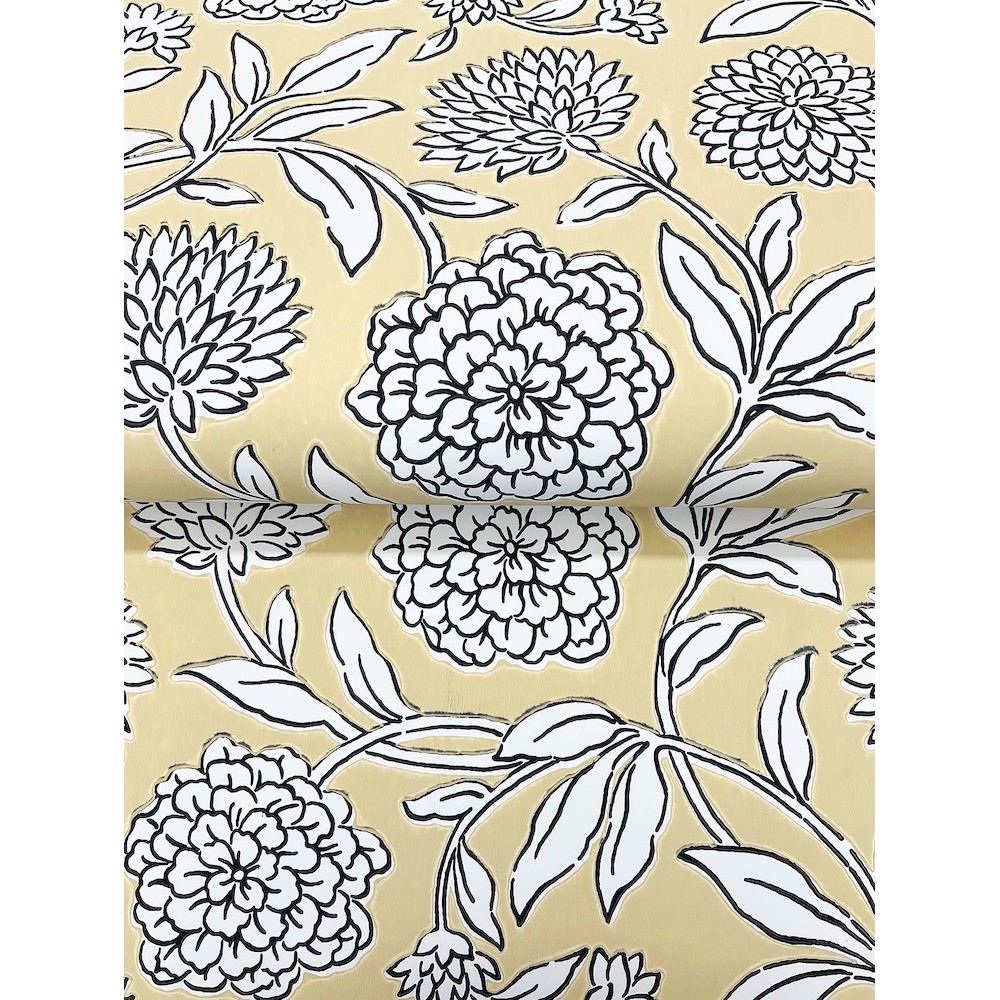 Dreamy dahlias burst into bloom along winding stems, the simple illustrative style giving pattern Chatsworth Garden added charm. Seen here inked in white and black against a pale yellow backdrop. Chatsworth Garden is an unpasted, non woven wallpaper measuring 27 inches wide by 27 feet long, covering approximately 60.8 square feet per roll.