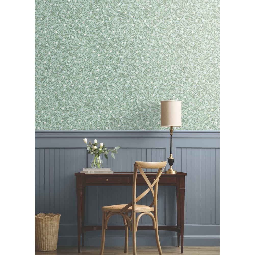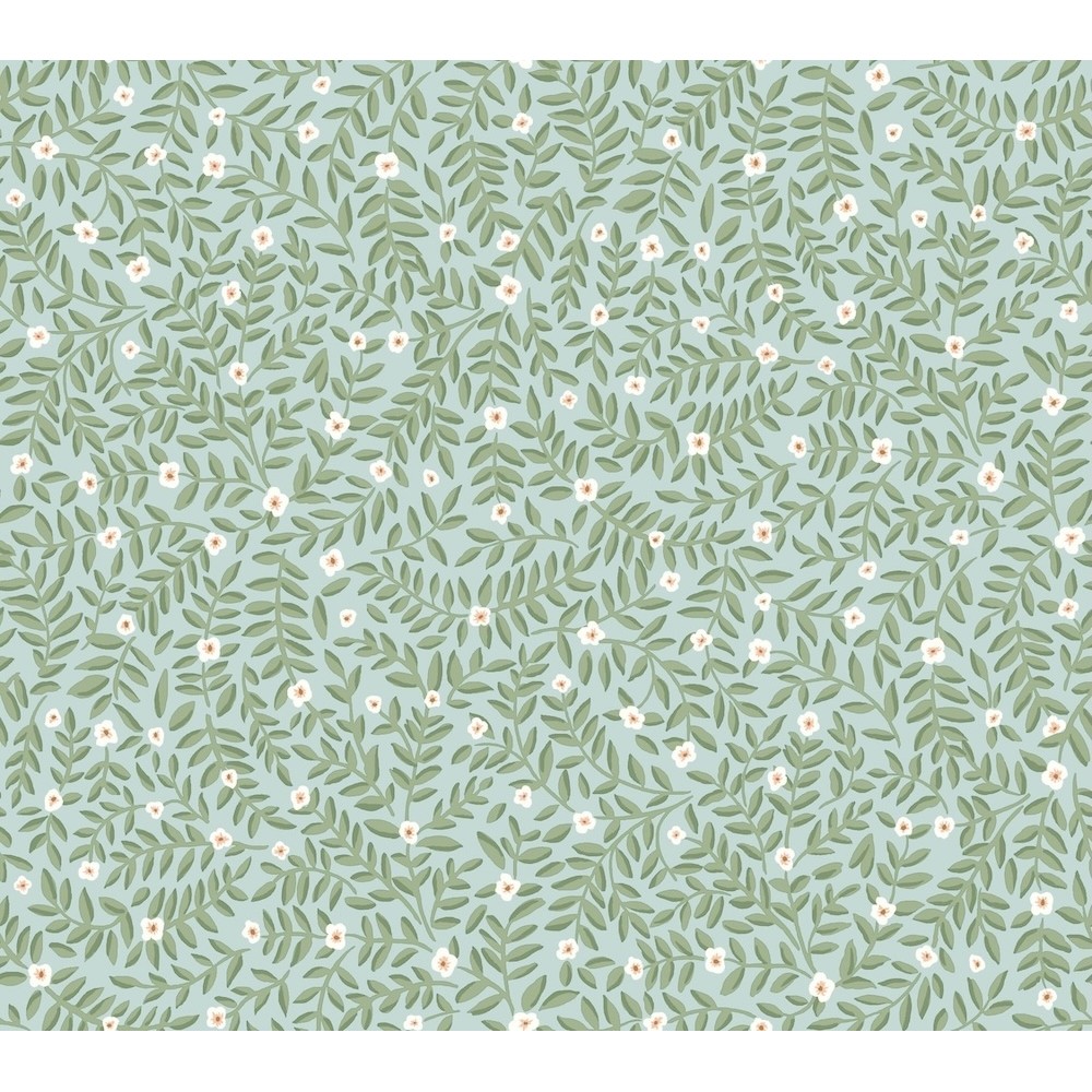 Make a subtle statement with Elodie, a simple yet intricate pattern of petite blooms and swirling vines. Featured here in sage, moss, white, and gold against pale blue. Elodie is a peel and stick, non woven wallpaper measuring 27 inches wide by 20 feet long, covering approximately 45 square feet per roll.