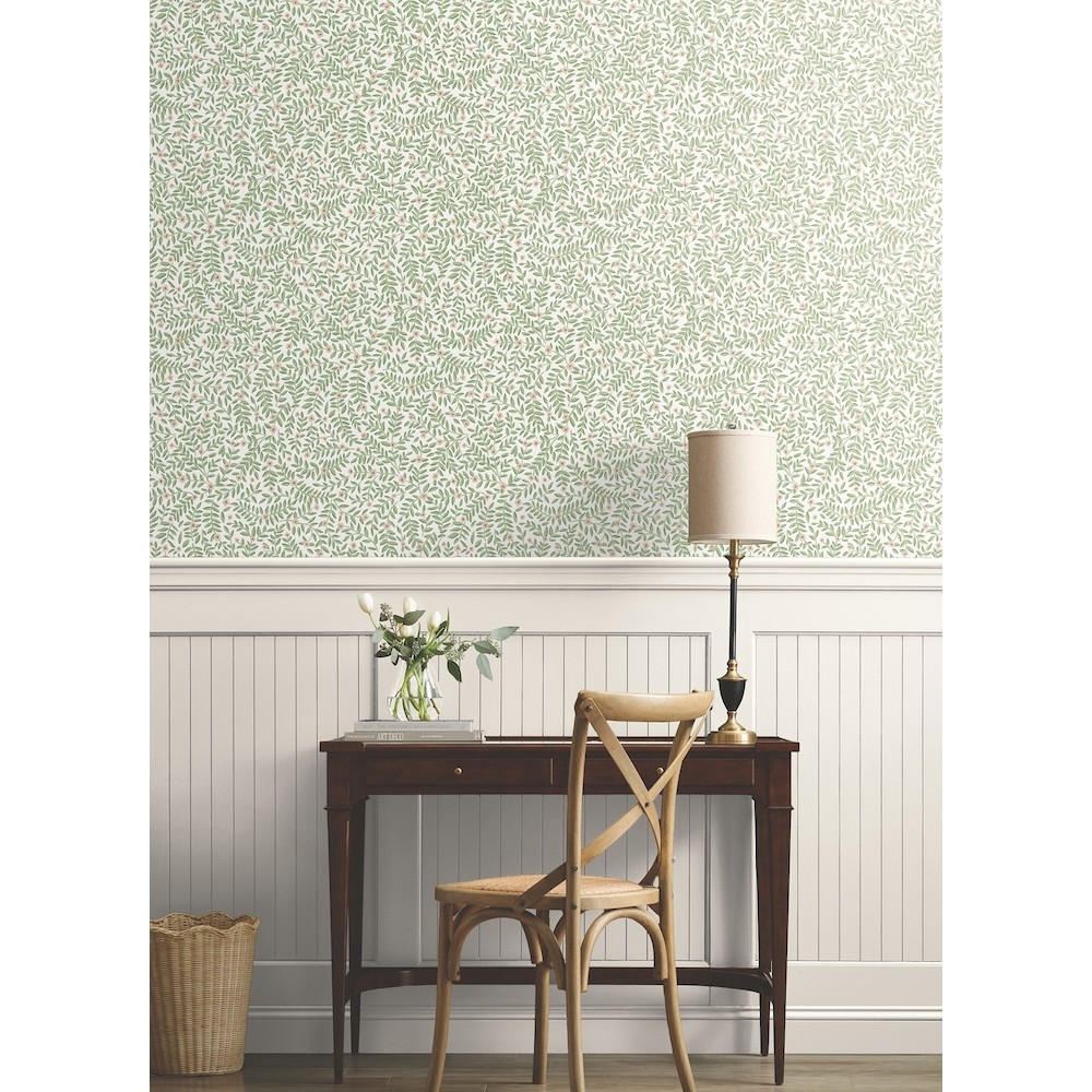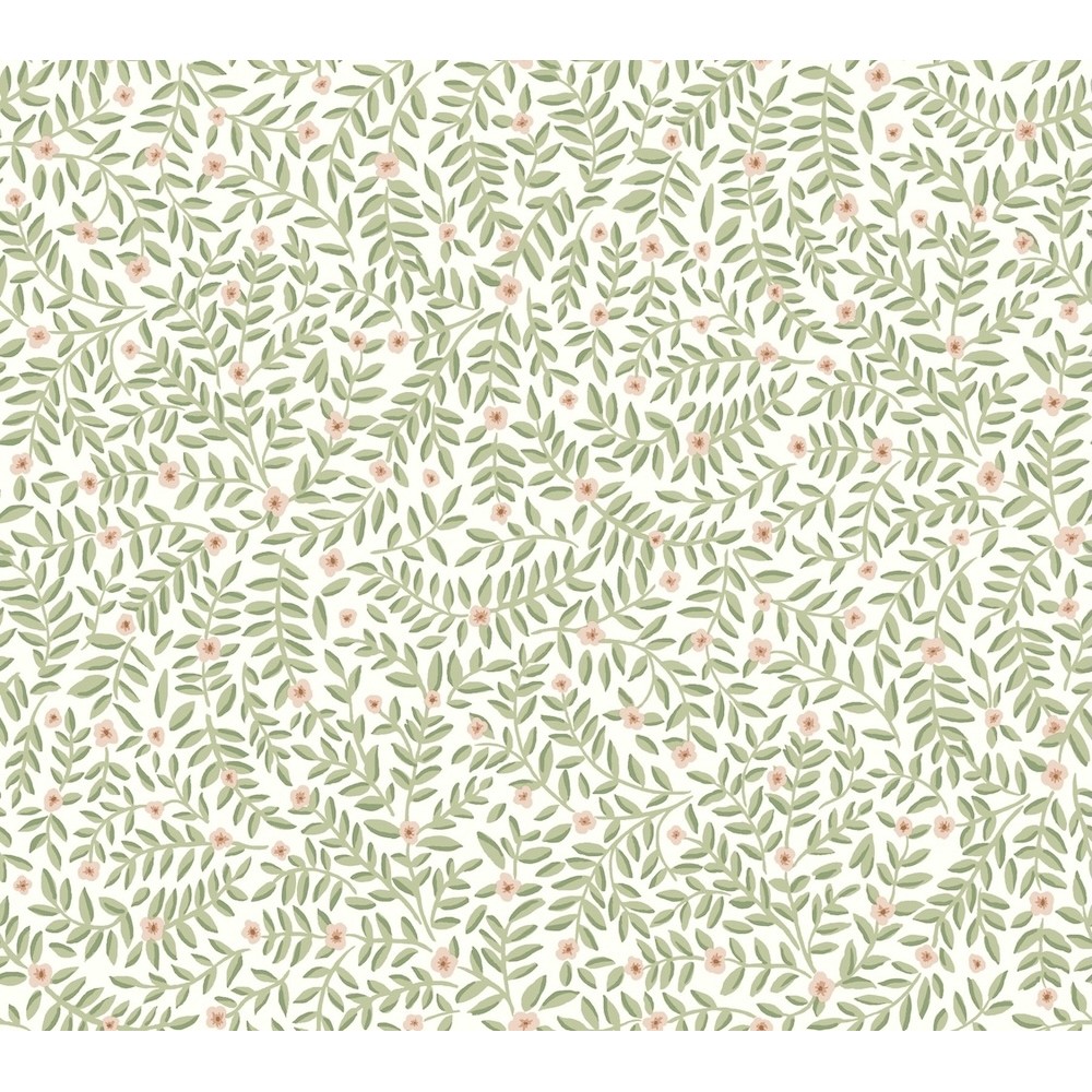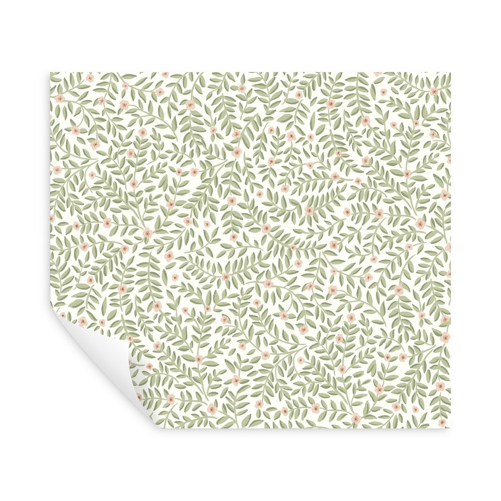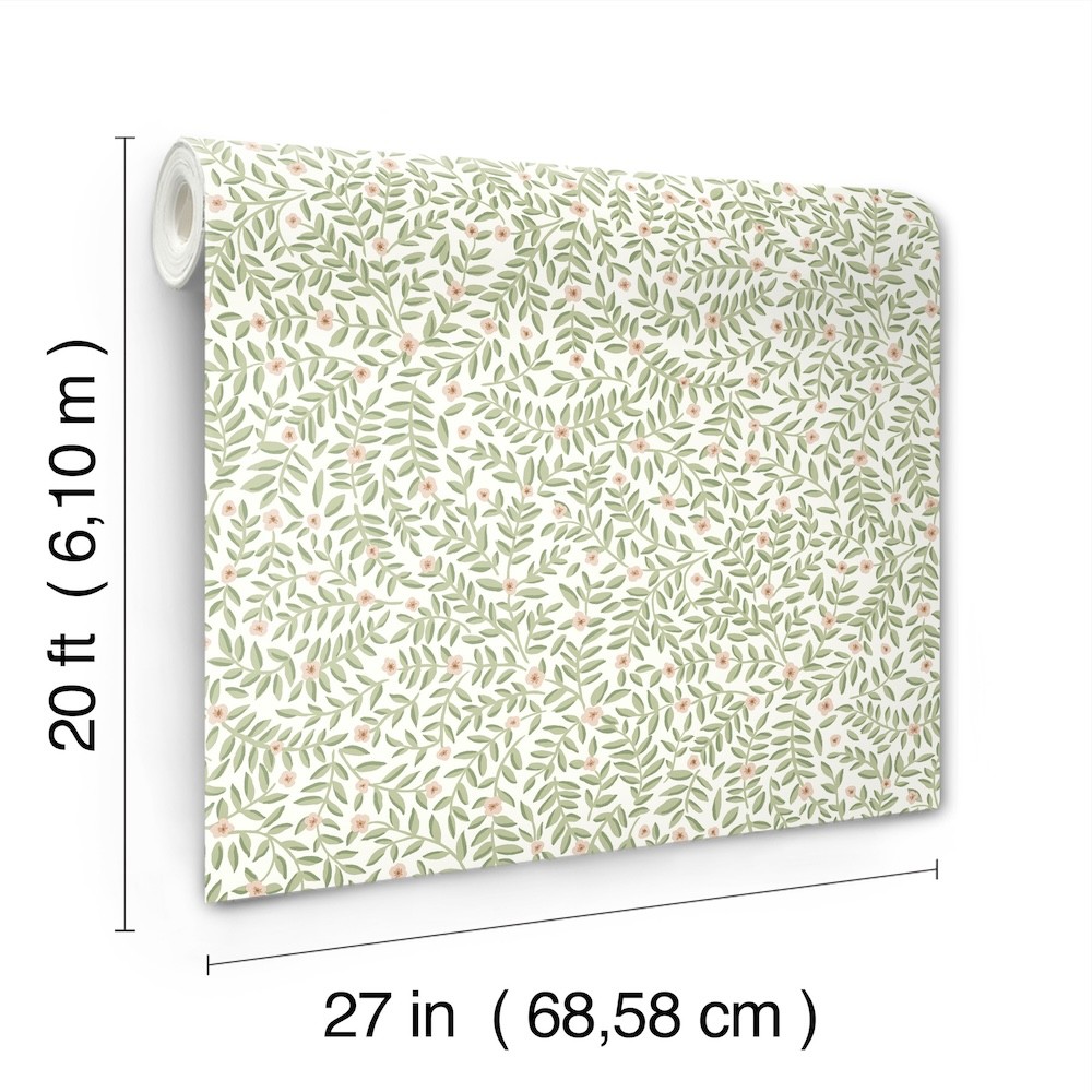 Make a subtle statement with Elodie, a simple yet intricate pattern of petite blooms and swirling vines. Featured here in sage, moss, pale peach, and pink against white. Elodie is a peel and stick, non woven wallpaper measuring 27 inches wide by 20 feet long, covering approximately 45 square feet per roll.