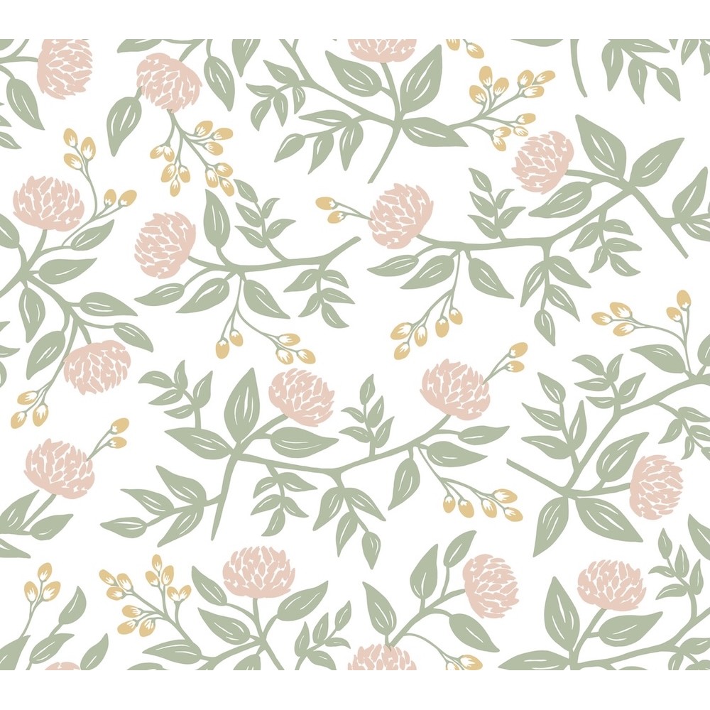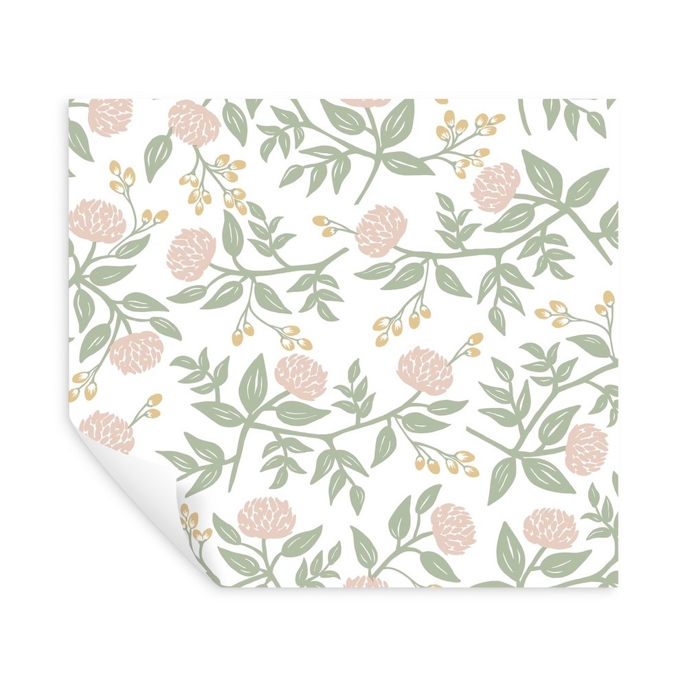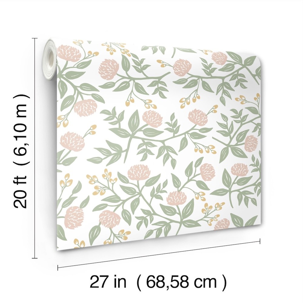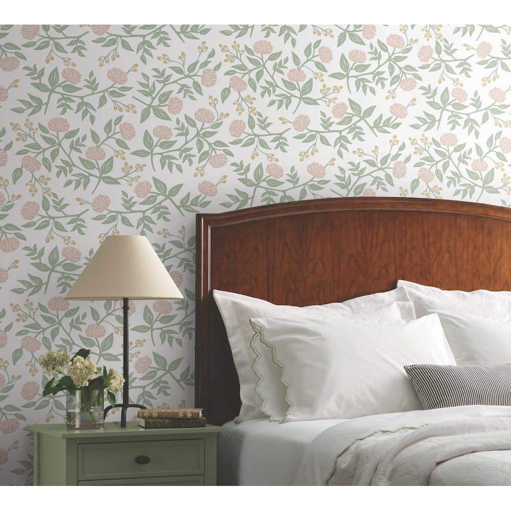 One of the original prints in the Rifle Paper Co. repertoire, Peonies features large blooms and delicate buds with an effortless, elegant feel. Featured here in delicate blush, metallic gold, and sage against white. Peonies is a peel and stick, non woven wallpaper measuring 27 inches wide by 20 feet long, covering approximately 45 square feet per roll.