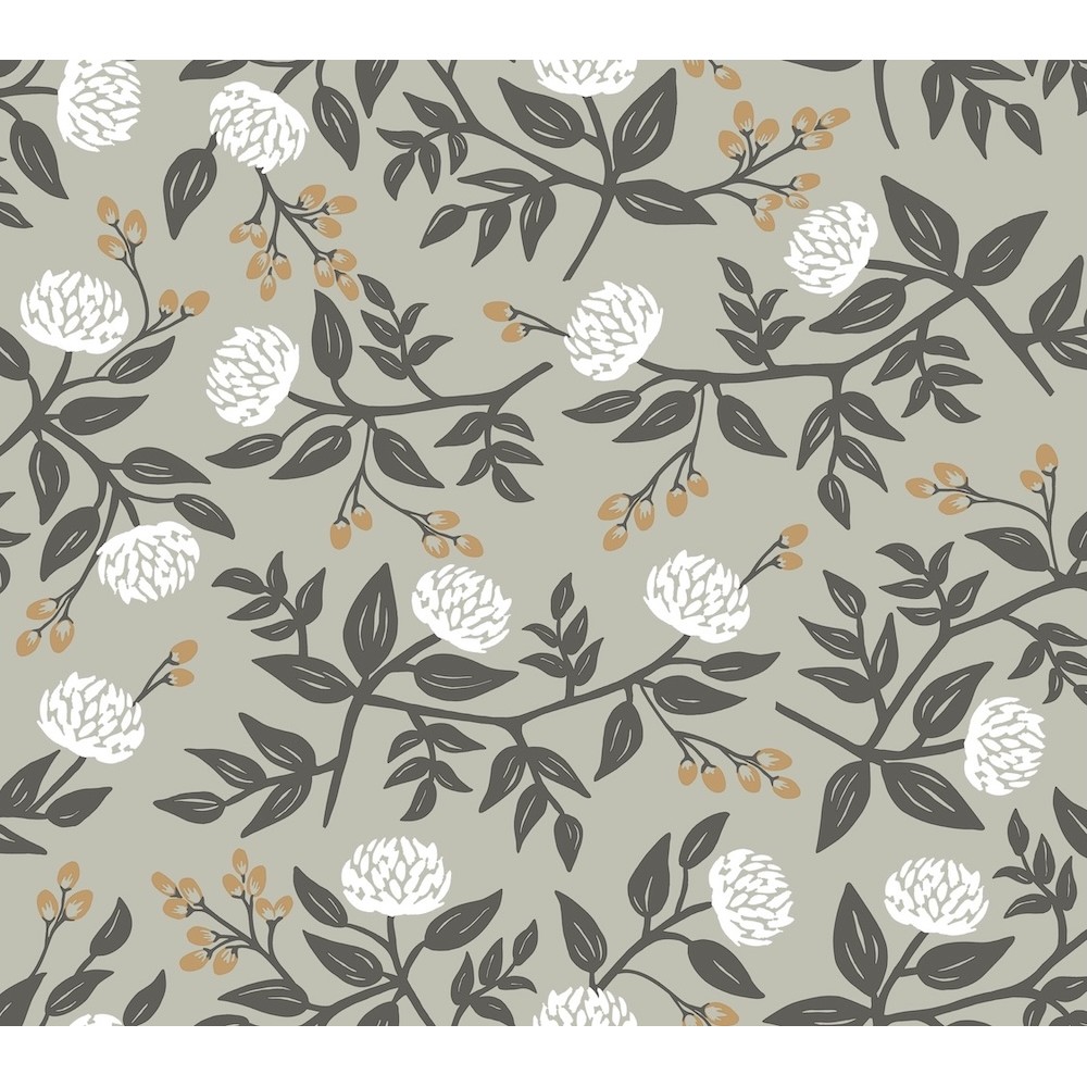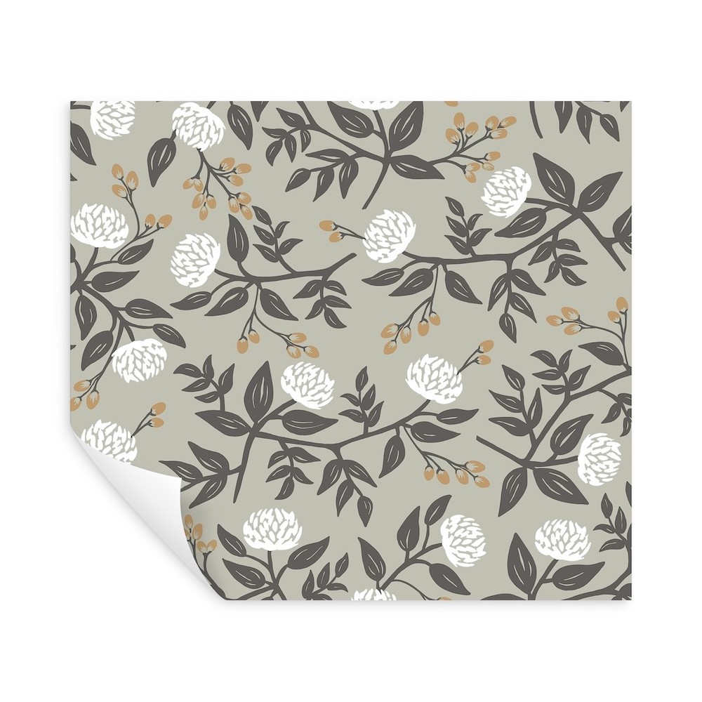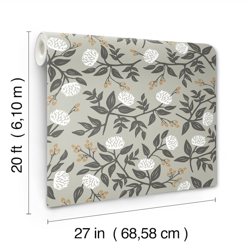 One of the original prints in the Rifle Paper Co. repertoire, Peonies features large blooms and delicate buds with an effortless, elegant feel. Featured here in white, metallic gold, and charcoal against grey. Peonies is a peel and stick, non woven wallpaper measuring 27 inches wide by 20 feet long, covering approximately 45 square feet per roll.