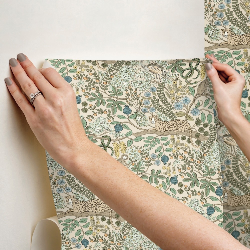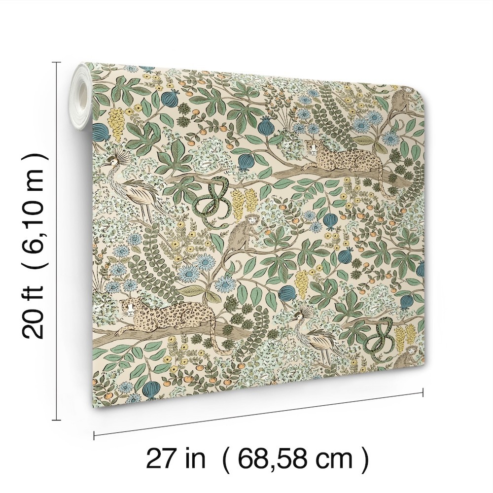 Inspired by visions of old-world travel, Safari is an ink-drawn pattern featuring wild animals, winding vines, and intriguing details. Featured here in shades of green, blue, yellow, orange, beige, and brown against cream. Safari is a peel and stick, non woven wallpaper measuring 27 inches wide by 20 feet long, covering approximately 45 square feet per roll.