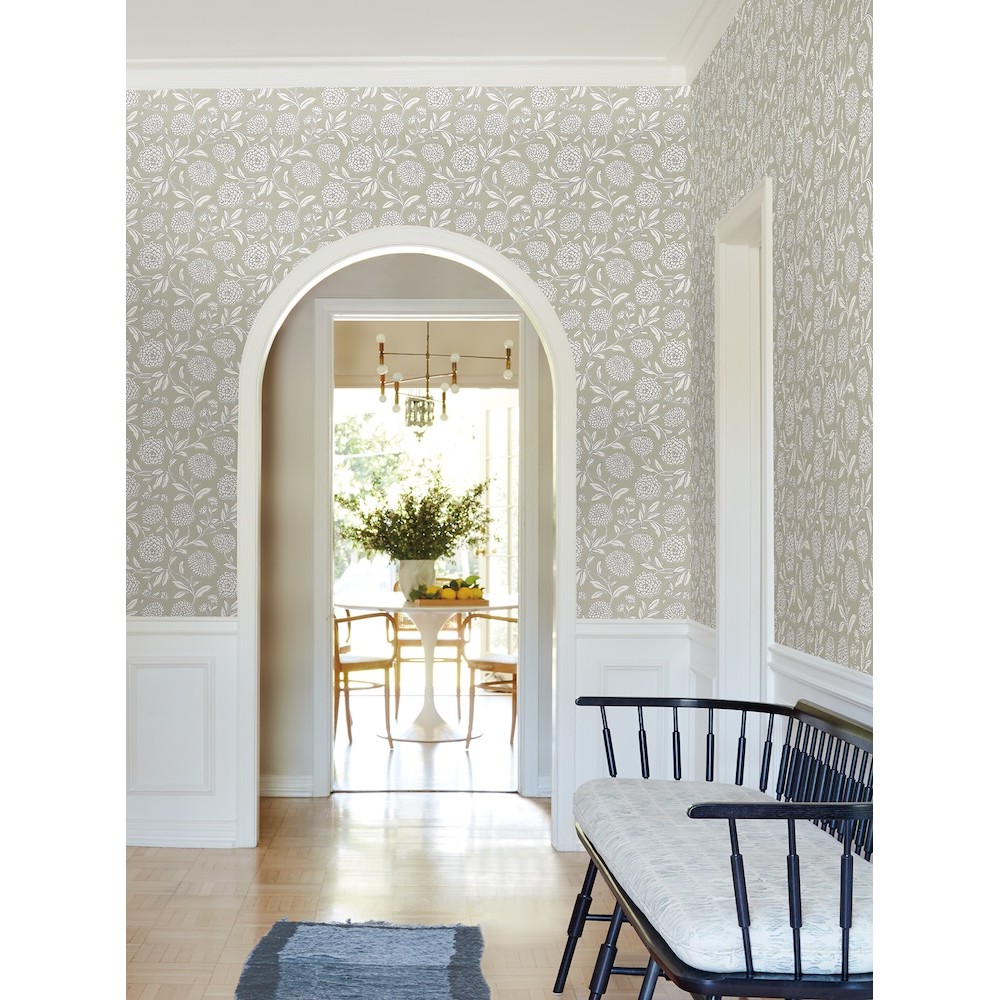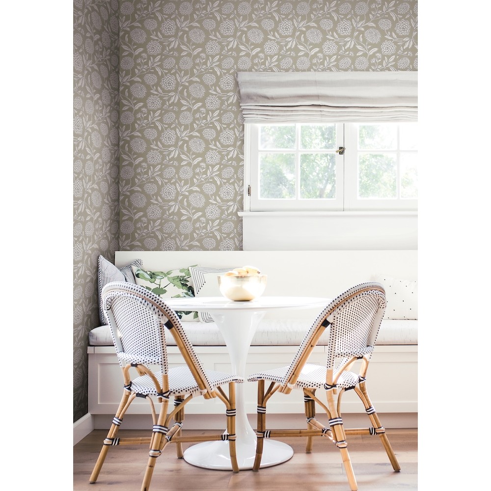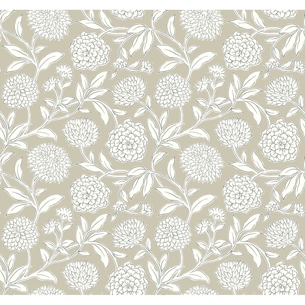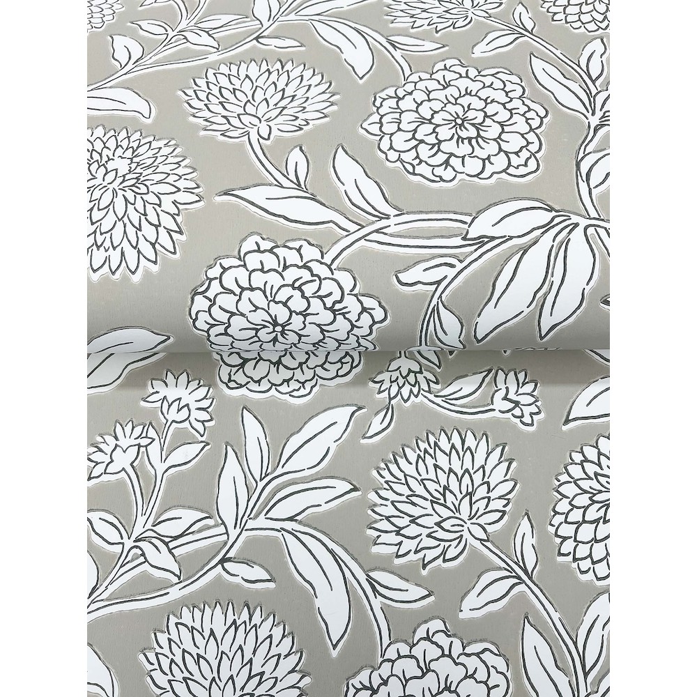 Dreamy dahlias burst into bloom along winding stems, the simple illustrative style giving pattern Chatsworth Garden added charm. Seen here inked in white and grey against a taupe backdrop. Chatsworth Garden is an unpasted, non woven wallpaper measuring 27 inches wide by 27 feet long, covering approximately 60.8 square feet per roll.