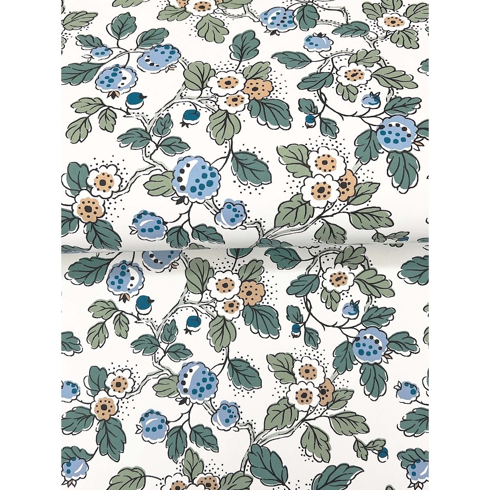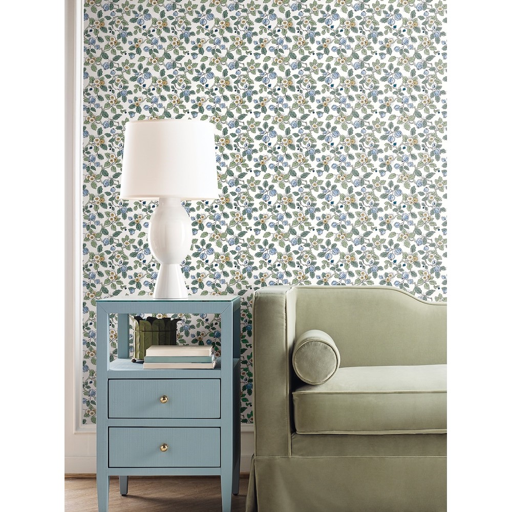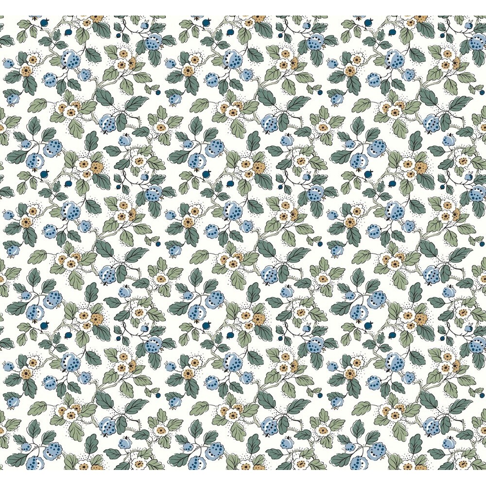 Ripe berries share the vine with floral blooms in the dense greenery of charmingly illustrated pattern Framboise. Featured here with a palette of sky blue, indigo, sea green, light green, butter yellow, and white. Framboise is an unpasted, non woven wallpaper measuring 27 inches wide by 27 feet long, covering approximately 60.8 square feet per roll.