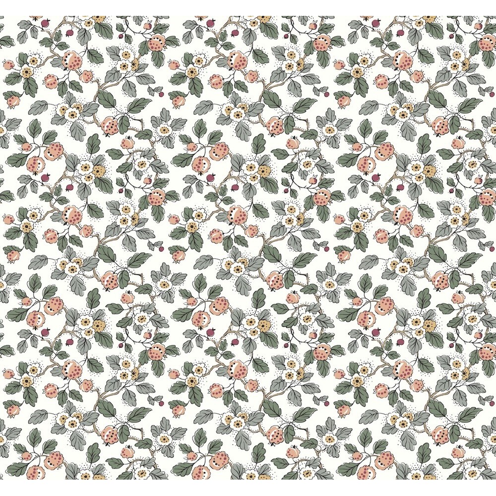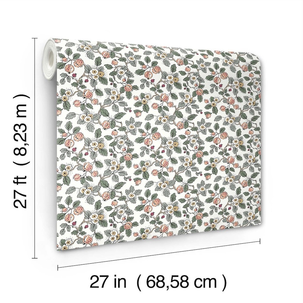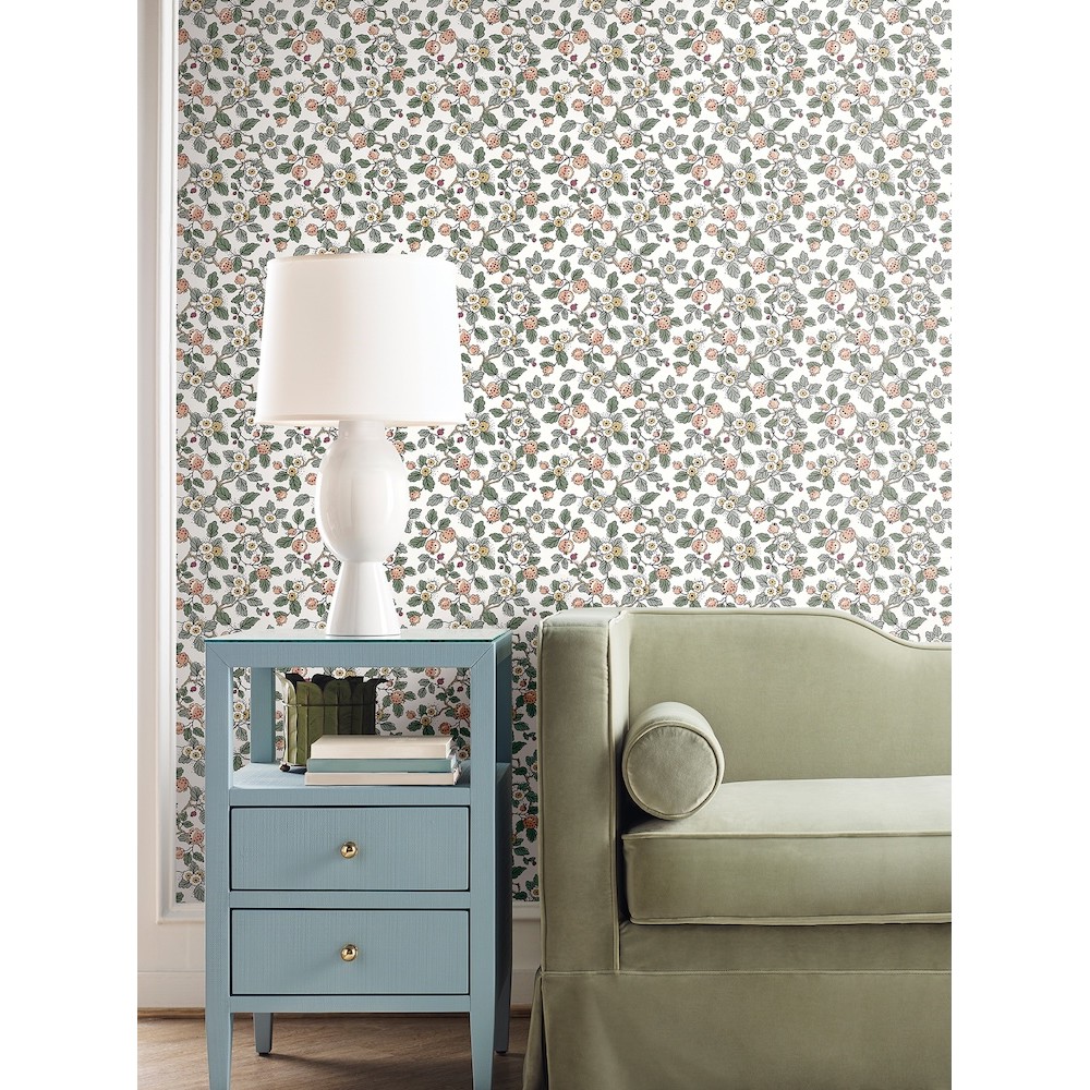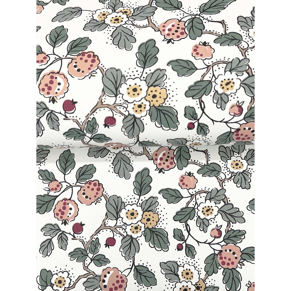 Ripe berries share the vine with floral blooms in the dense greenery of charmingly illustrated pattern Framboise. Featured here with a palette of pale pink, merlot, butter yellow, sea green, blue-grey, light brown, and white. Framboise is an unpasted, non woven wallpaper measuring 27 inches wide by 27 feet long, covering approximately 60.8 square feet per roll.