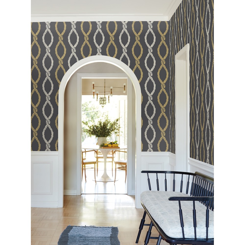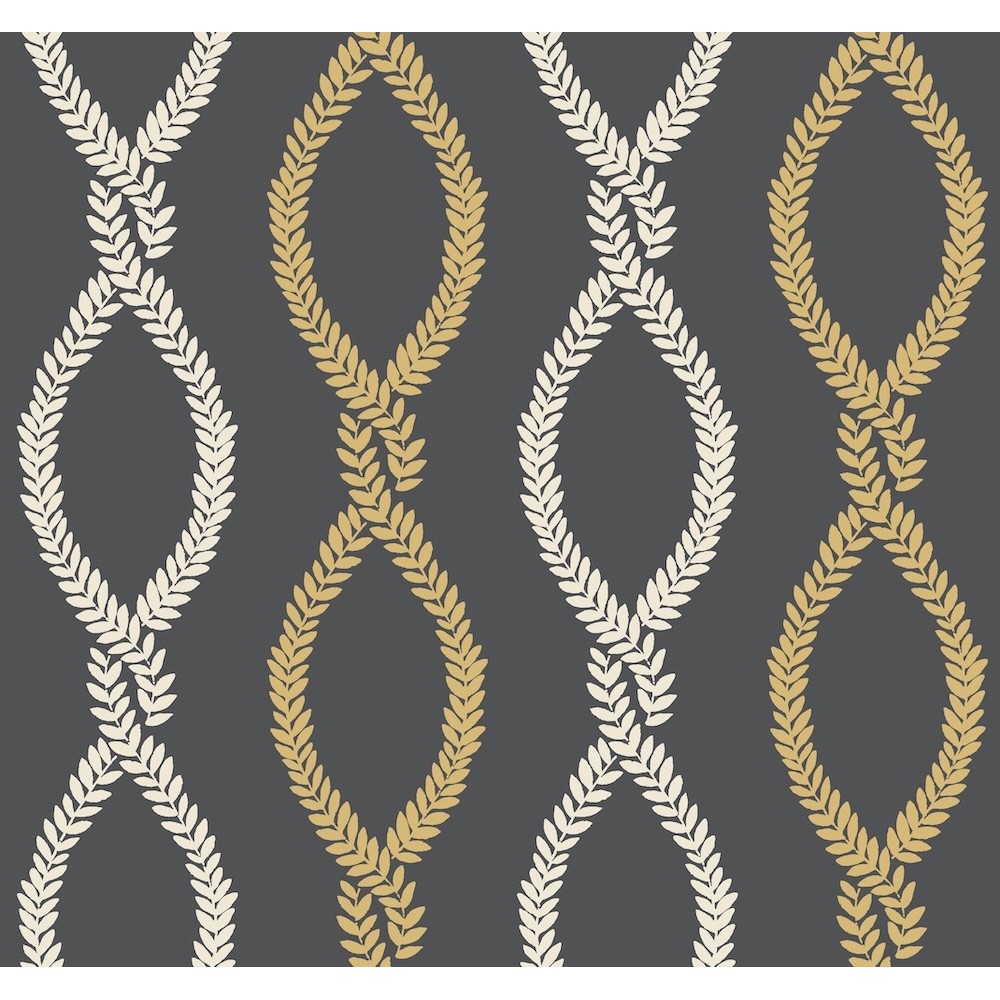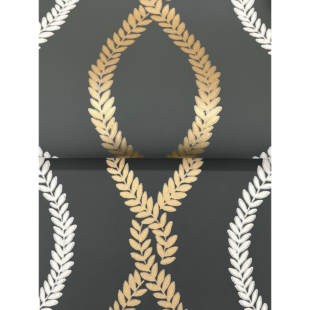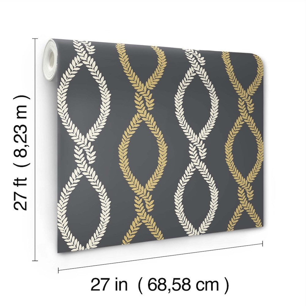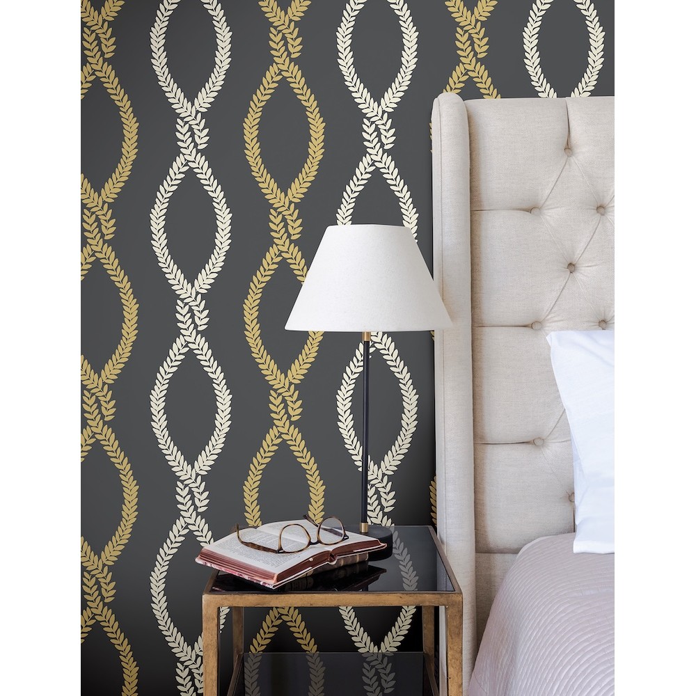 Pairs of leafy vines twist and twine together to form a looping chain in pattern Laureate. Featured here in a palette of white, metallic gold, and matte black. Laureate is an unpasted, non woven wallpaper measuring 27 inches wide by 27 feet long, covering approximately 60.8 square feet per roll.