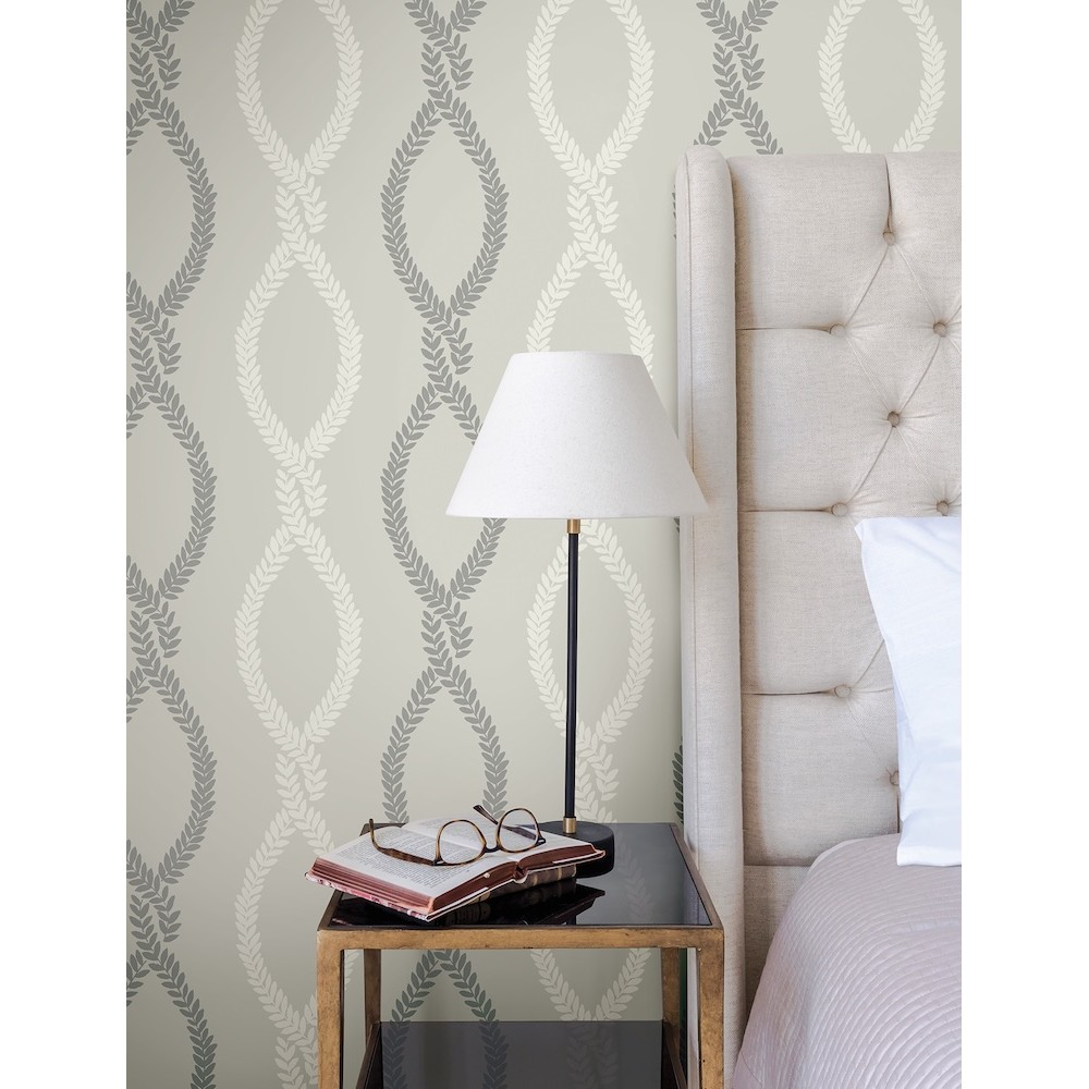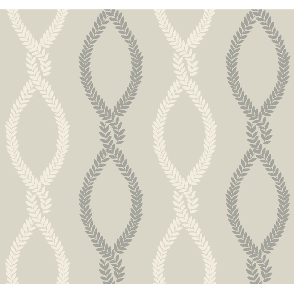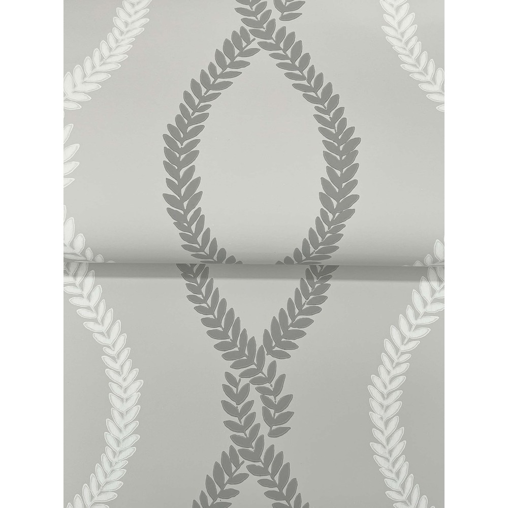 Pairs of leafy vines twist and twine together to form a looping chain in pattern Laureate. Featured here in a palette of white, charcoal, and pale grey. Laureate is an unpasted, non woven wallpaper measuring 27 inches wide by 27 feet long, covering approximately 60.8 square feet per roll.