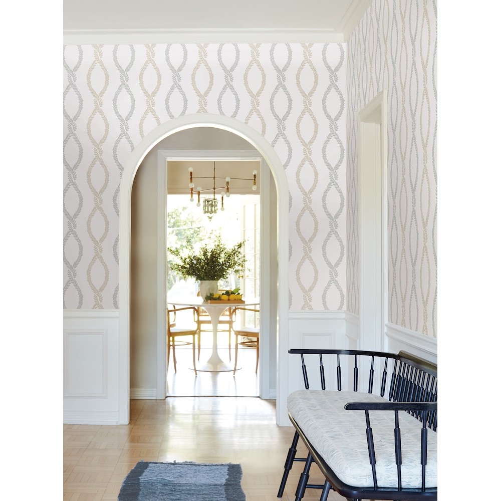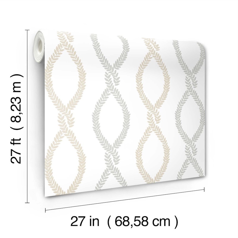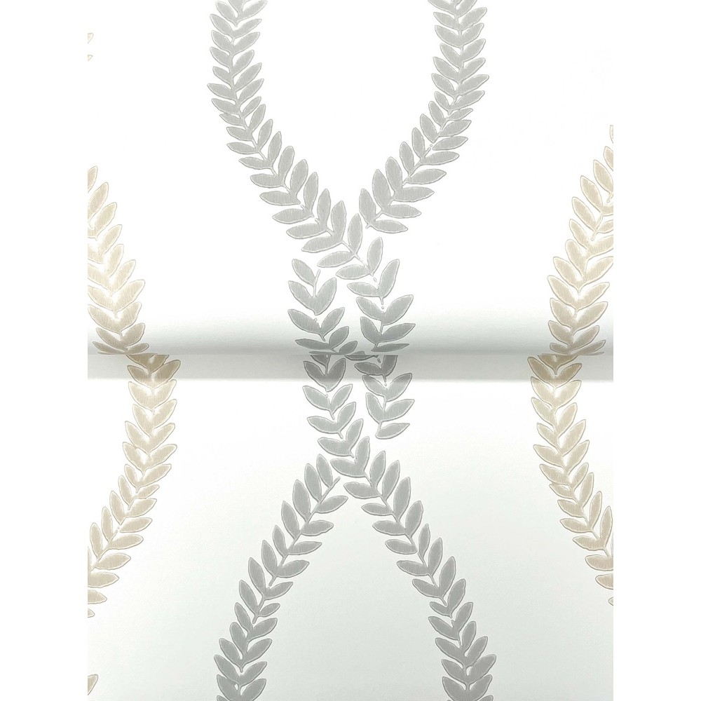 Pairs of leafy vines twist and twine together to form a looping chain in pattern Laureate. Featured here in a palette of pale grey, beige, and white. Laureate is an unpasted, non woven wallpaper measuring 27 inches wide by 27 feet long, covering approximately 60.8 square feet per roll.