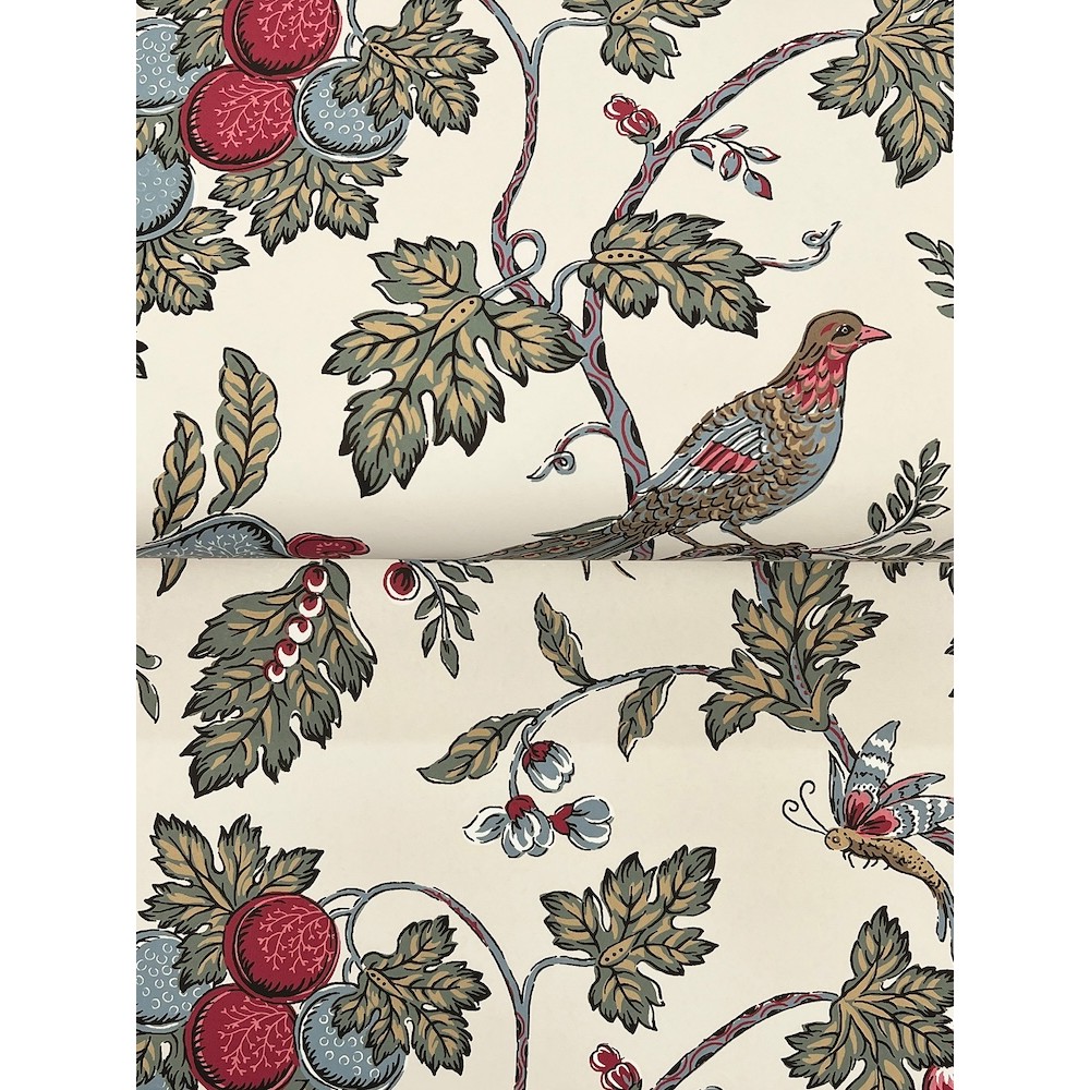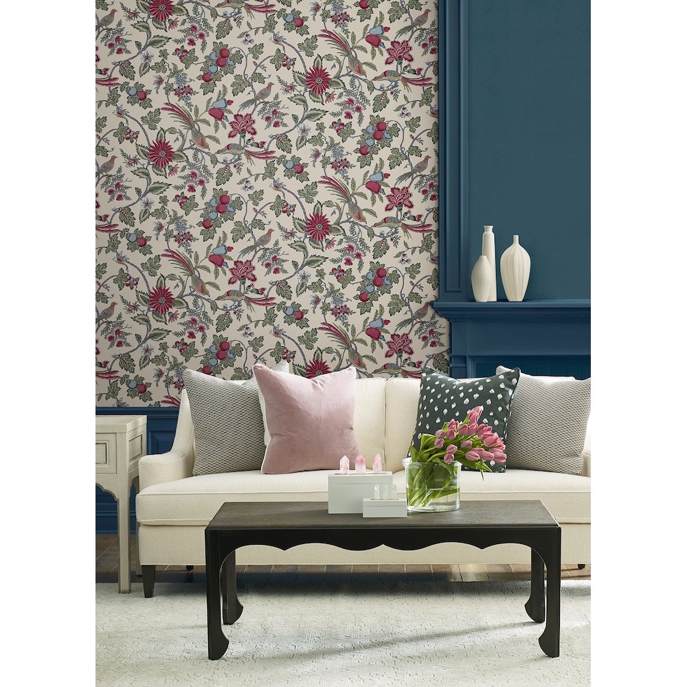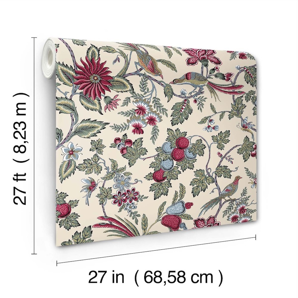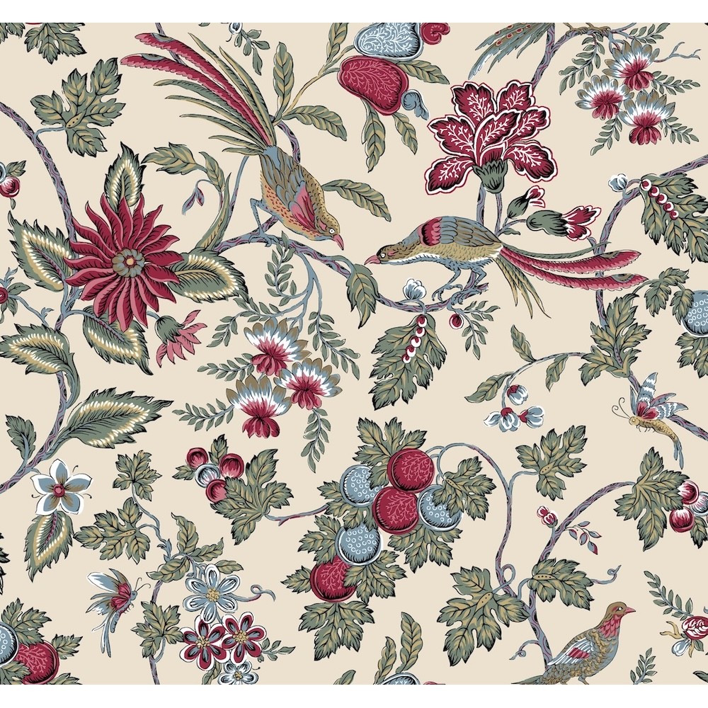 Intricate Jacobean trails sporting voluminous blooms and ripe fruits are visited by exotic birds and butterflies in pattern Parterre. Seen here in a palette of rich raspberry, sky blue, sea green, ochre, pale yellow, and white against palest grey. Parterre is an unpasted, non woven wallpaper measuring 27 inches wide by 27 feet long, covering approximately 60.8 square feet per roll.