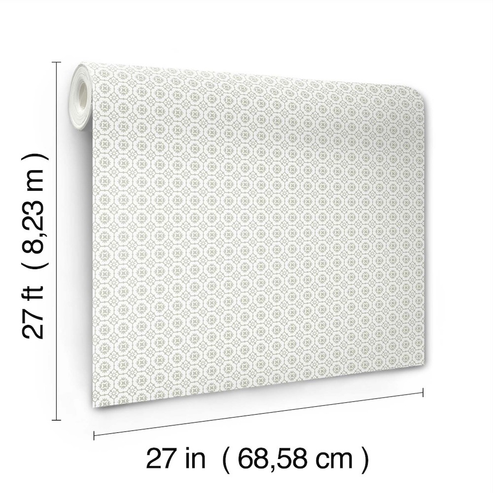 Pattern Priti features an intricate grid of florals composed of larger blooms embellished with petite blossoms at each corner. Seen here in grey against white. Priti is an unpasted, non woven wallpaper measuring 27 inches wide by 27 feet long, covering approximately 60.8 square feet per roll.