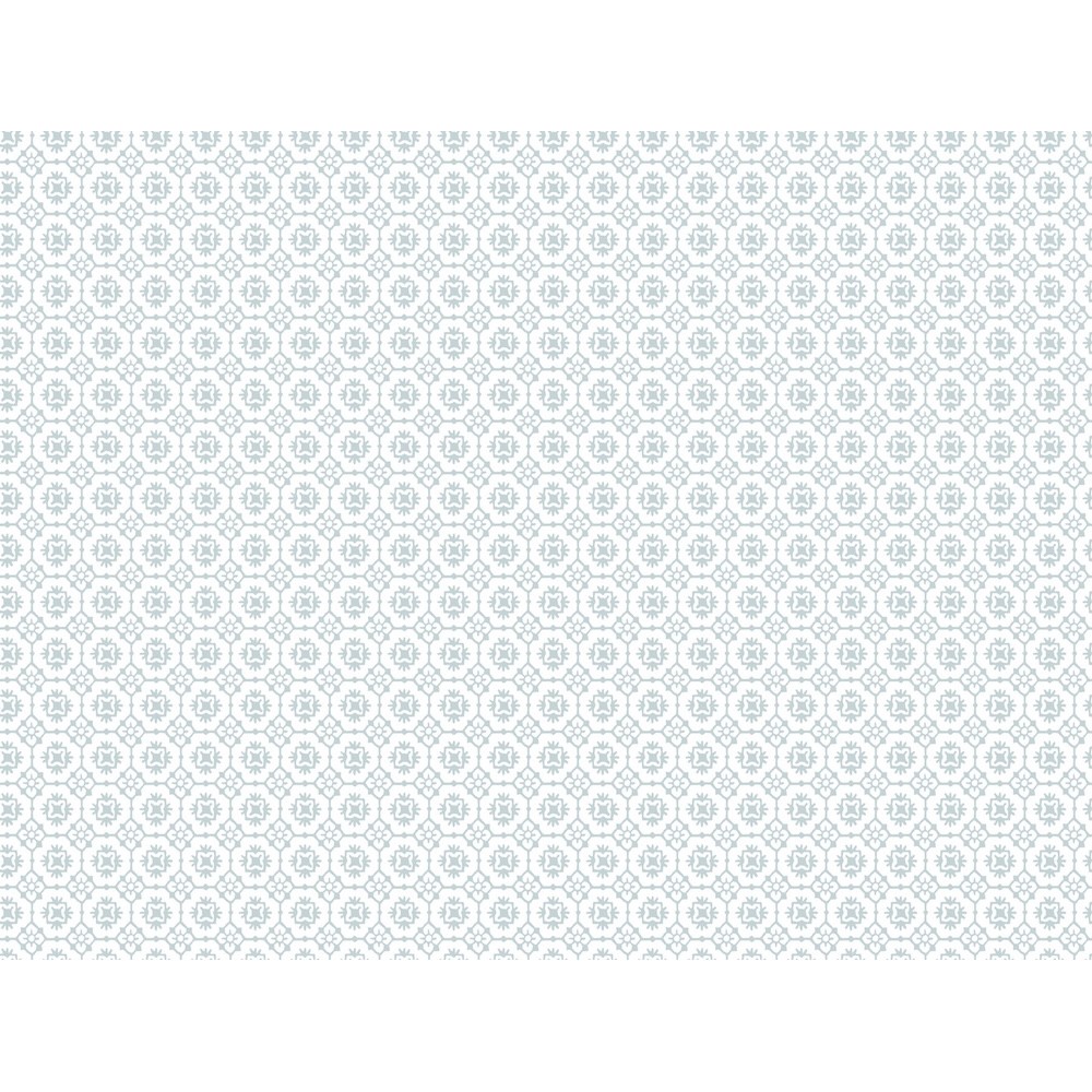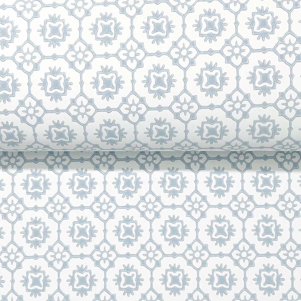 Pattern Priti features an intricate grid of florals composed of larger blooms embellished with petite blossoms at each corner. Seen here in sky blue against white. Priti is an unpasted, non woven wallpaper measuring 27 inches wide by 27 feet long, covering approximately 60.8 square feet per roll.