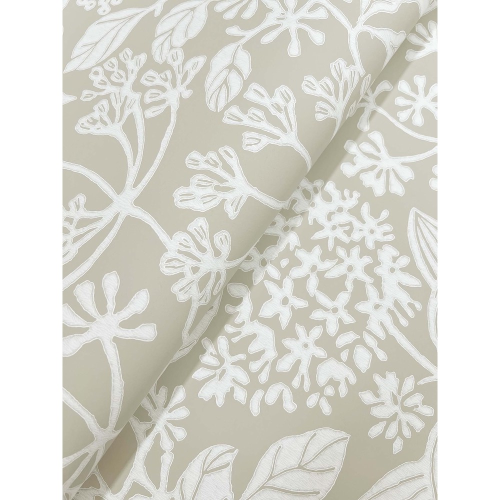 Pattern Rowan encapsulates the beauty of tree's many phases of greenery, flowering, and fruit through artistic silhouettes. The botanical details are inked in white against a cool taupe backdrop. Rowen is an unpasted, non woven wallpaper measuring 27 inches wide by 27 feet long, covering approximately 60.8 square feet per roll.