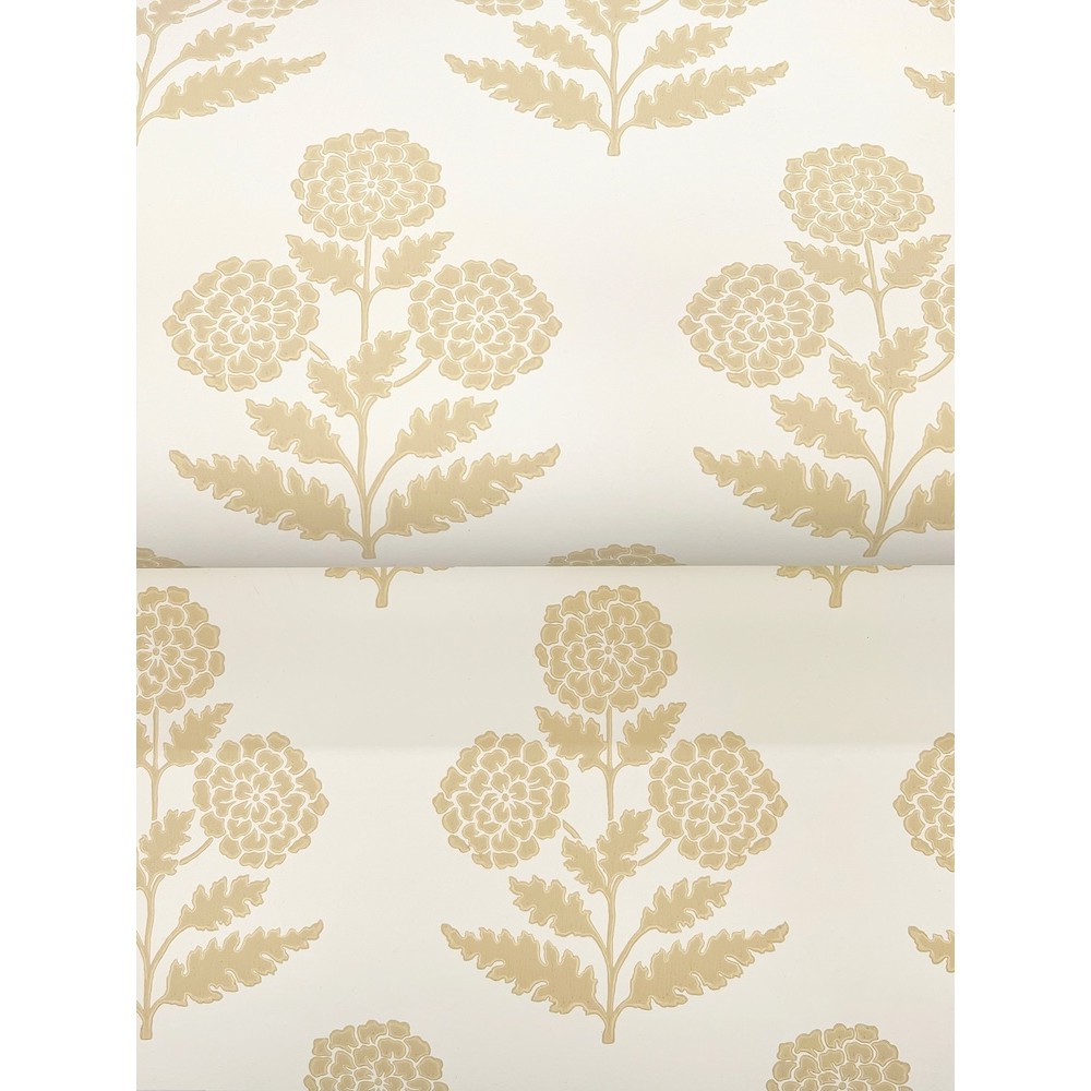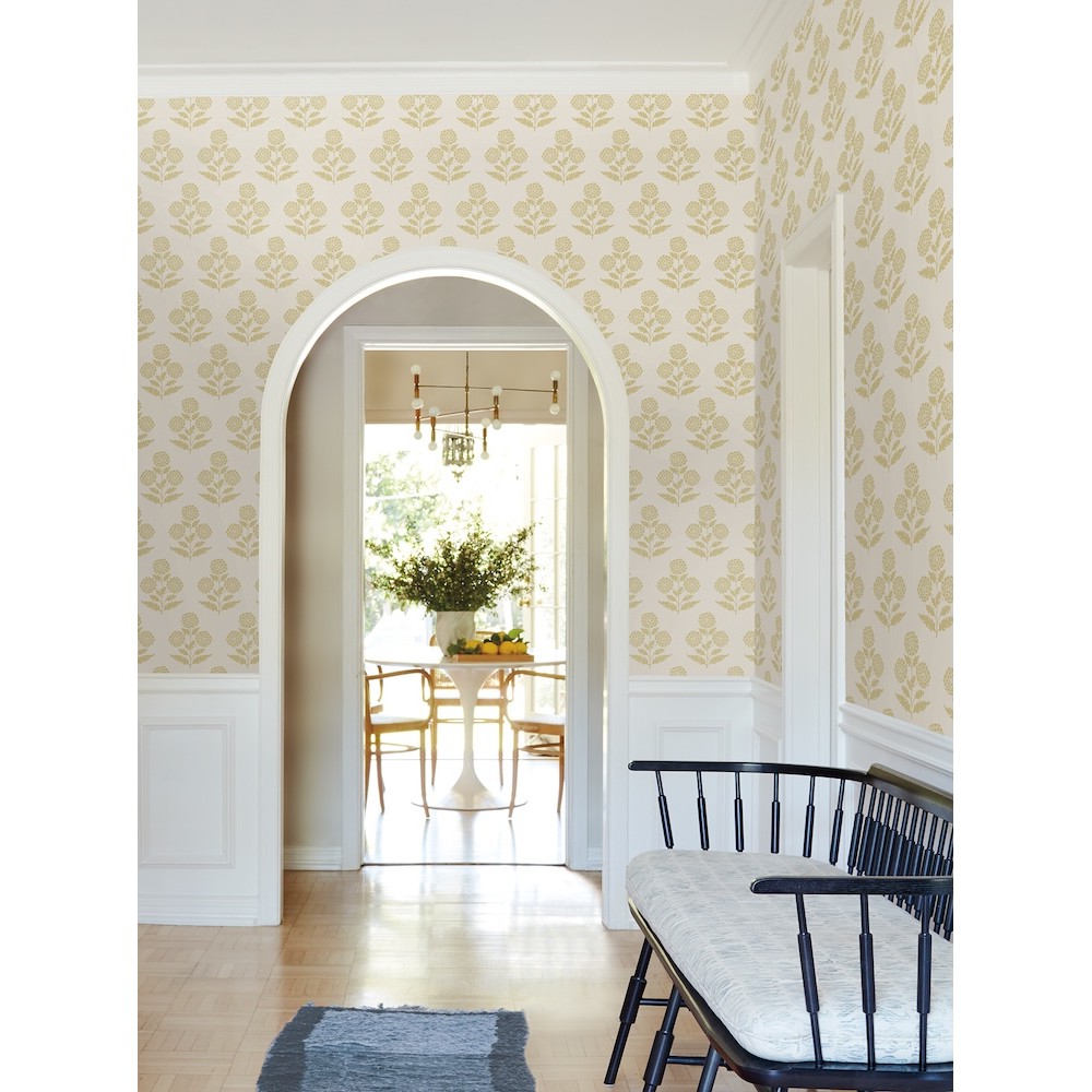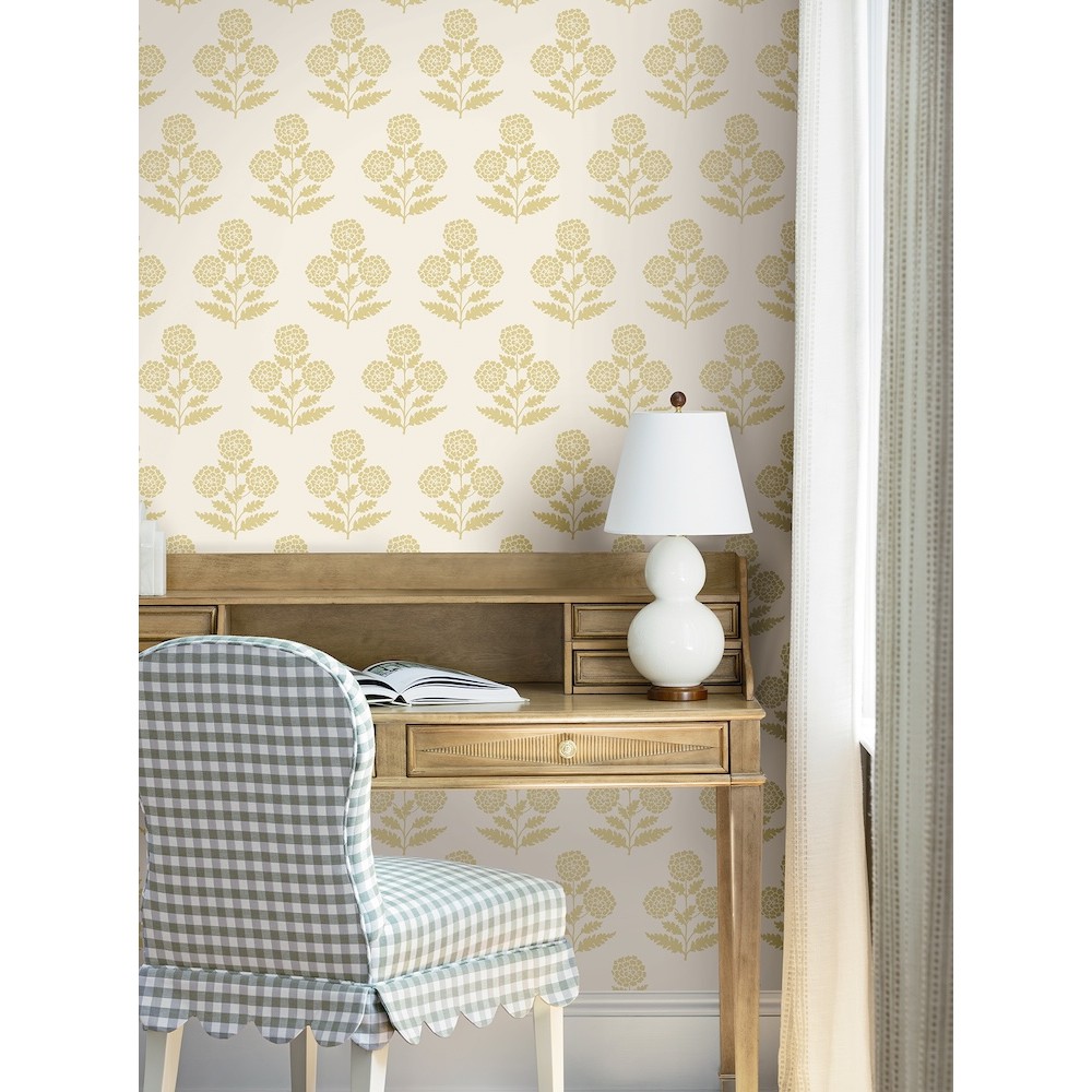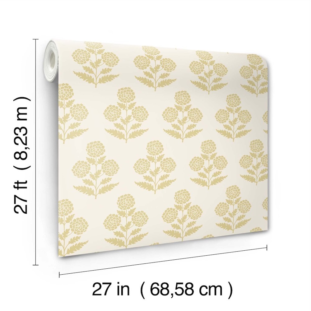A trio of voluminous marigold blooms share a singular leafy stem, the design's block print stylings bringing timeless appeal to pattern Souci. Seen here in butter yellow against cream. Souci is an unpasted, non woven wallpaper measuring 27 inches wide by 27 feet long, covering approximately 60.8 square feet per roll.