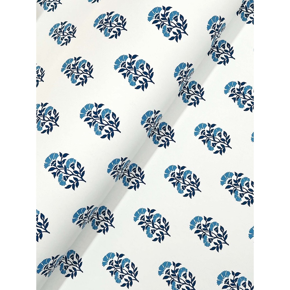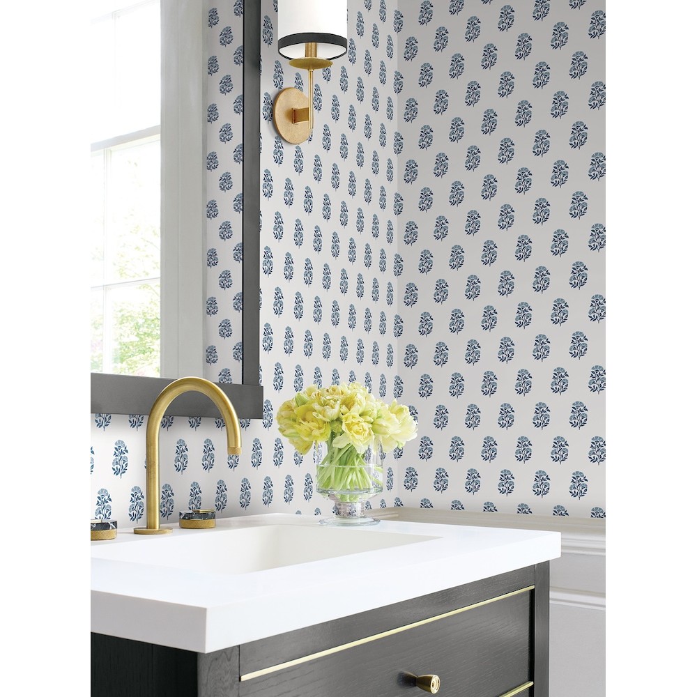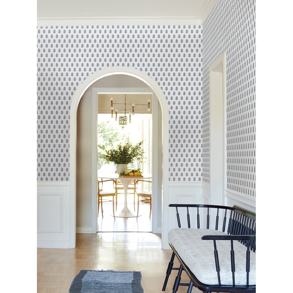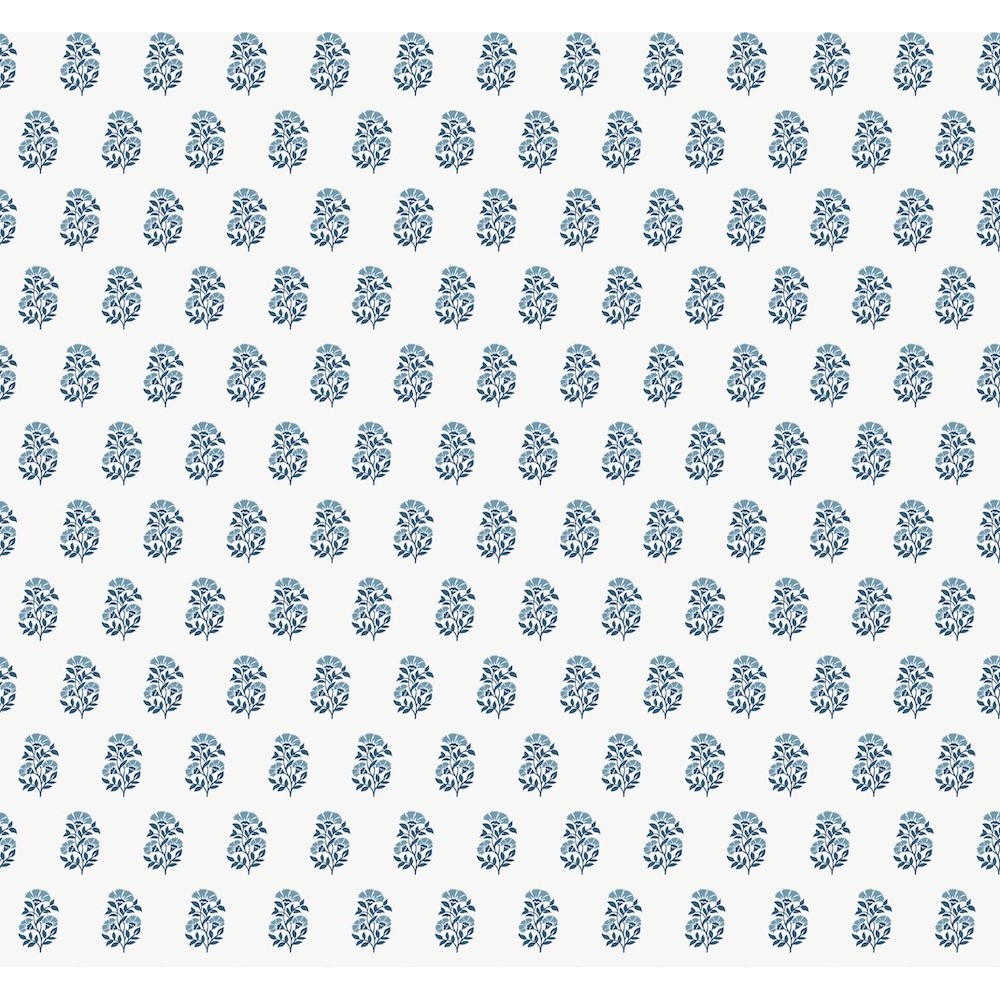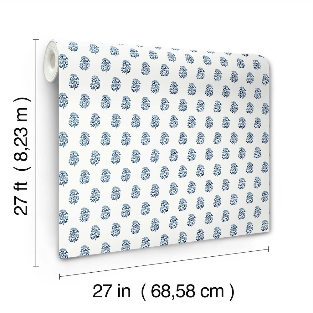 Delicate fanning flowers are stamped in offset rows in pattern Sylvie. The stems are inked in indigo with sky blue blooms, all offset against a crisp white backdrop. Sylvie is an unpasted, non woven wallpaper measuring 27 inches wide by 27 feet long, covering approximately 60.8 square feet per roll.