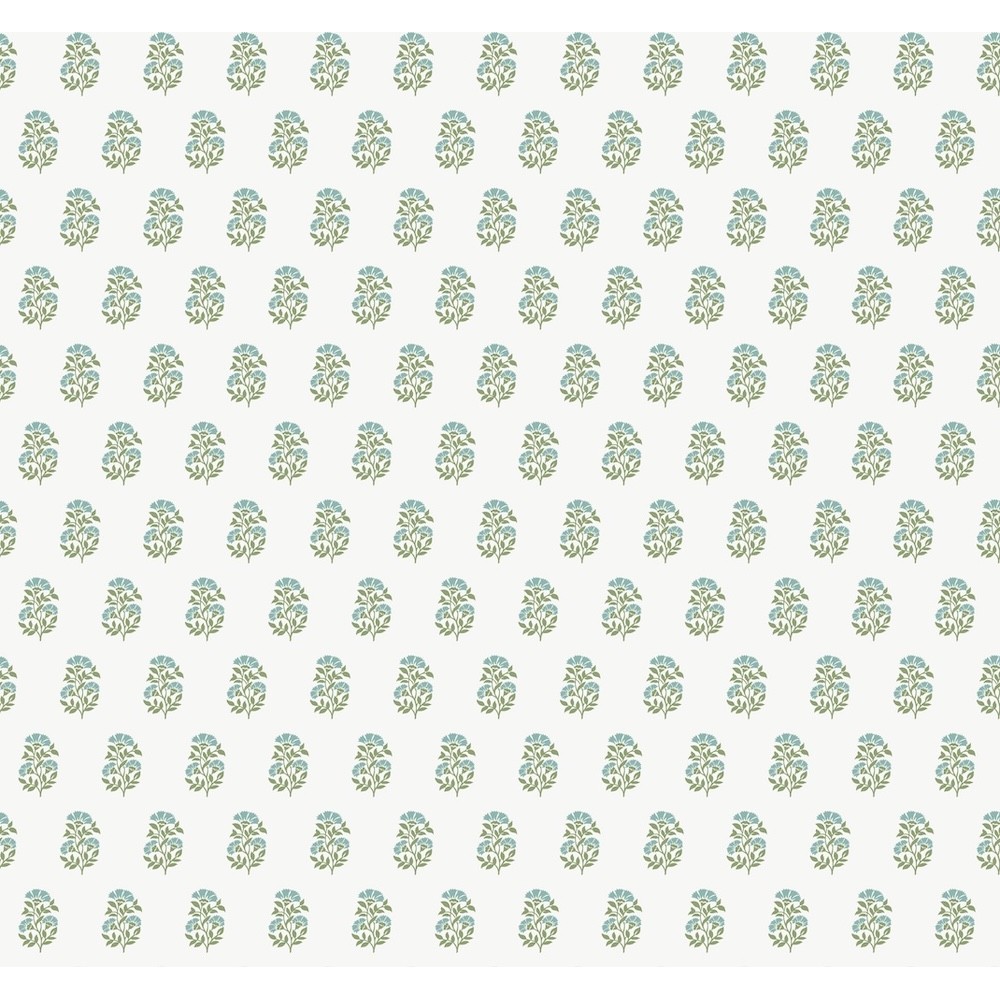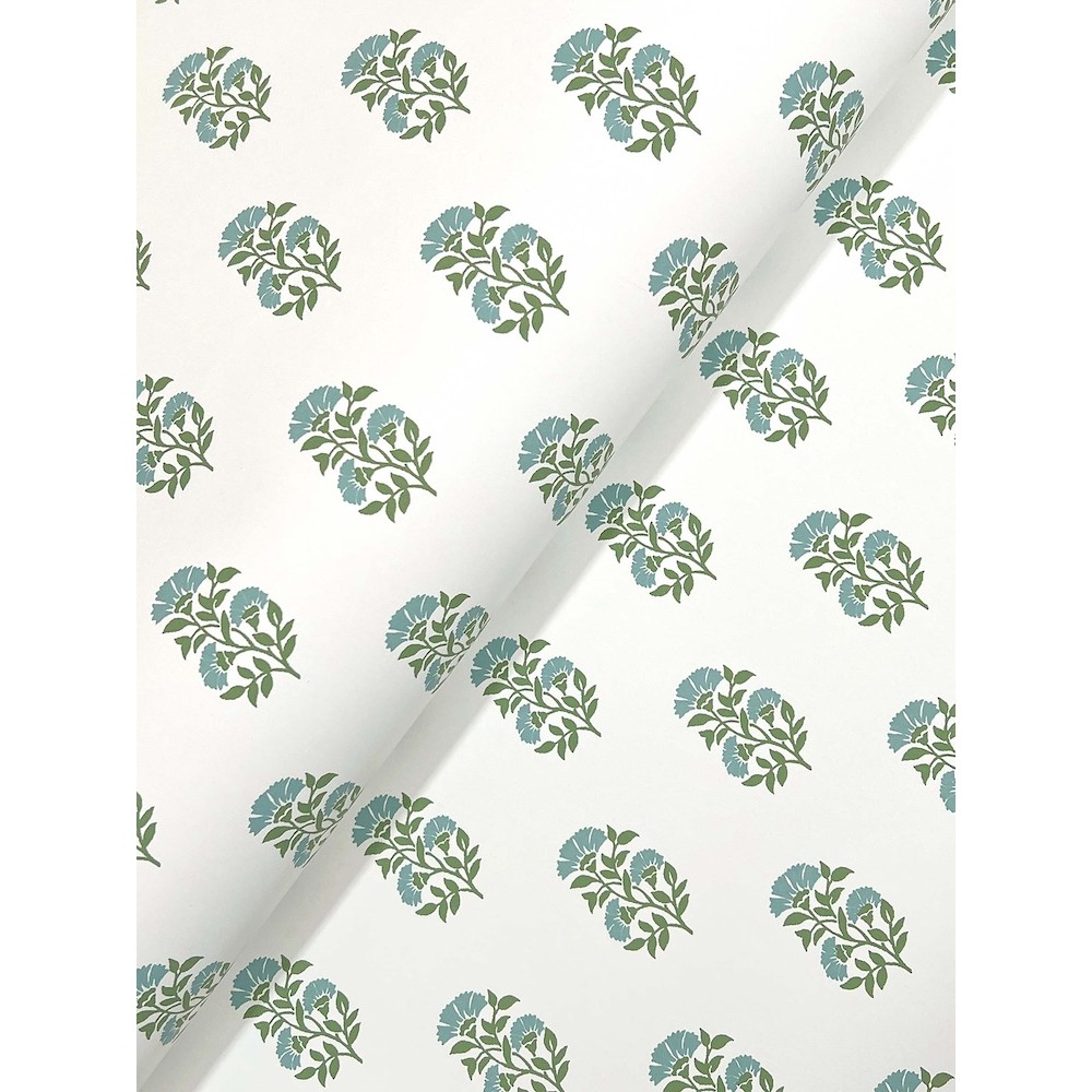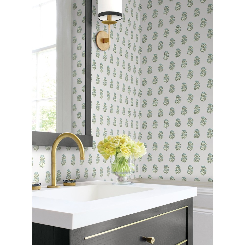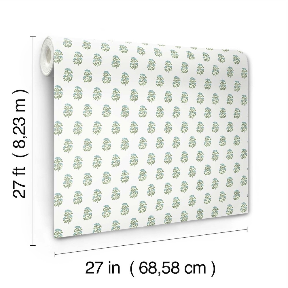 Delicate fanning flowers are stamped in offset rows in pattern Sylvie. The stems are inked in spring green with aqua blooms, all offset against a crisp white backdrop. Sylvie is an unpasted, non woven wallpaper measuring 27 inches wide by 27 feet long, covering approximately 60.8 square feet per roll.