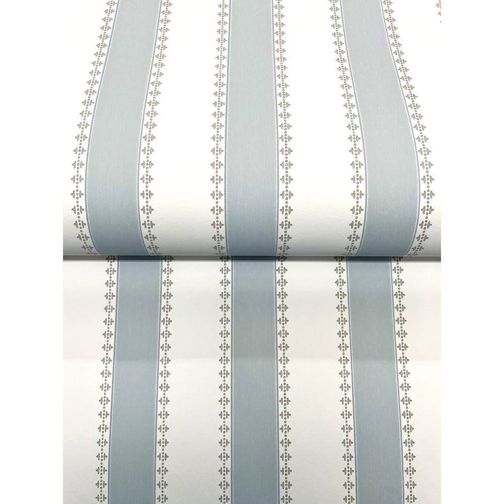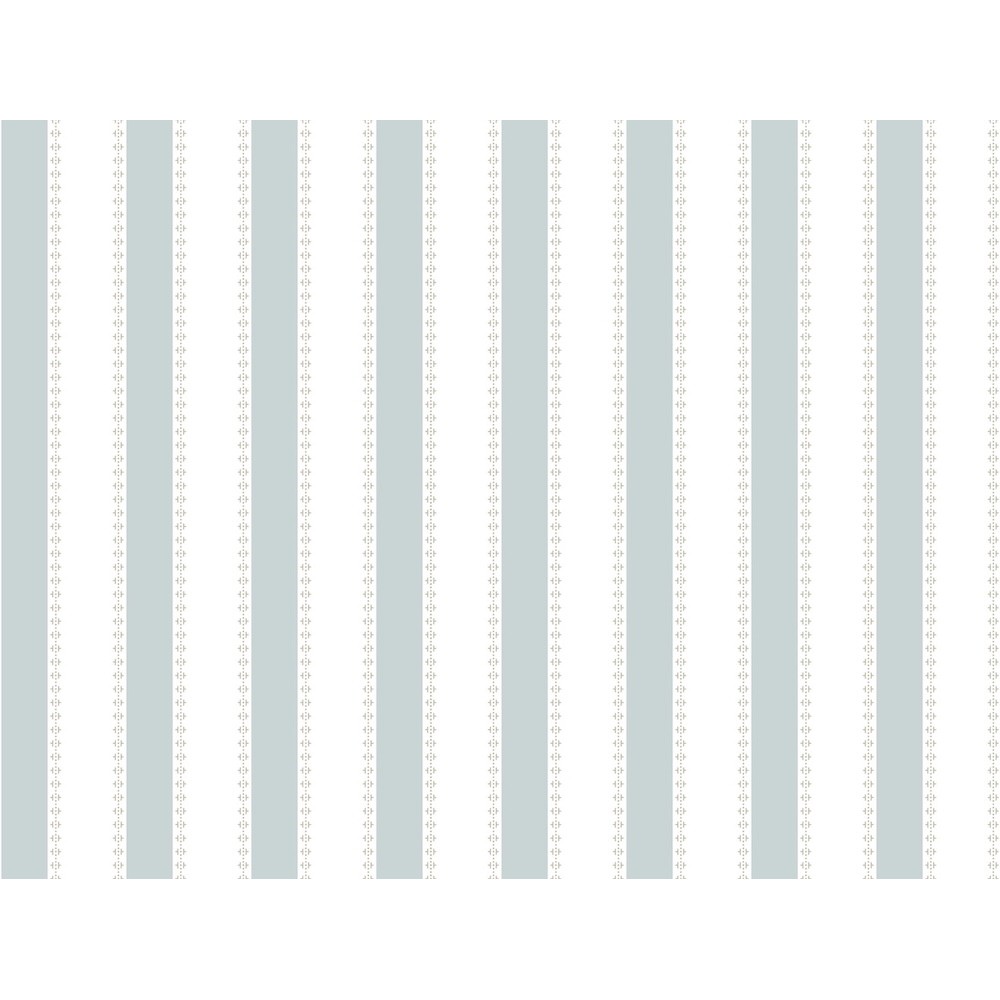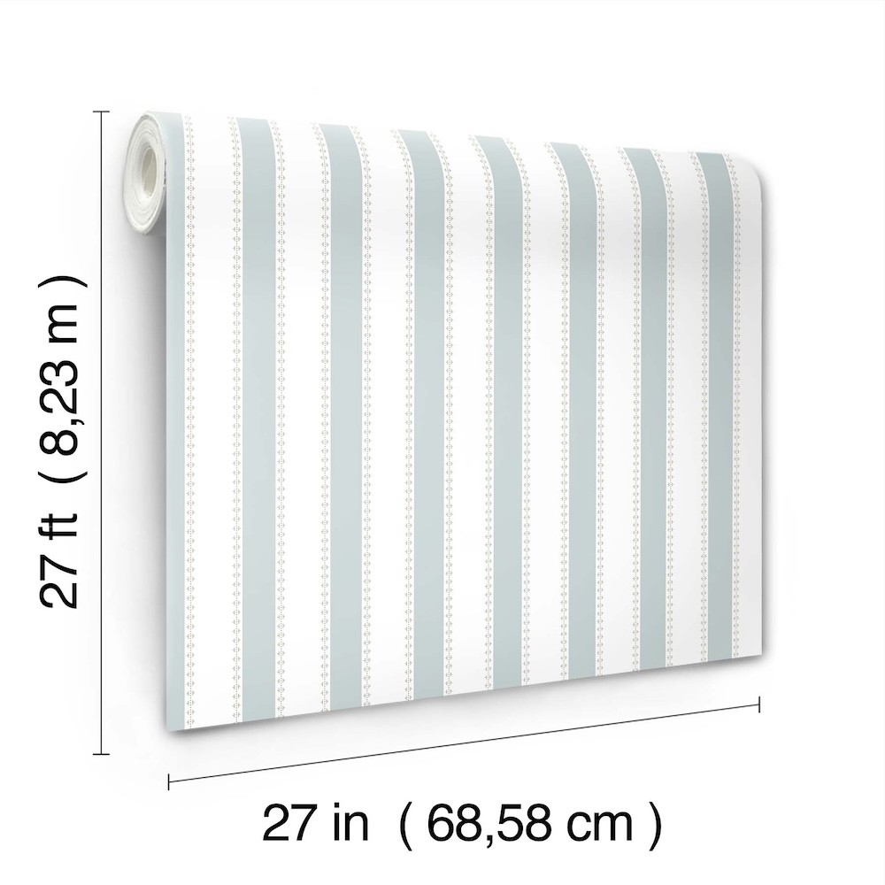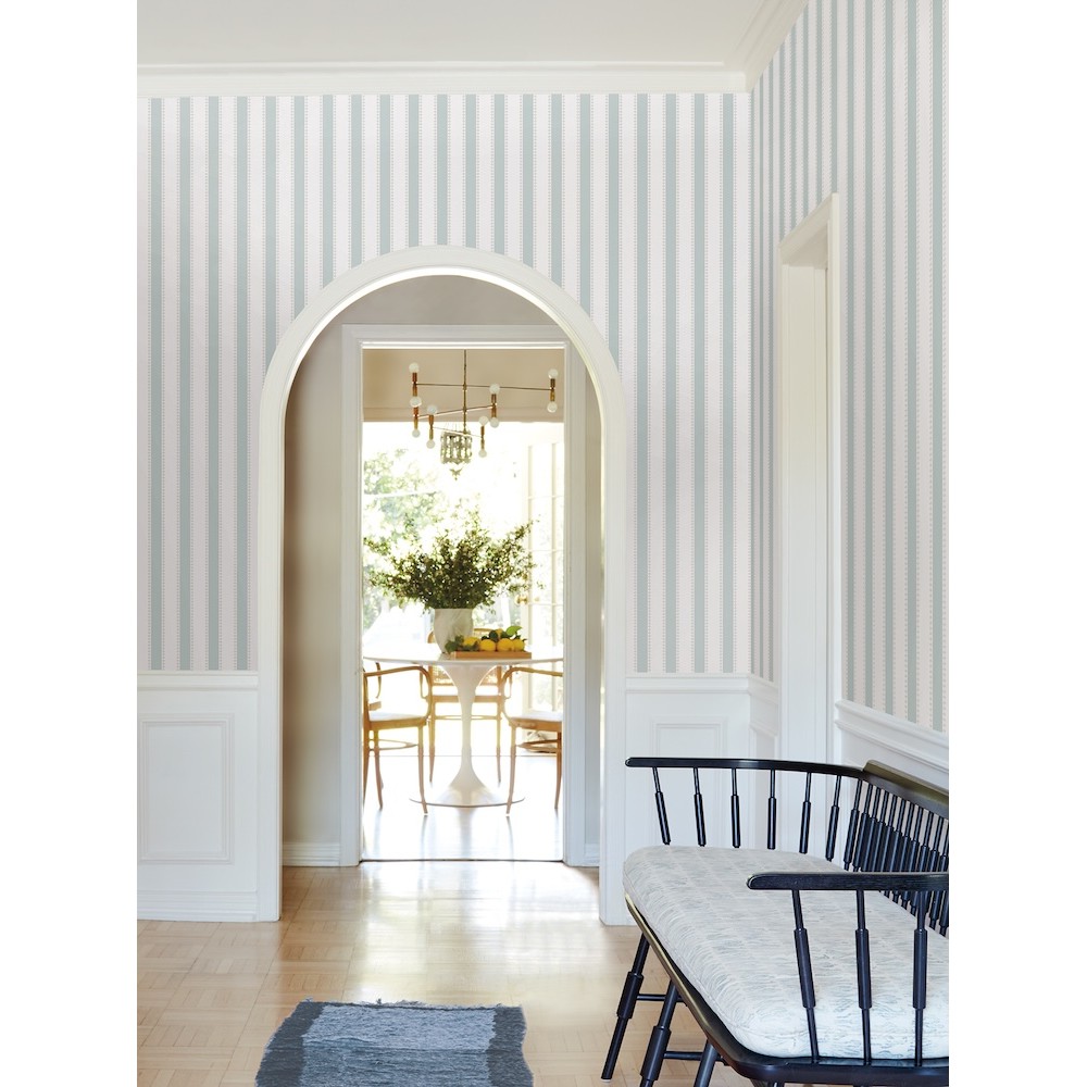 Pattern Tilford augments the timeless appeal of the awning stripe with simple, decorative stitched detailing. Featured here in pale blue and white with grey detailing. Tilford is an unpasted, non woven wallpaper measuring 27 inches wide by 27 feet long, covering approximately 60.8 square feet per roll.