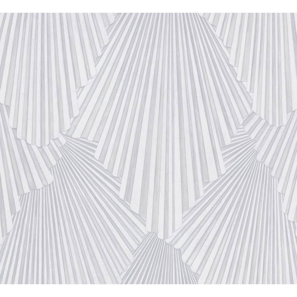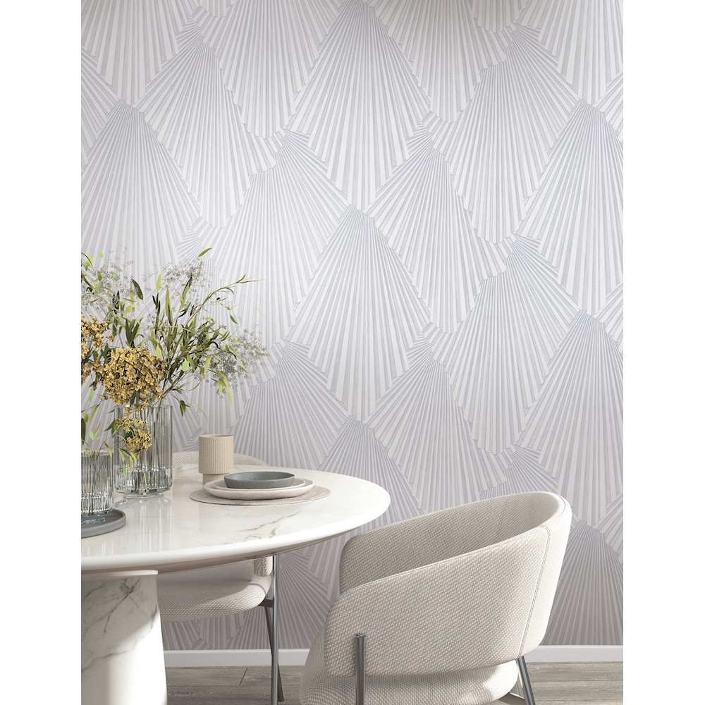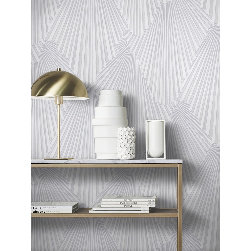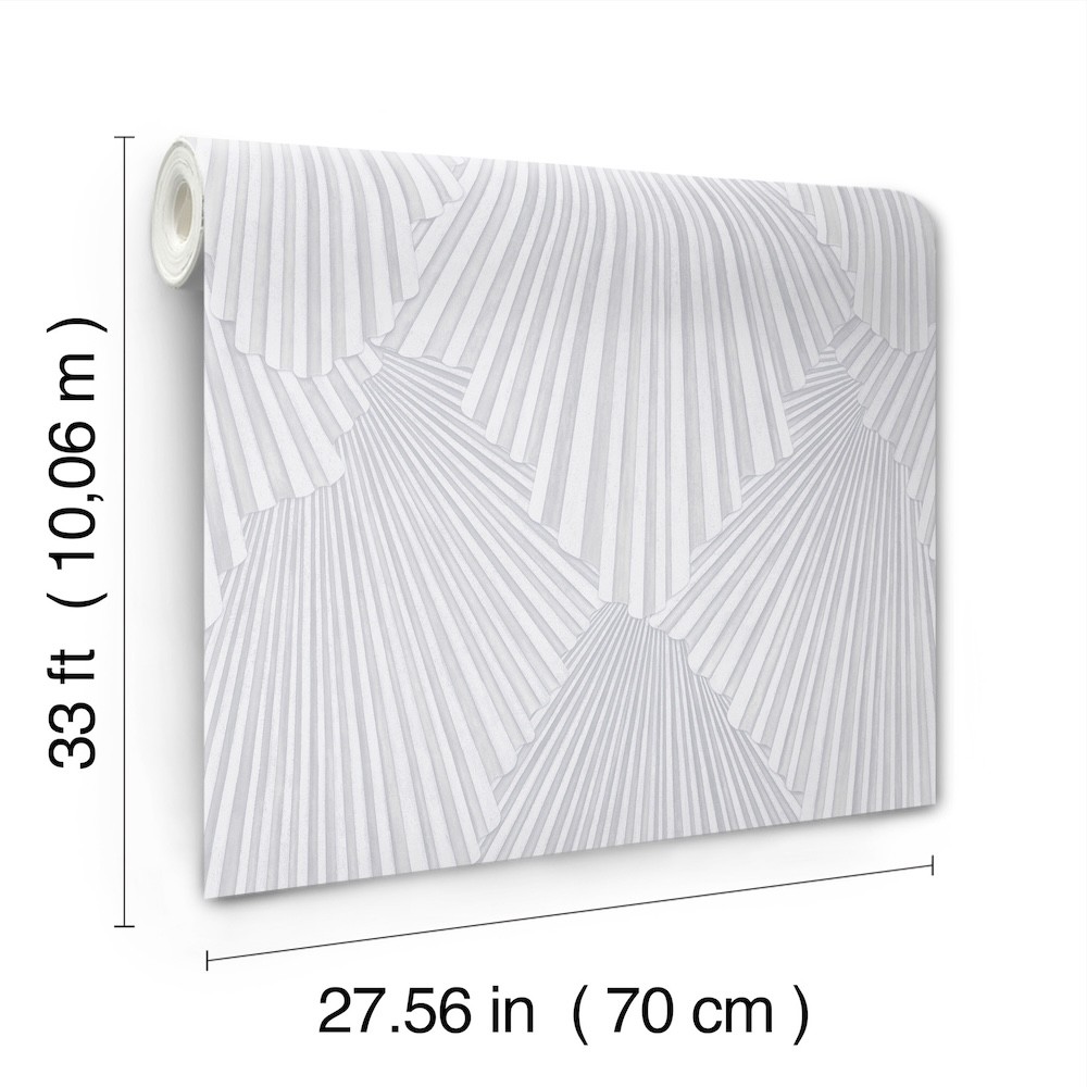 Scalloped, fanning forms overlap to create a chic damask pattern in Art Deco-inspired design Lumiere. Featured here in two-tone white and pewter. Lumiere is an unpasted, vinyl wallpaper measuring 27.6 inches wide by 33 feet long, covering approximately About 75.9 square feet square feet per roll.