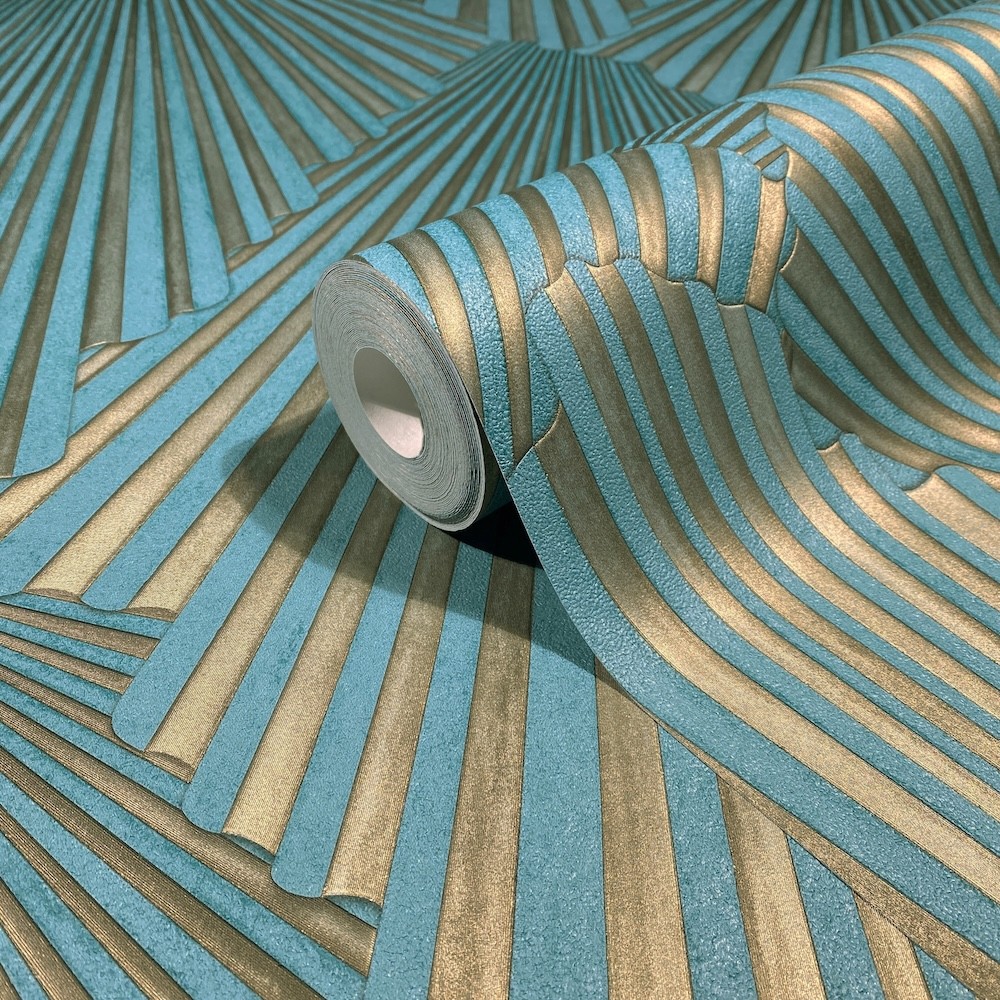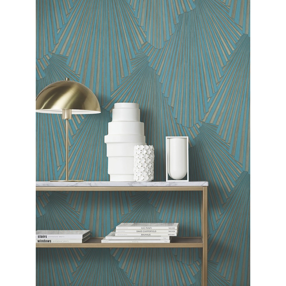 Scalloped, fanning forms overlap to create a chic damask pattern in Art Deco-inspired design Lumiere. Featured here in two-tone teal and oxidized bronze. Lumiere is an unpasted, vinyl wallpaper measuring 27.6 inches wide by 33 feet long, covering approximately About 75.9 square feet square feet per roll.