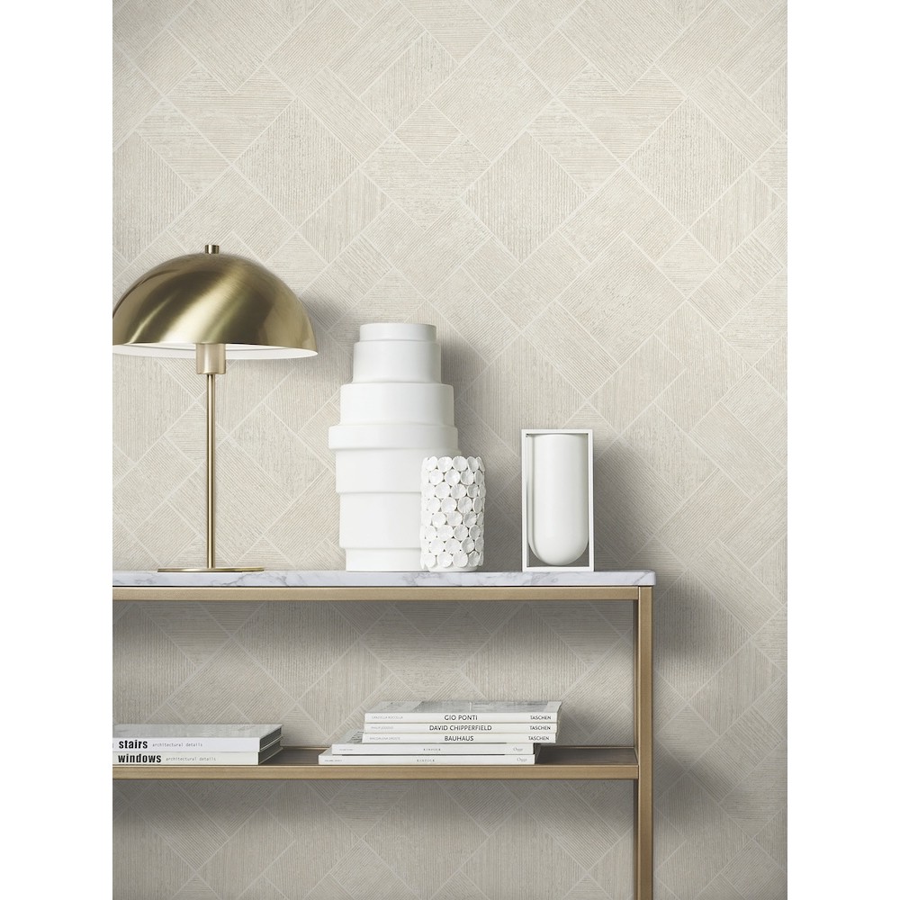 Pattern Marquetry mimics the look of tile, the diamond grid pattern embellished with insets and rectangular accents. Featured here in shades of beige and pearlescent white. Marquetry is an unpasted, vinyl wallpaper measuring 20.9 inches wide by 33 feet long, covering approximately About 57.5 square feet square feet per roll.