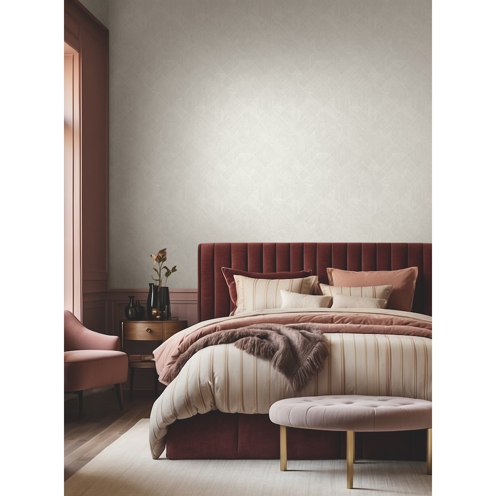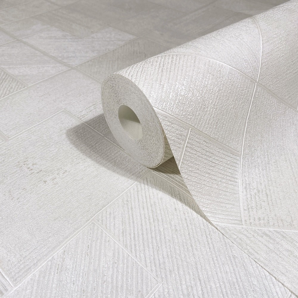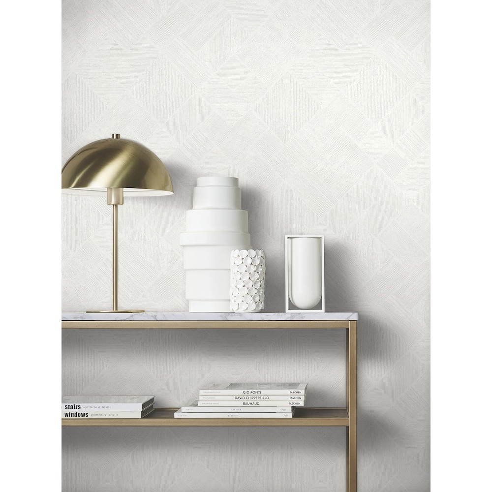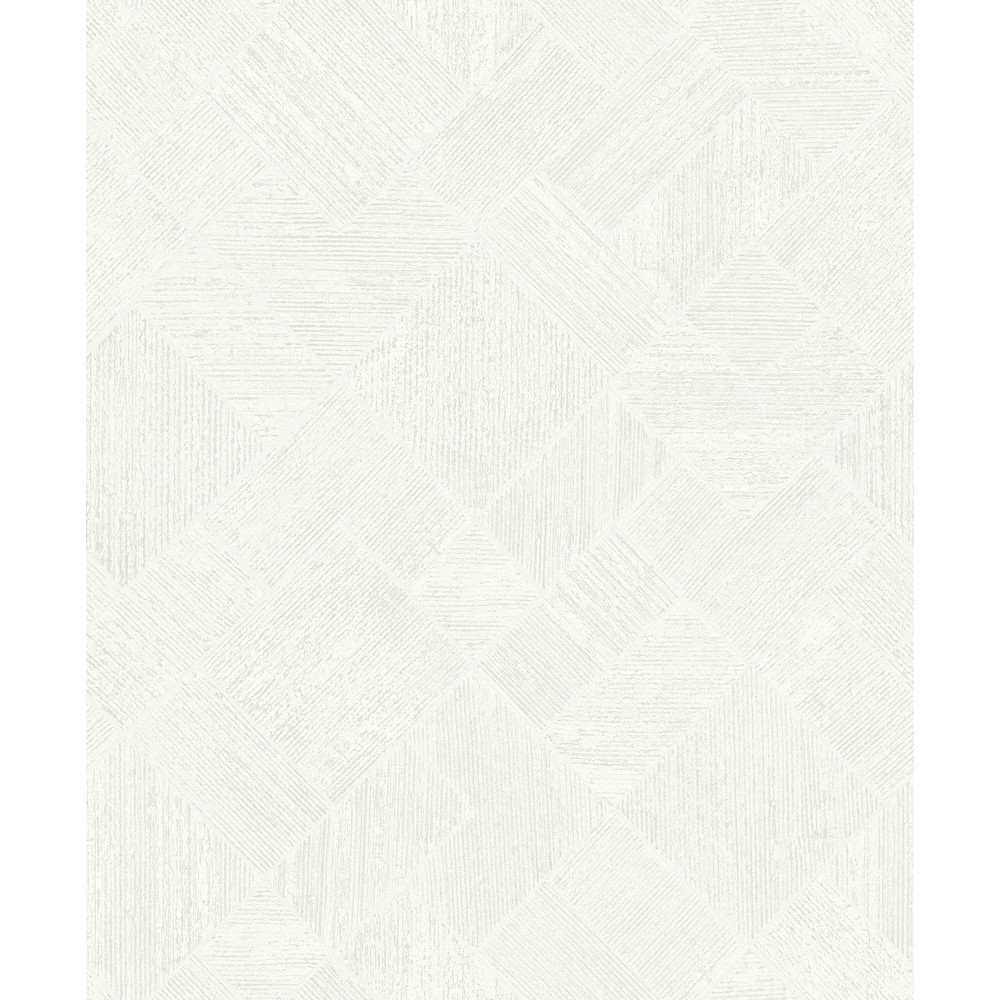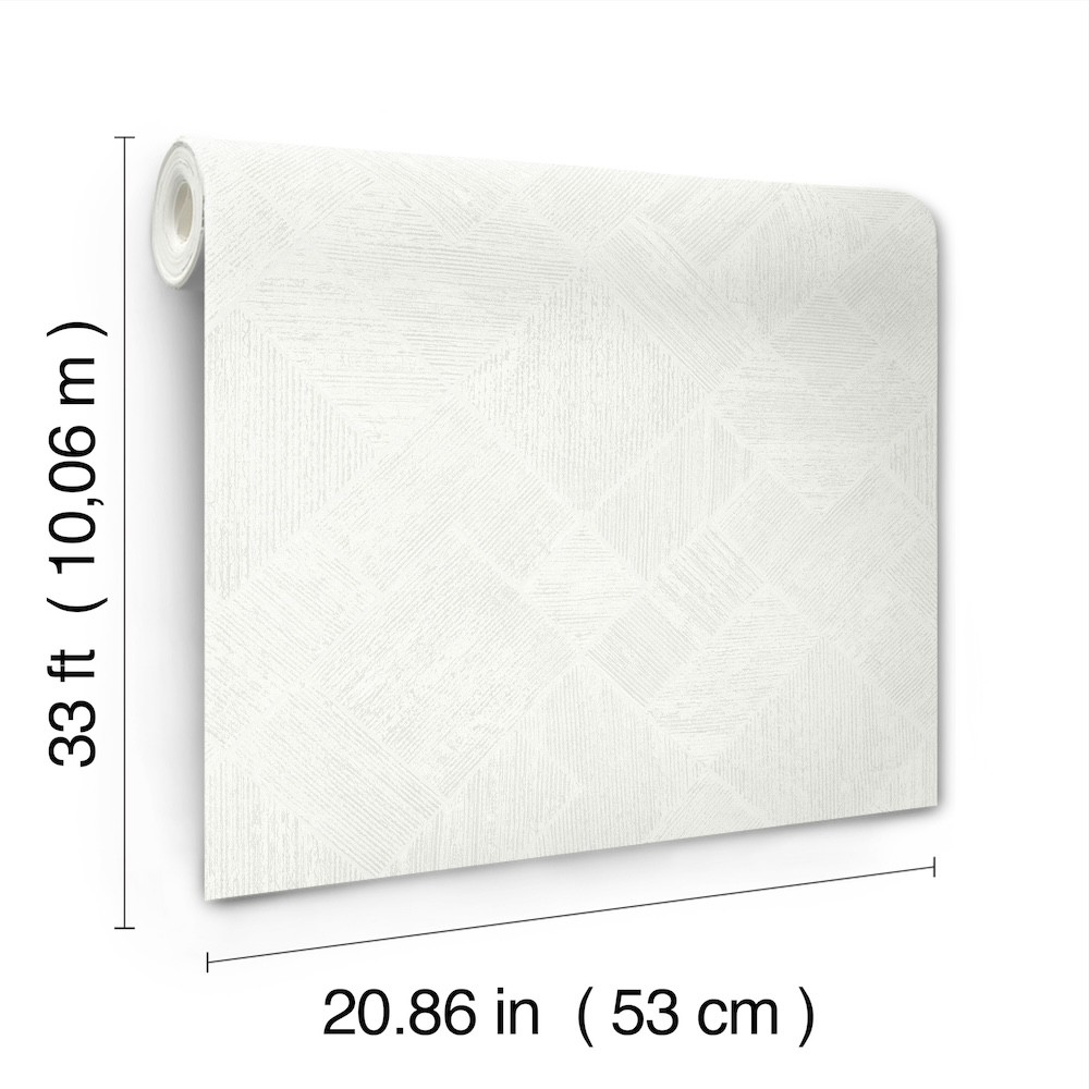 Pattern Marquetry mimics the look of tile, the diamond grid pattern embellished with insets and rectangular accents. Featured here in shades of white and palest grey. Marquetry is an unpasted, vinyl wallpaper measuring 20.9 inches wide by 33 feet long, covering approximately About 57.5 square feet square feet per roll.