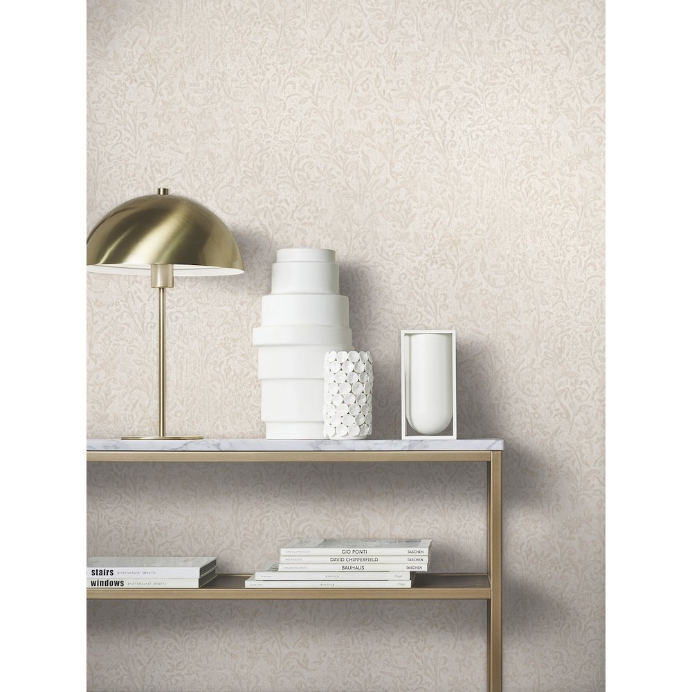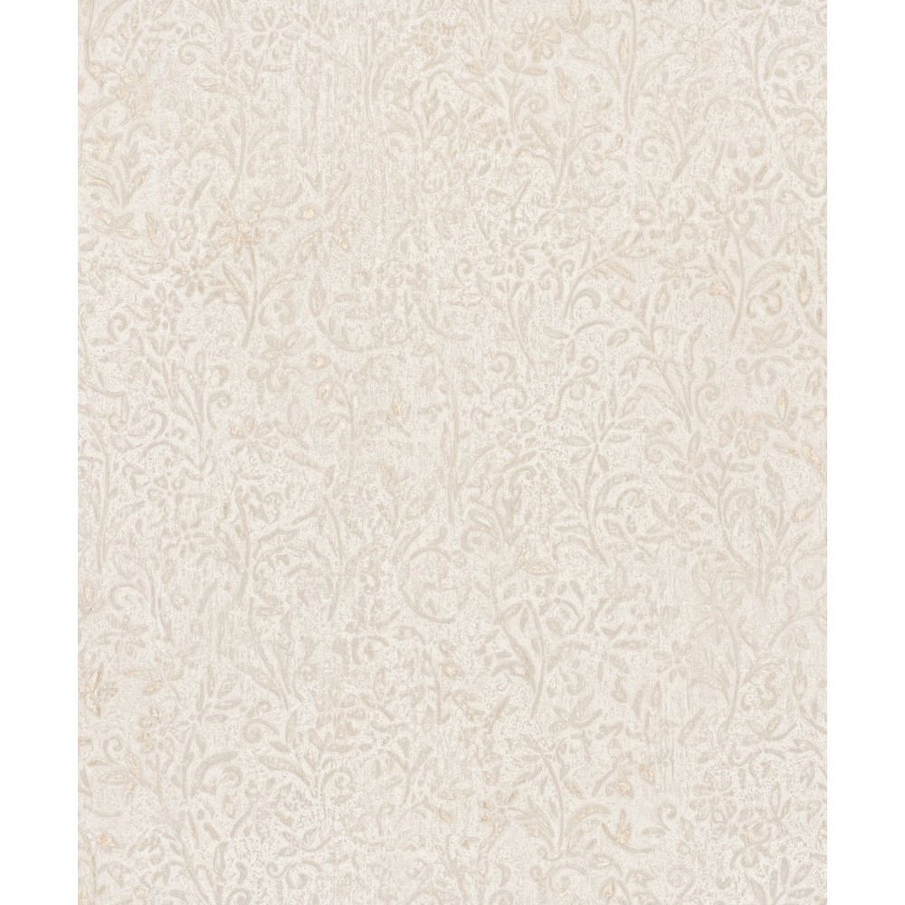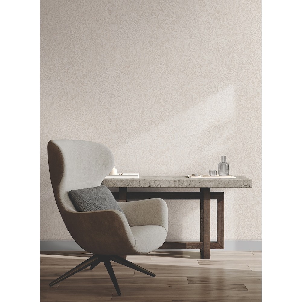 Sculpted Floral's carved filigree features delicate flowers and scrolled embellishments along a textured backdrop. Seen here with beige detailing along a cream background. Sculpted Floral is an unpasted, vinyl wallpaper measuring 20.9 inches wide by 33 feet long, covering approximately About 57.5 square feet square feet per roll.