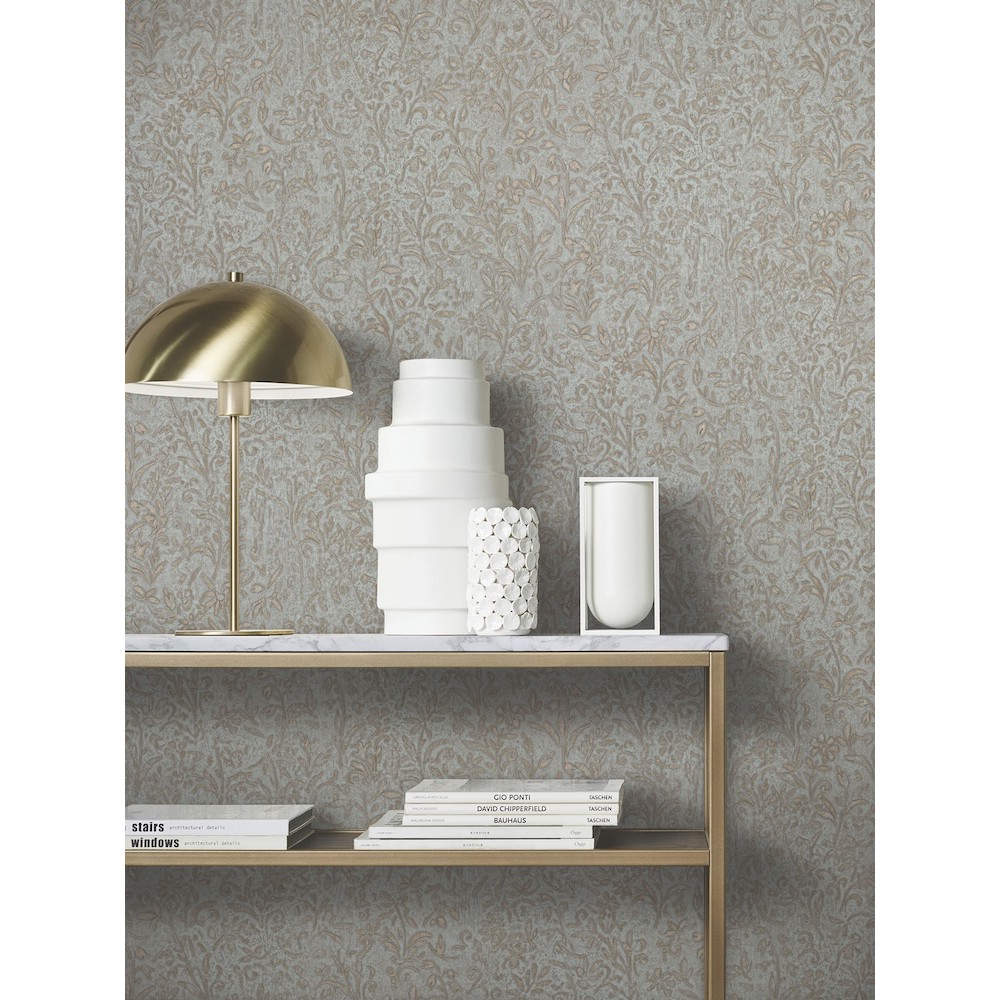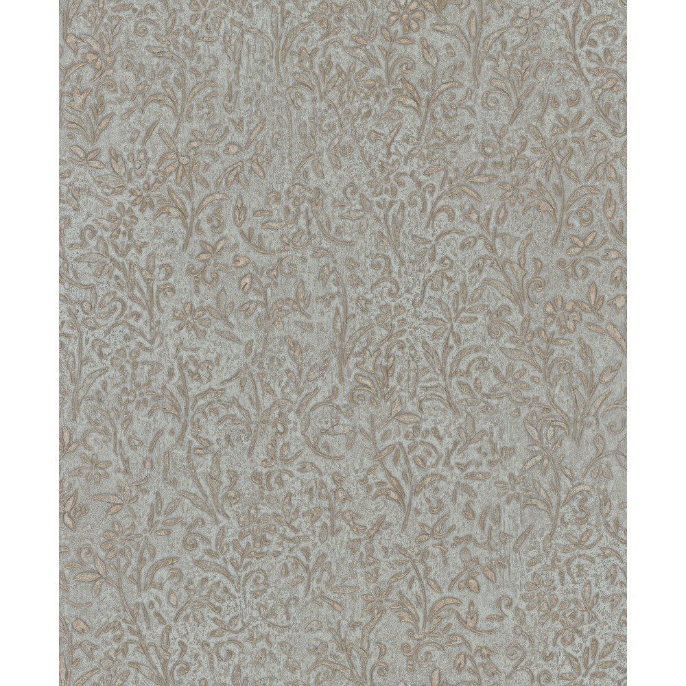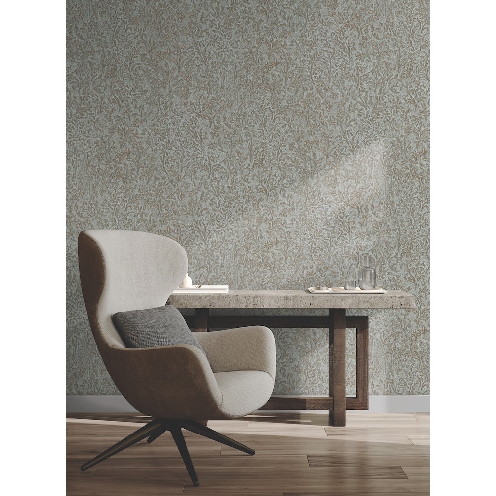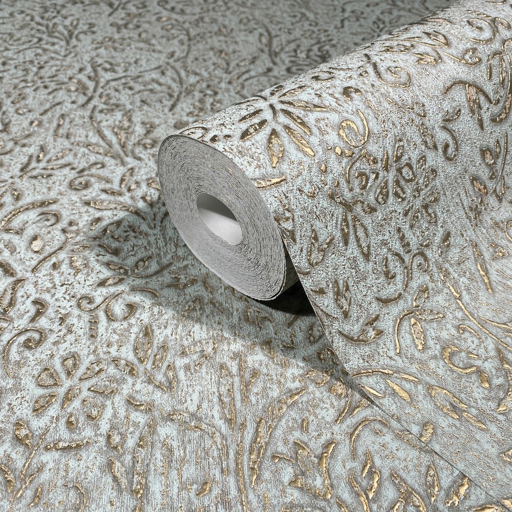Sculpted Floral's carved filigree features delicate flowers and scrolled embellishments along a textured backdrop. Seen here with antique gold detailing along a pale aqua background. Sculpted Floral is an unpasted, vinyl wallpaper measuring 20.9 inches wide by 33 feet long, covering approximately About 57.5 square feet square feet per roll.