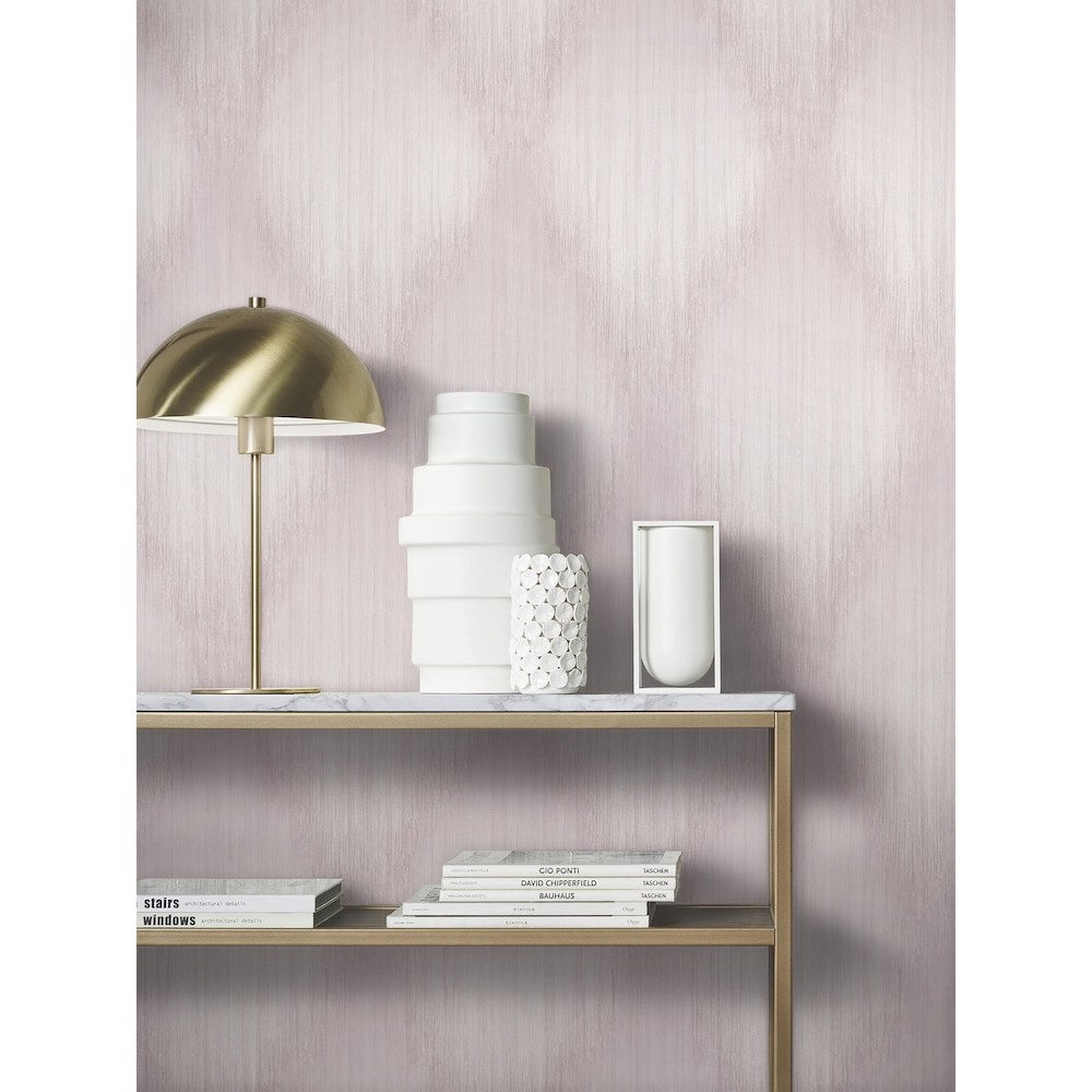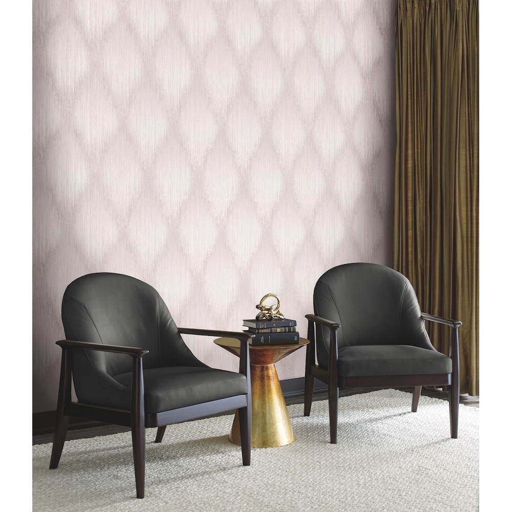The artistic drama of pattern Starfall's ikat stylings is elevated by metallic accents in this large-scale diamond damask wallpaper. Seen here in lilac, mauve, cream, and pearlescent white. Starfall is an unpasted, vinyl wallpaper measuring 27.6 inches wide by 33 feet long, covering approximately About 75.9 square feet square feet per roll.