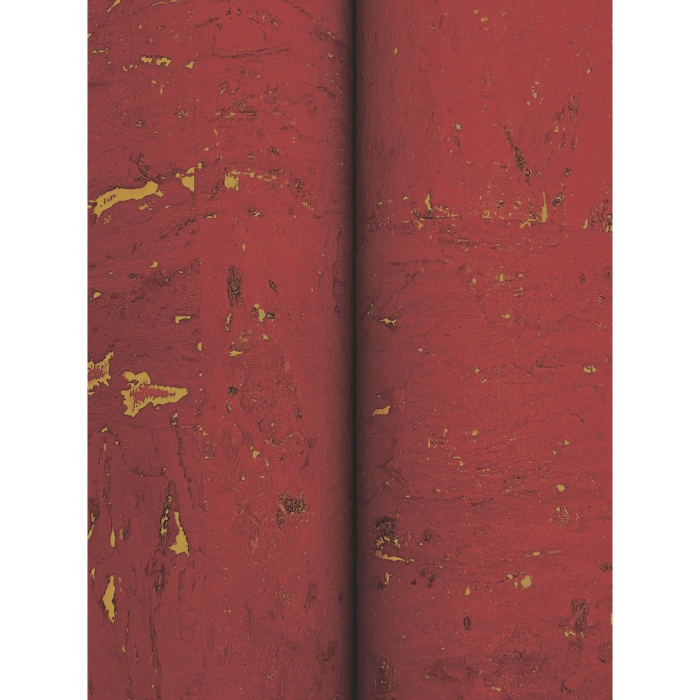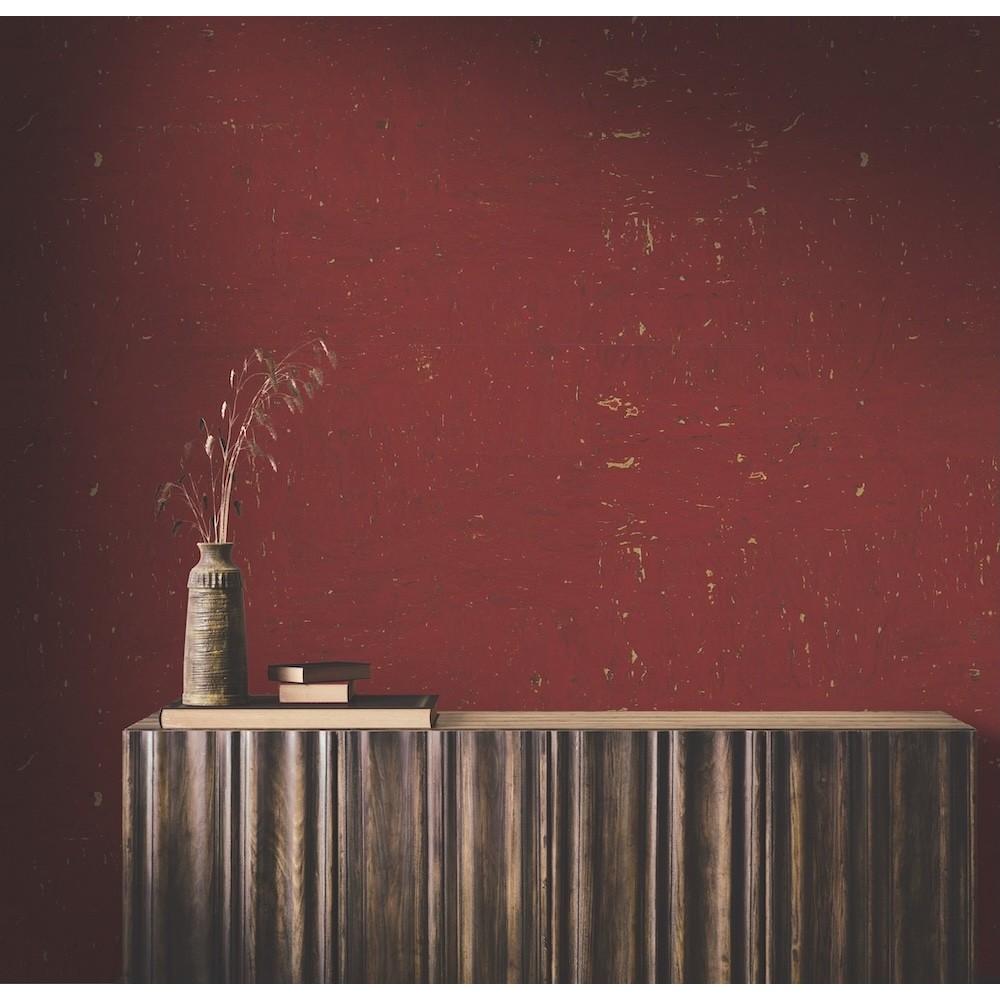 The famous cork oak forests of Europe and Africa provide the finest sustainable Caldera Cork for glamorous wall installations. Seen here in crimson accented by gold metallics. Caldera Cork is an unpasted, cork wallpaper measuring 36 inches wide by 24 feet long, covering approximately 72 square feet per roll.