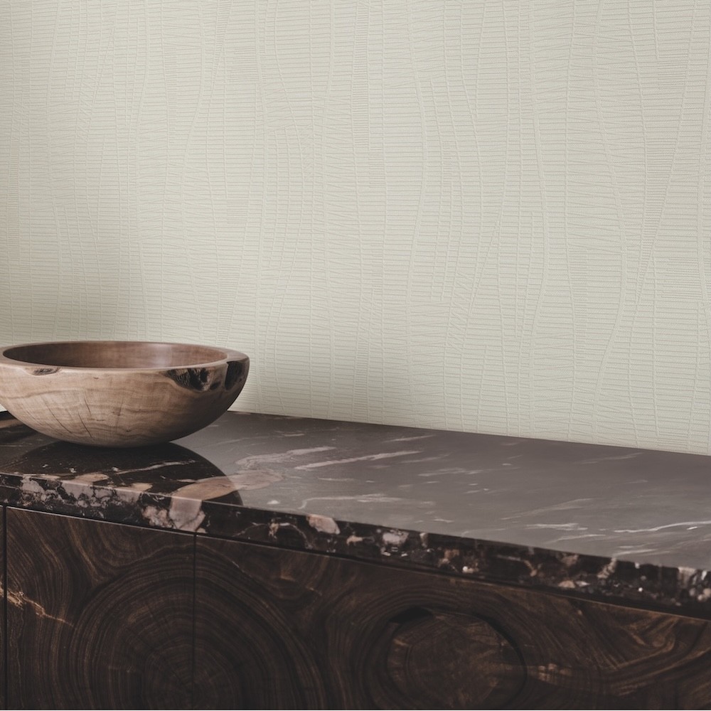 Embossed and curving crosshatching adds texture and modern intrigue to pattern Amir. Featured here in grey.